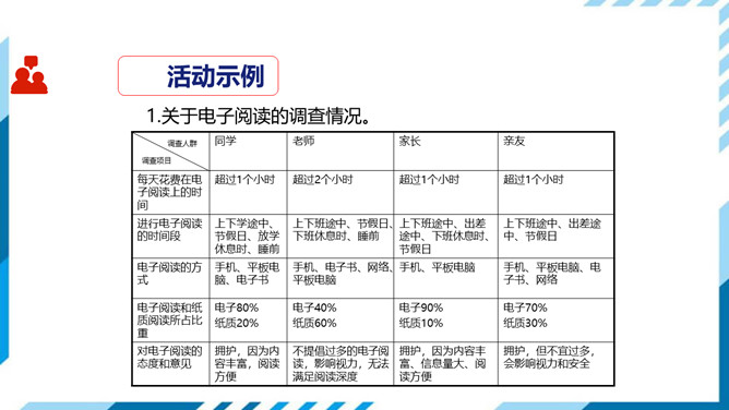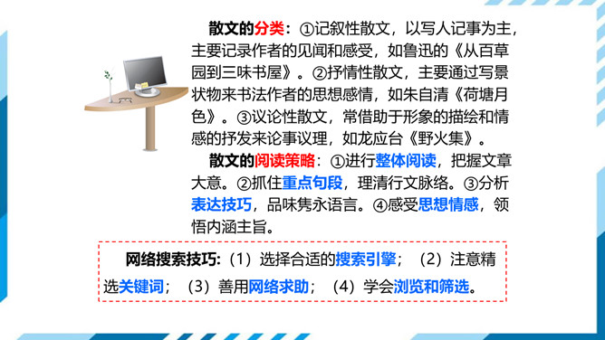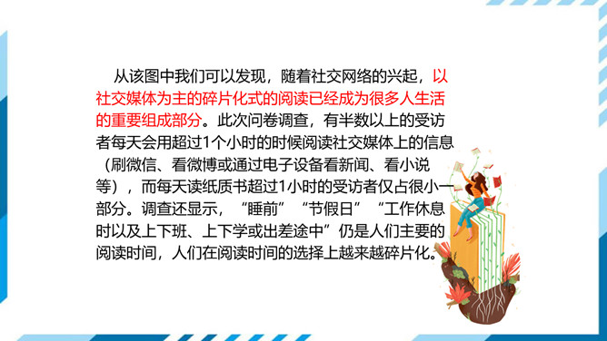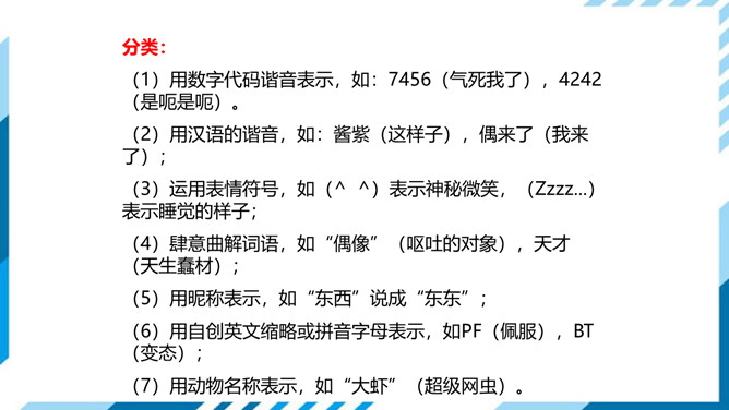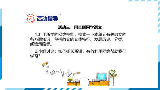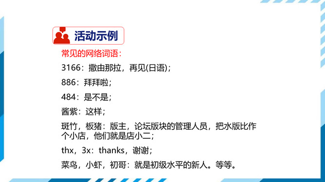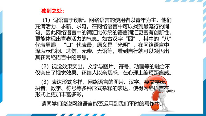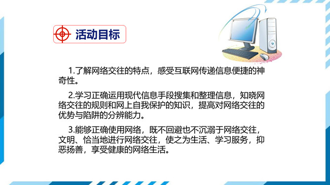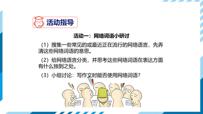 1.了解网络交往的特点,感受互联网传递信息便捷的神奇性。2.学习正确运用现代信息手段搜集和整理信息,知晓网络交往的规则和网上自我保护的知识,提高对网络交往的优势与陷阱的分辨能力。3.能够正确使用网络,既不回避也不沉溺于网络交往,文明、恰当地进行网络交往,使之为生活、学习服务,抑恶扬善,享受健康的网络生活。搜集一些常见的或最近正在流行的网络语言,先弄清这些网络词语的意思。给网络语言分类,并思考这些网络词语在表达方面有什么独到之处。小组讨论:写作文时能否使用网络词语?所属专题:我们的互联网时代ppt。