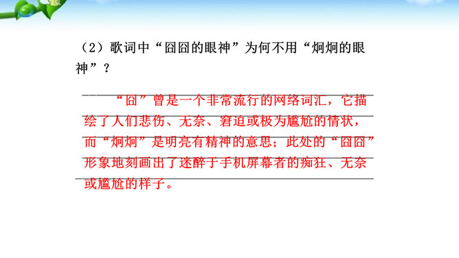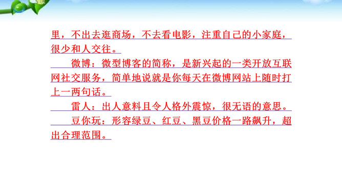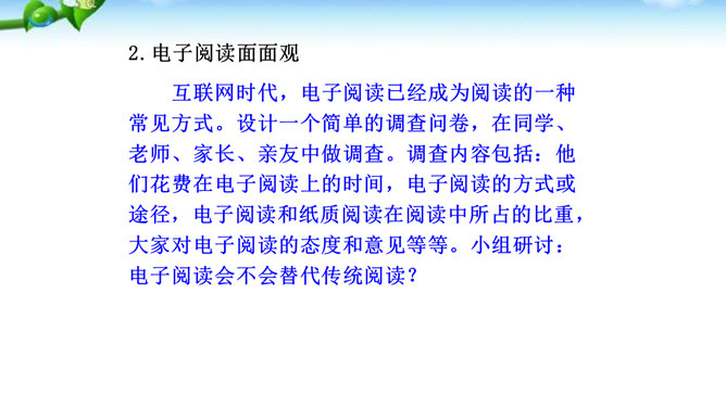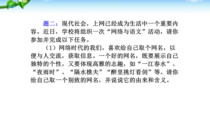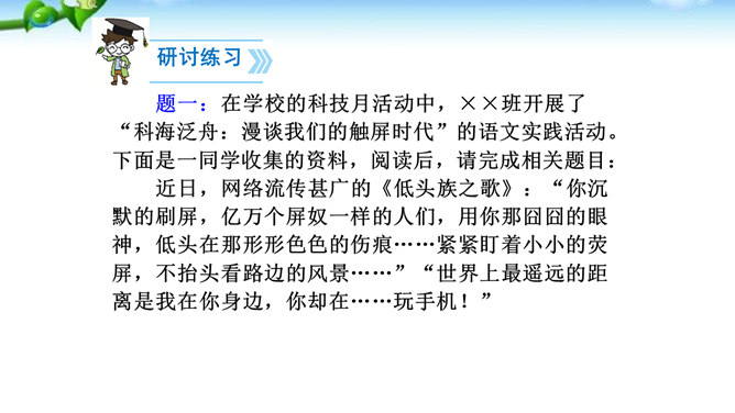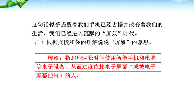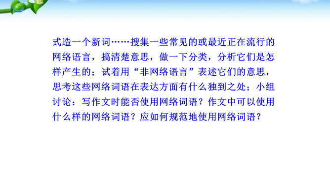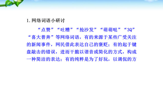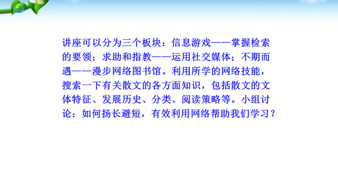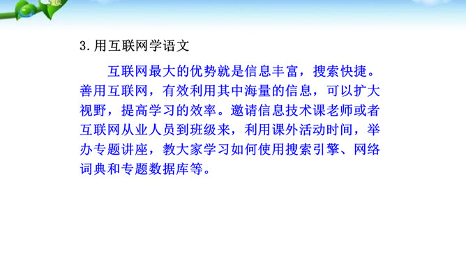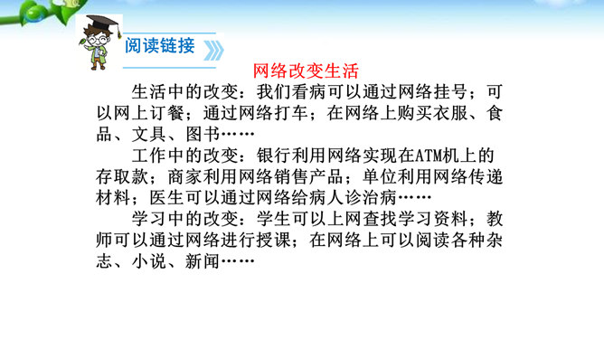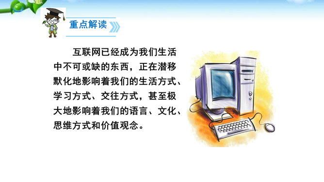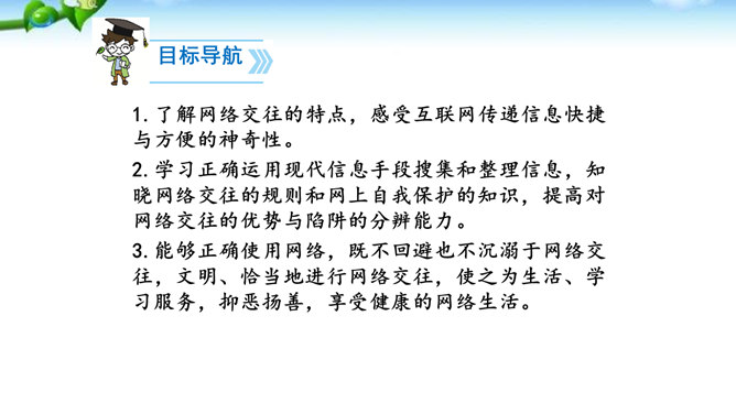 1.了解网络交往的特点,感受互联网传递信息快捷与方便的神奇性。2.学习正确运用现代信息手段搜集和整理信息,知晓网络交往的规则和网上自我保护的知识,提高对网络交往的优势与陷阱的分辨能力。3.能够正确使用网络,既不回避也不沉溺于网络交往,文明、恰当地进行网络交往,使之为生活、学习服务,抑恶扬善,享受健康的网络生活。互联网已经成为我们生活中不可或缺的东西,正在潜移默化地影响着我们的生活方式、学习方式、交往方式,甚至极大地影响着我们的语言、文化、思维方式和价值观念。所属专题:我们的互联网时代ppt。