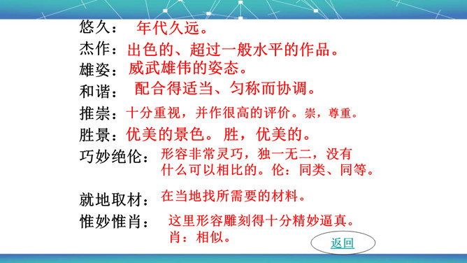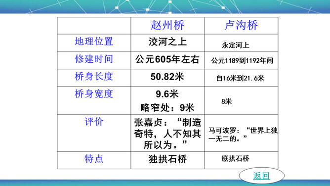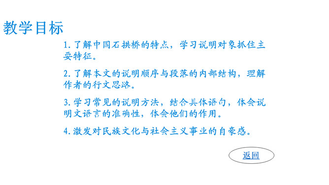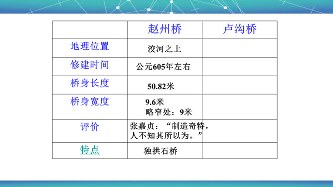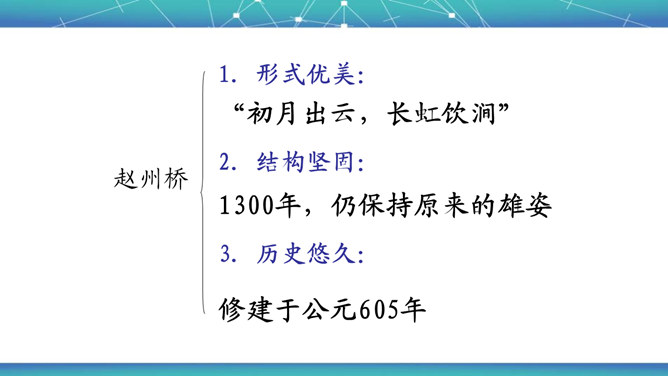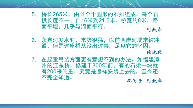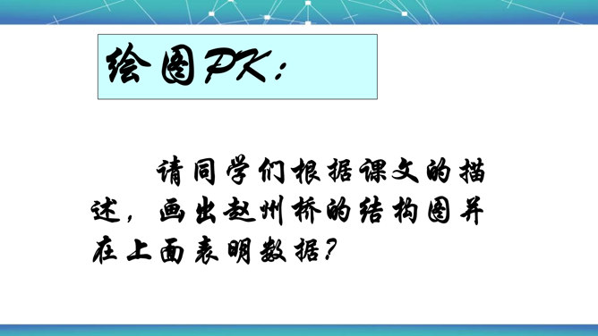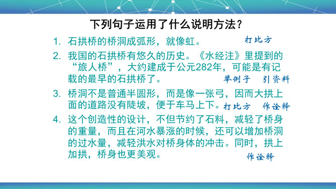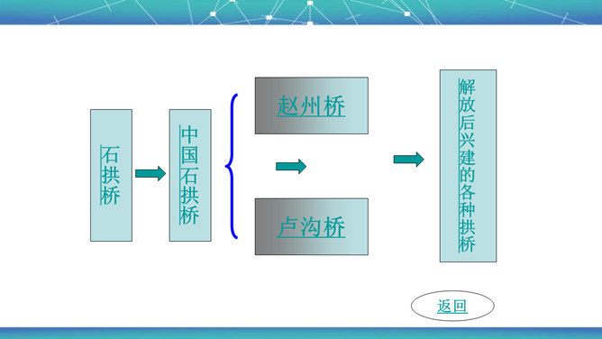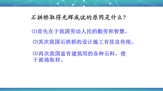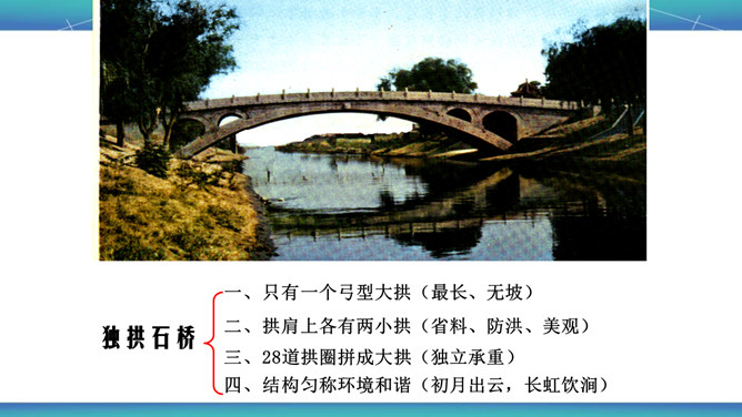 石拱桥取得光辉成就的原因是什么?⑴首先在于我国劳动人民的勤劳和智慧。⑵其次我国石拱桥的设计施工有优良传统。⑶再次我国富有建筑用的各种石料,便于就地取材。古代神话里说,雨后彩虹是“人间天上的桥”,通过彩虹就能上天。我国的诗人爱把拱桥比作虹,说拱桥是“卧虹”“飞虹”,把水上拱桥形容为“长虹卧波”。开头把石拱桥的桥洞比作虹,起什么作用? 1、生动形象地说明其形状,2、突出其形式优美的特点。“比较”表现石拱桥在世界桥梁史上出现不是“最早”也不是“很迟”,准确地说明出现的程度。所属专题:中国石拱桥ppt。