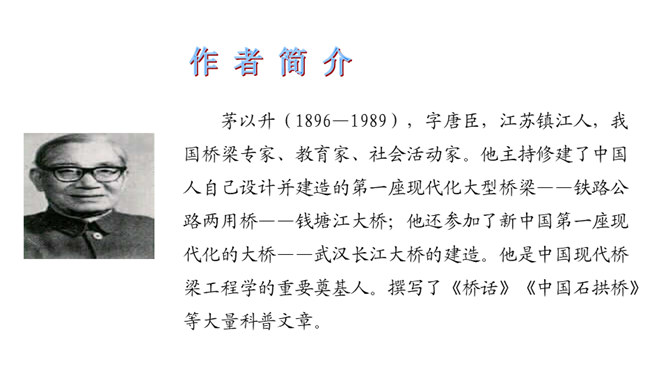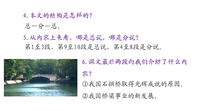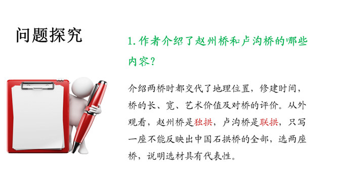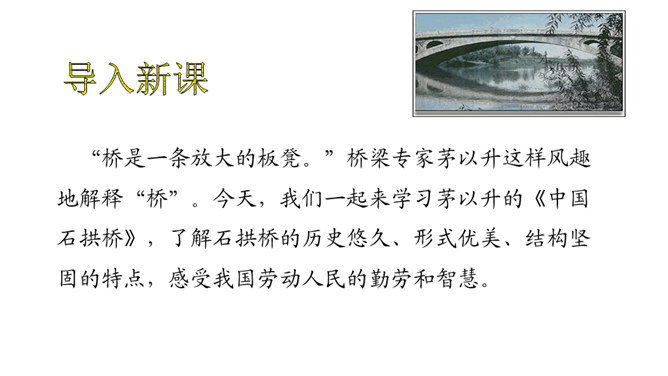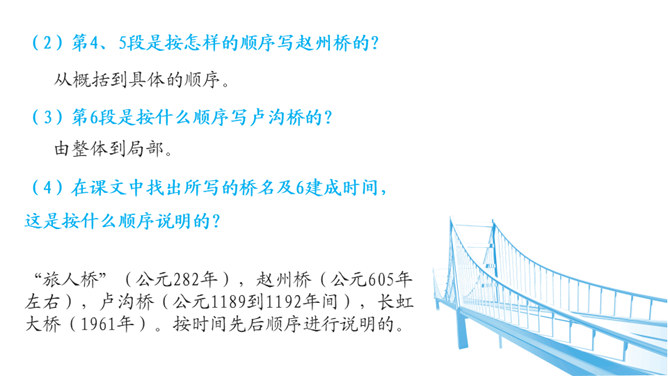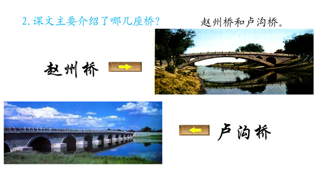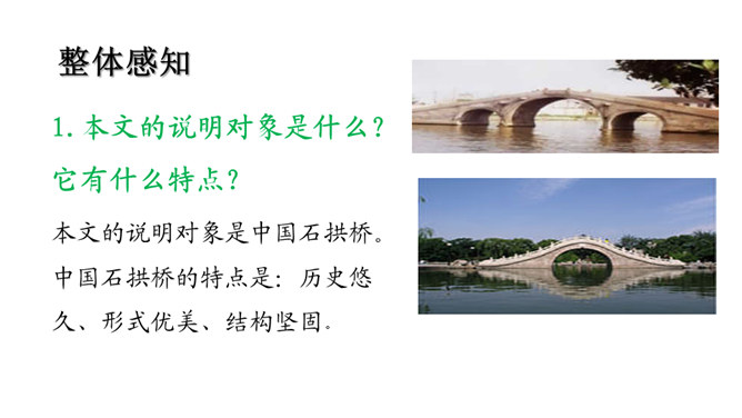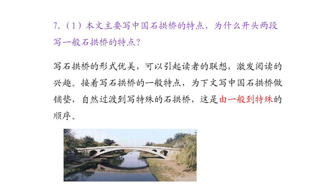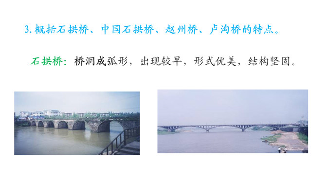 本文主要写中国石拱桥的特点,为什么开头两段写一般石拱桥的特点?写石拱桥的形式优美,可以引起读者的联想,激发阅读的兴趣。接着写石拱桥的一般特点,为下文写中国石拱桥做铺垫,自然过渡到写特殊的石拱桥,这是由一般到特殊的顺序。作者介绍了赵州桥和卢沟桥的哪些内容?介绍两桥时都交代了地理位置,修建时间,桥的长、宽、艺术价值及对桥的评价。从外观看,赵州桥是独拱,卢沟桥是联拱,只写一座不能反映出中国石拱桥的全部,选两座桥,说明选材具有代表性。所属专题:中国石拱桥ppt。