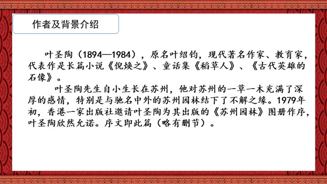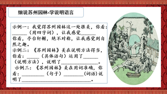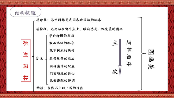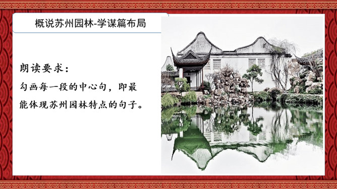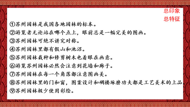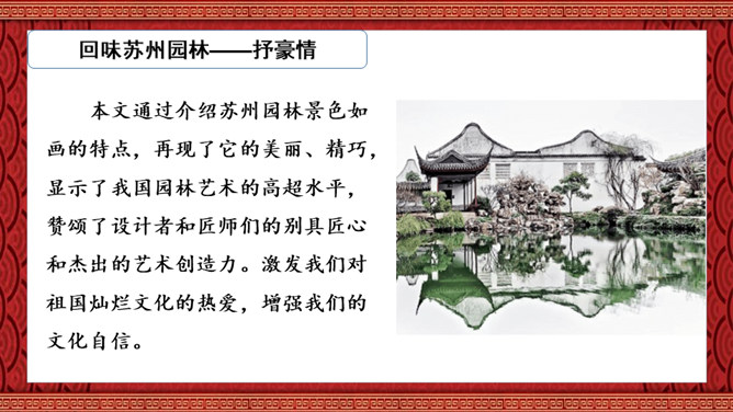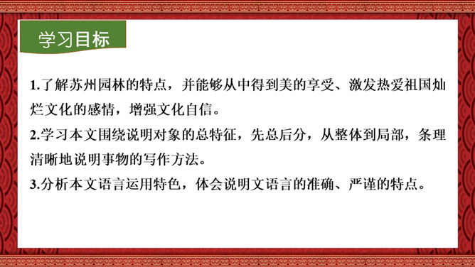 1.了解苏州园林的特点,并能够从中得到美的享受、激发热爱祖国灿烂文化的感情,增强文化自信。2.学习本文围绕说明对象的总特征,先总后分,从整体到局部,条理清晰地说明事物的写作方法。3.分析本文语言运用特色,体会说明文语言的准确、严谨的特点。本文通过介绍苏州园林景色如画的特点,再现了它的美丽、精巧,显示了我国园林艺术的高超水平,赞颂了设计者和匠师们的别具匠心和杰出的艺术创造力。激发我们对祖国灿烂文化的热爱,增强我们的文化自信。所属专题:苏州园林ppt。