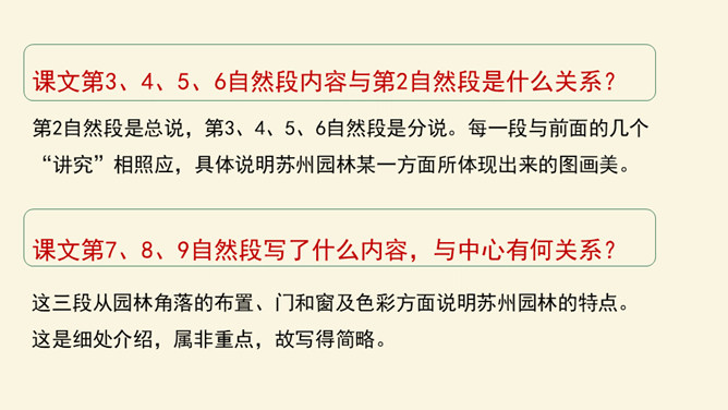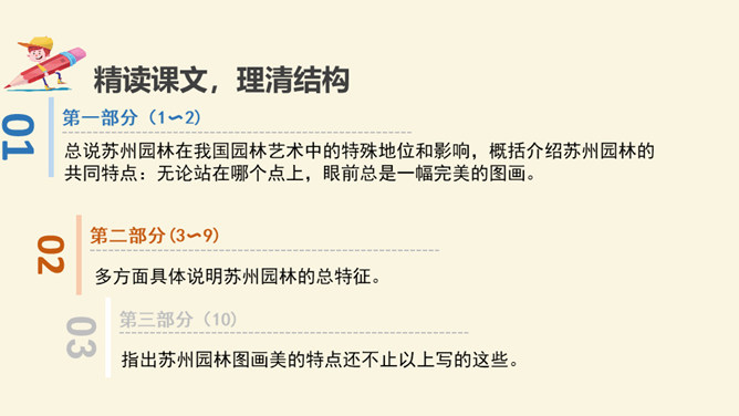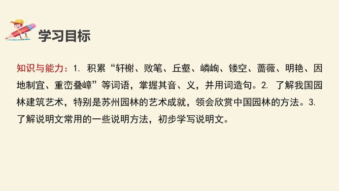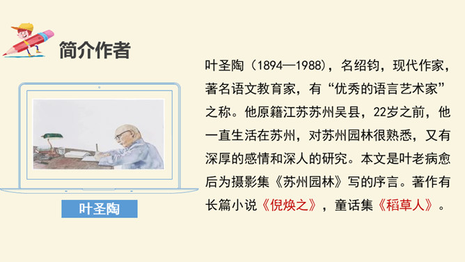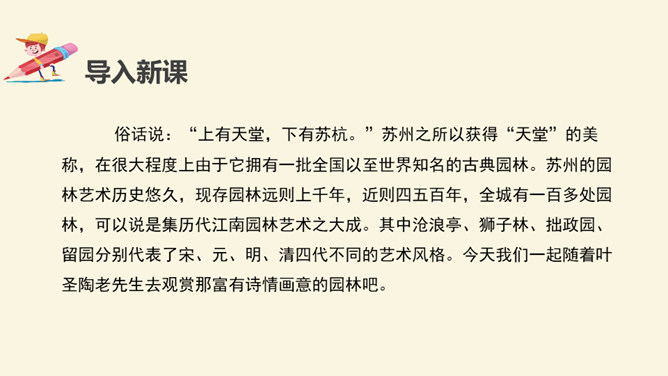 俗话说:“上有天堂,下有苏杭。”苏州之所以获得“天堂”的美称,在很大程度上由于它拥有一批全国以至世界知名的古典园林。苏州的园林艺术历史悠久,现存园林远则上千年,近则四五百年,全城有一百多处园林,可以说是集历代江南园林艺术之大成。其中沧浪亭、狮子林、拙政园、留园分别代表了宋、元、明、清四代不同的艺术风格。今天我们一起随着叶圣陶老先生去观赏那富有诗情画意的园林吧。所属专题:苏州园林ppt。