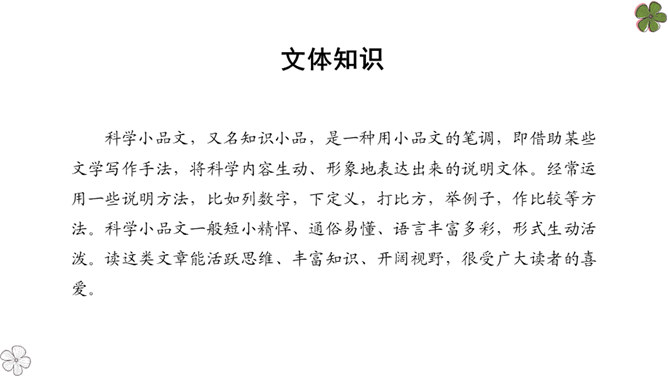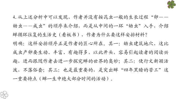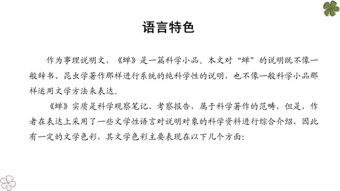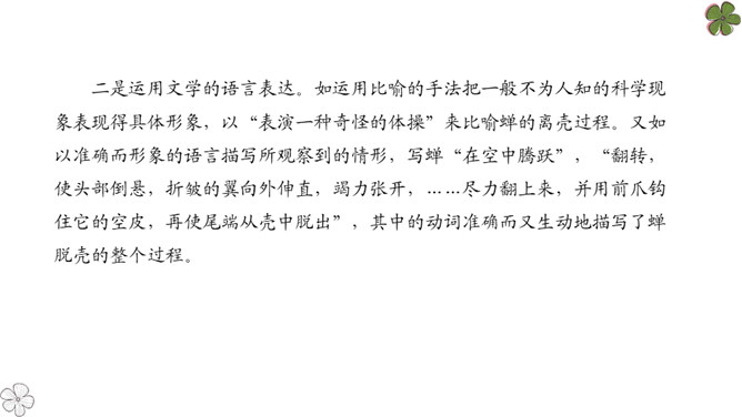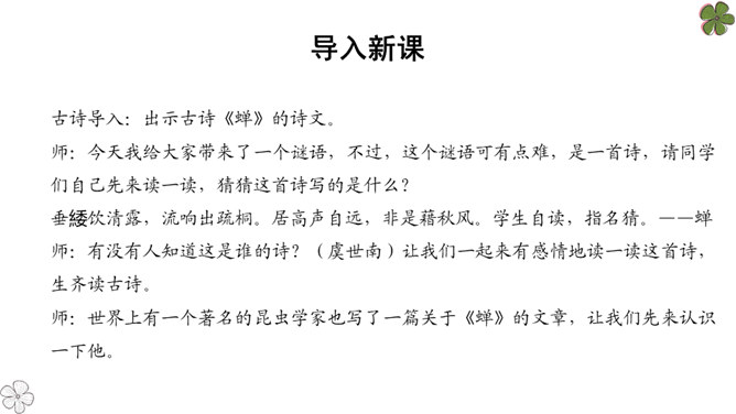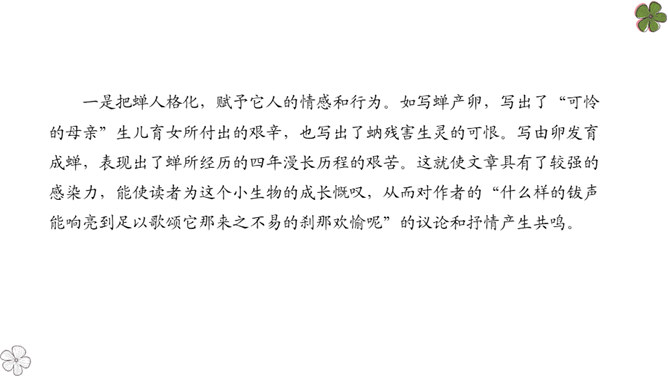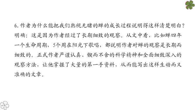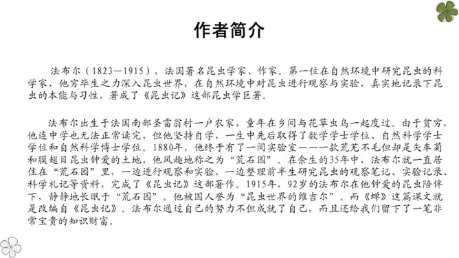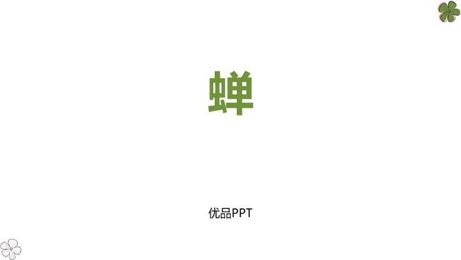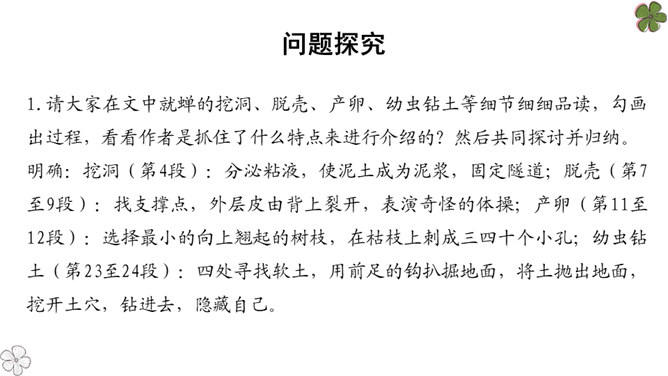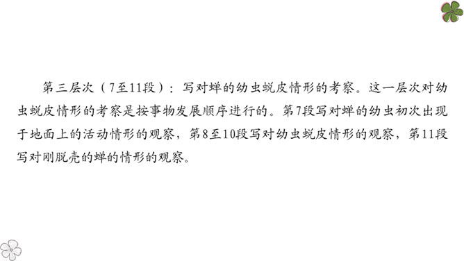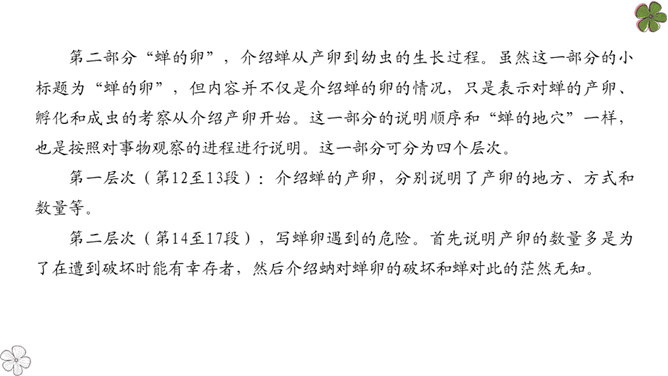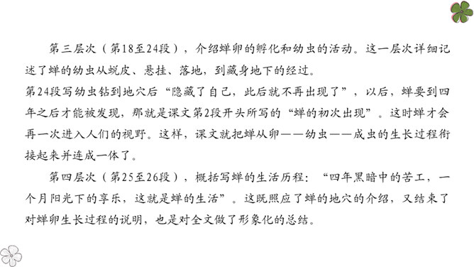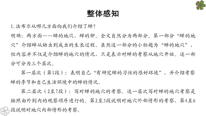 法布尔从哪几方面向我们介绍了蝉?明确:两方面——蝉的地穴、蝉的卵。全文自然分为两部分。第一部分“蝉的地穴”介绍蝉从幼虫到成虫的生长过程。虽然这一部分的小标题为“蝉的地穴”,但内容并不仅是介绍蝉的地穴的情况,只是表示对蝉的考察从地穴开始。这一部分可分为三个层次。请大家在文中就蝉的挖洞、脱壳、产卵、幼虫钻土等细节细细品读,勾画出过程,看看作者是抓住了什么特点来进行介绍的?然后共同探讨并归纳。所属专题:蝉ppt。