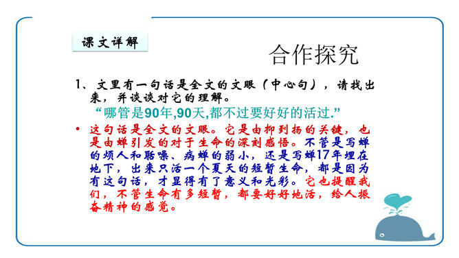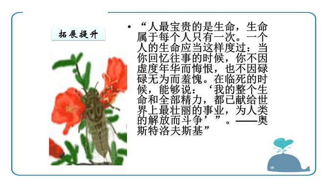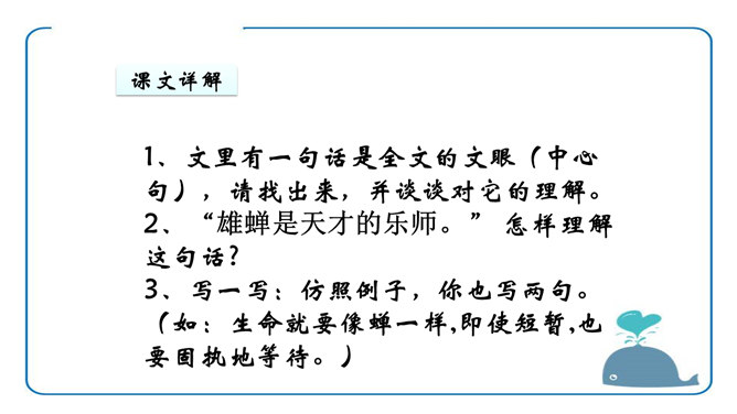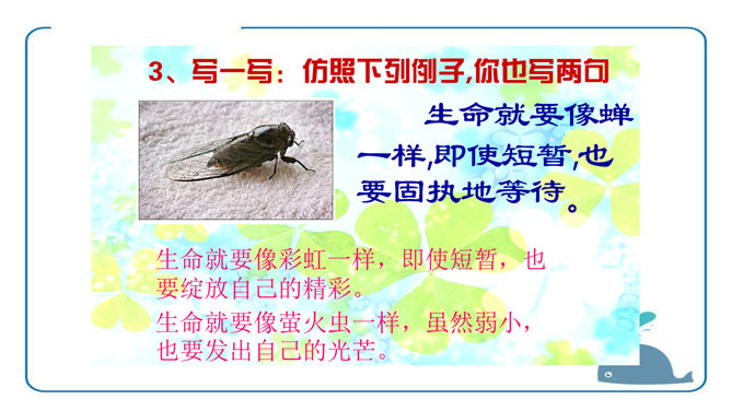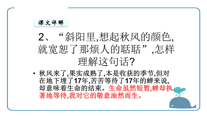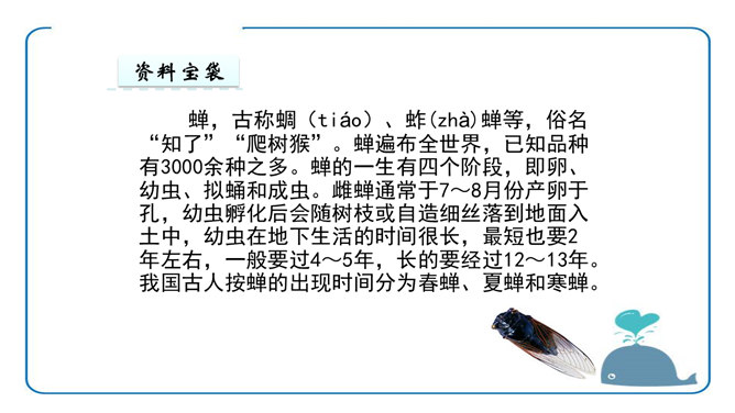 作者由一只小小的蝉引发了对生命的感悟,通过对细小聒噪的蝉因为一个夏天而付出17年代价的了解,进而联想到人类的生活历程,提示人们:不管生命短暂还是长久,都应积极面对,好好地生活。科普文章把已有科学知识、科学方法及融于其科学思想和精神,通过文字方式表达出来,使之读者所能理解的文章。科普文章往往有着宏观叙事风格,即科学发展宏观脉络基础告知读者科学界主流观点 。文章描写了蝉响彻一个夏天,令作者心烦,但听了朋友叙述后,对其产生了由衷的敬意,懂得了要珍爱生命好好活着的道理。所属专题:蝉ppt。