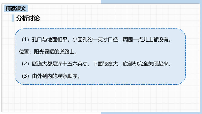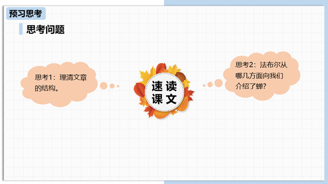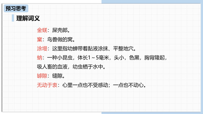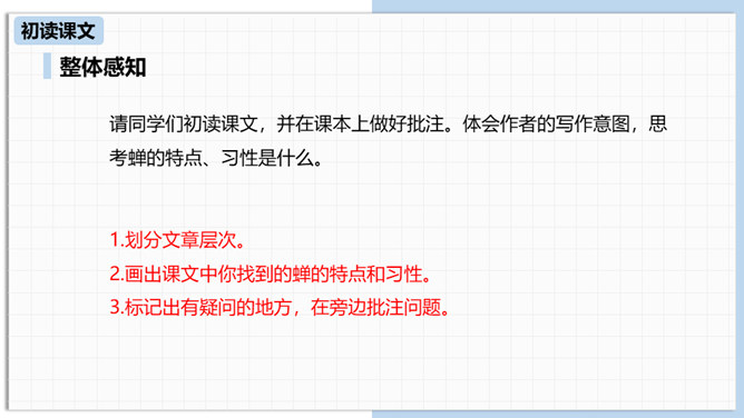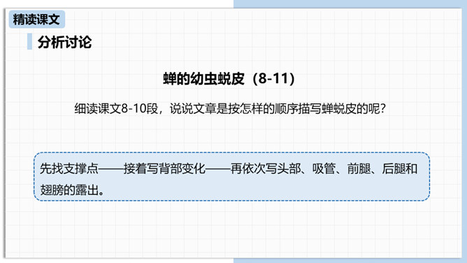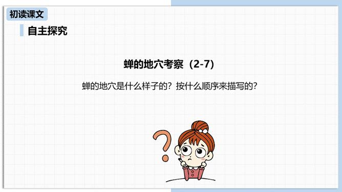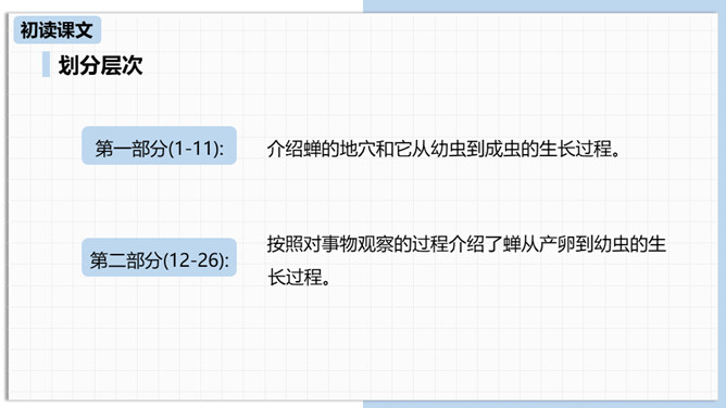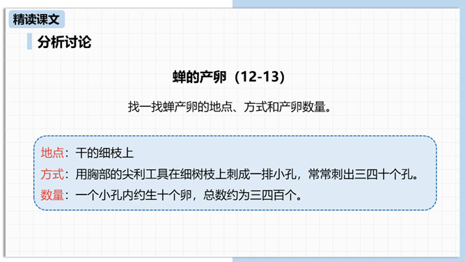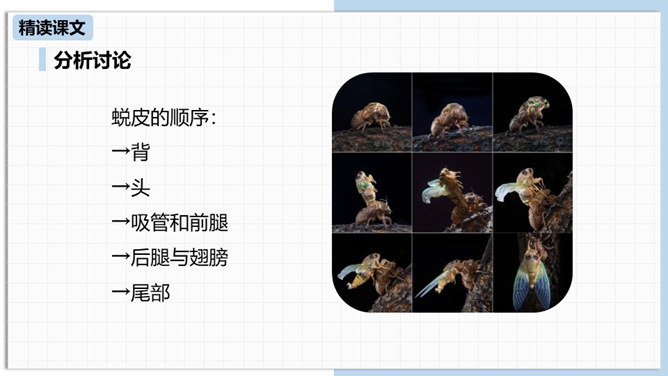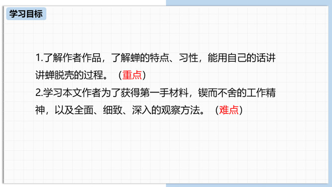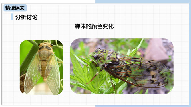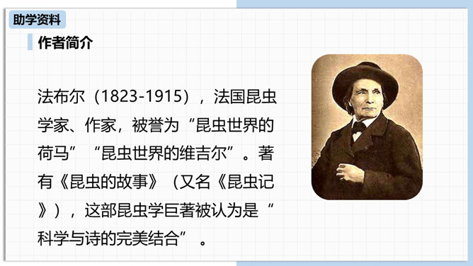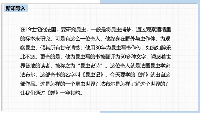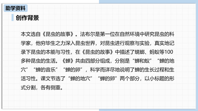 本文选自《昆虫的故事》。法布尔是第一位在自然环境中研究昆虫的科学家,他穷毕生之力深入昆虫世界,对昆虫进行观察与实验,真实地记录下昆虫的本能与习性,在《昆虫的故事》中描述了蜣螂、蚂蚁等100多种昆虫的生活。《蝉》共由四部分组成,分别是“蝉和蚁”“蝉的地穴”“蝉的音乐”“蝉的卵”,科学而详尽地说明了蝉的生长过程和生活习性。课文节选了“蝉的地穴”“蝉的卵”两个部分,以小标题的形式分割,各有侧重。科学小品的特点是:内容真实,结构严谨巧妙,语言生动准确。所属专题:蝉ppt。