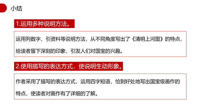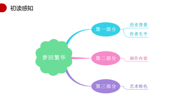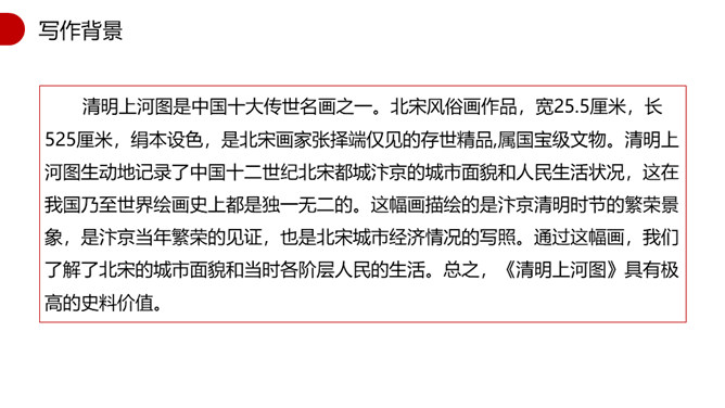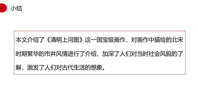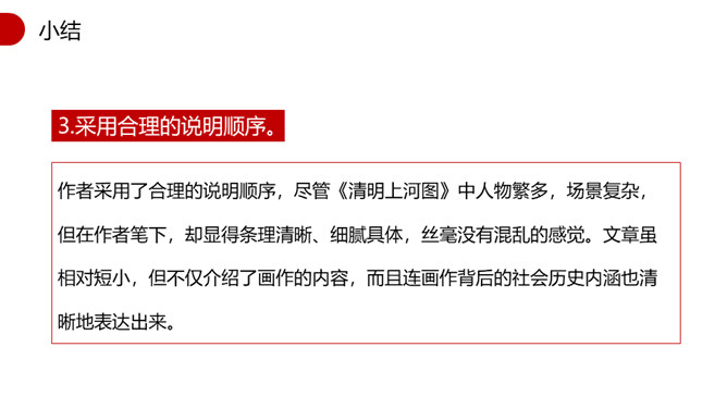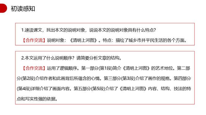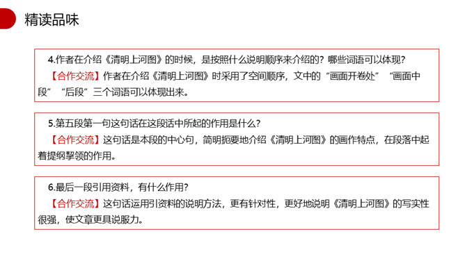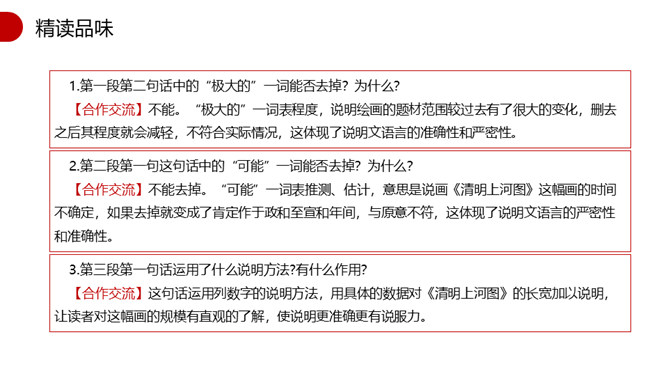 1.速读课文,找出本文的说明对象,说说本文的说明对象具有什么特点?说明对象:《清明上河图》。特点:描绘了城乡市井平民生活的各个方面。2.本文运用了什么说明顺序?请简要分析文章的结构。 运用了逻辑顺序。第一部分(第1段)简介《清明上河图》的艺术地位。第二部分(第2段)介绍作者和此画背后所蕴含的心情。第三部分(第3段)介绍了画作的规格。第四部分(第4段)详细介绍了画面内容。第五部分(第5段)介绍了《清明上河图》内容、结构、技法的特点和写实性强的依据。第一段第二句话中的“极大的”一词能否去掉?为什么?所属专题:梦回繁华ppt。