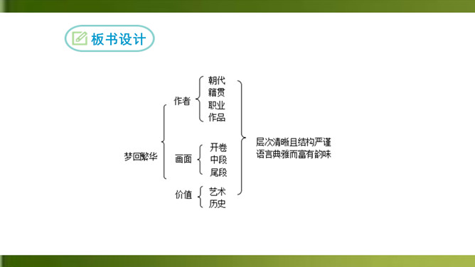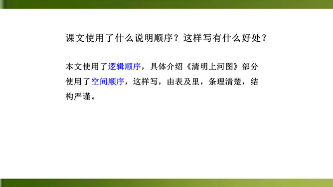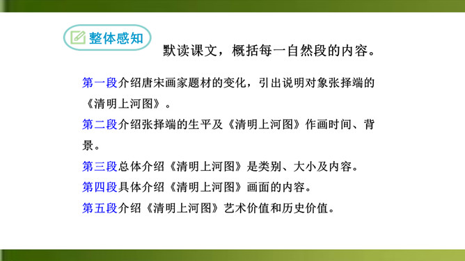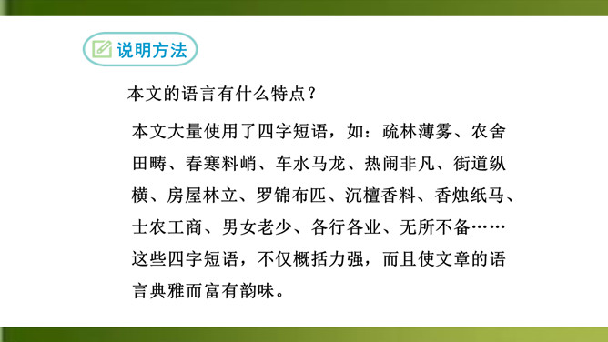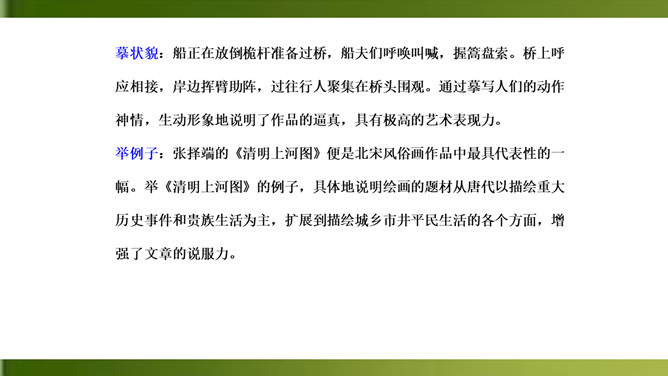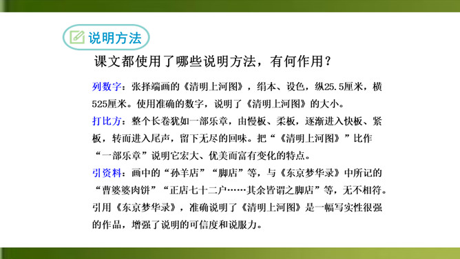 课文都使用了哪些说明方法,有何作用?列数字:张择端画的《清明上河图》,绢本、设色,纵25.5厘米,横525厘米。使用准确的数字,说明了画作的大小。打比方:整个长卷犹如一部乐章,由慢板、柔板,逐渐进入快板、紧板,转而进入尾声,留下无尽的回味。把“《清明上河图》”比作“一部乐章”说明它宏大、优美而富有变化的特点。引资料:画中的“孙羊店”“脚店”等,与《东京梦华录》中所记的“曹婆婆肉饼”“正店七十二户……其余皆谓之脚店”等,无不相符。引用《东京梦华录》,准确说明了是一幅写实性很强的作品,增强了说明的可信度和说服力。所属专题:梦回繁华ppt。