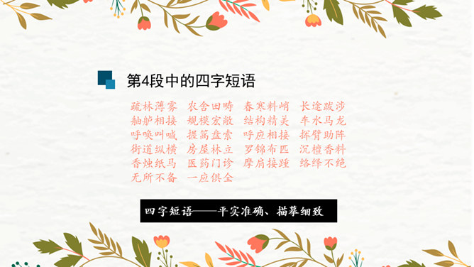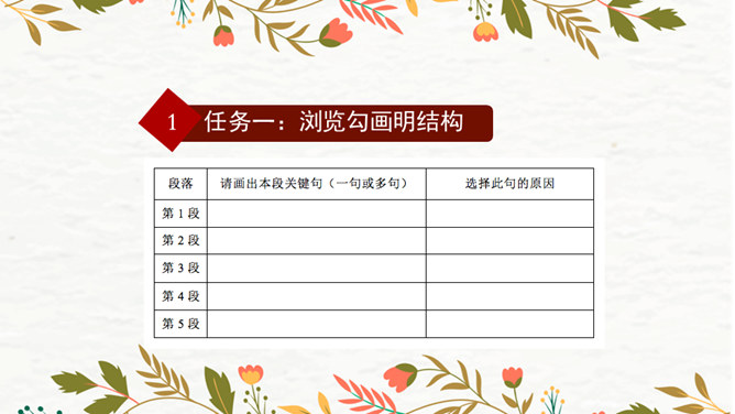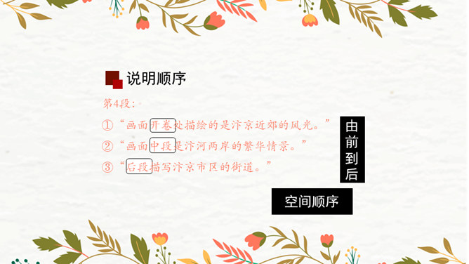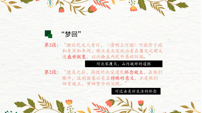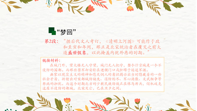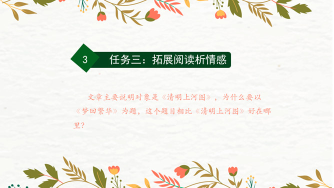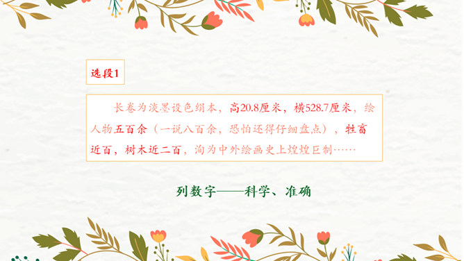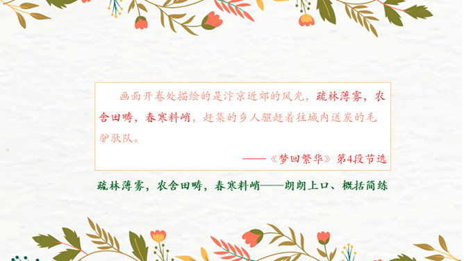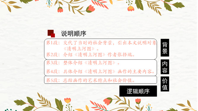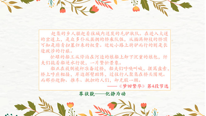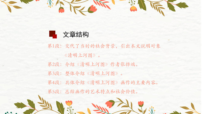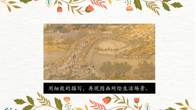 第1段:交代了当时的社会背景,引出本文说明对象《清明上河图》。第2段:介绍作者张择端。第3段:整体介绍《清明上河图》。第4段:具体介绍画作的主要内容。第5段:总结画作的艺术特点和社会价值。请同学们从“中国古代传世名画”中,任选其中感兴趣的一幅,在查阅资料后,运用本单元所学说明文知识,为其写一段说明性文字。可整幅说明,也可选择某一幅画中的某段进行说明。所属专题:梦回繁华ppt。