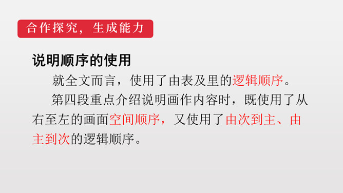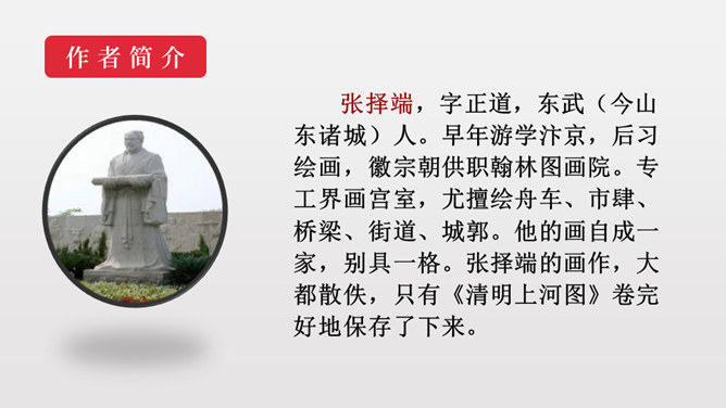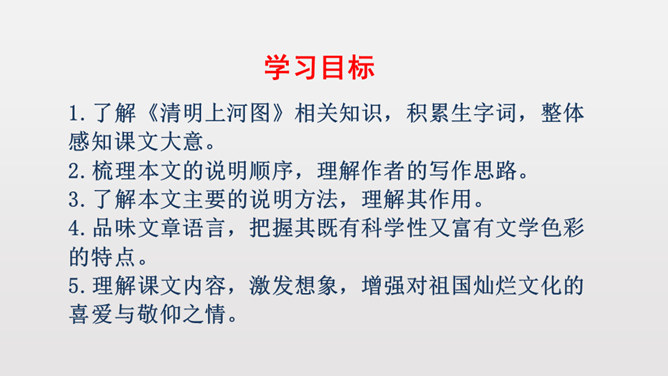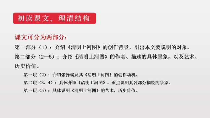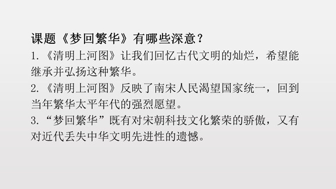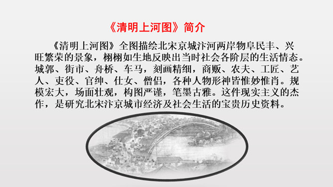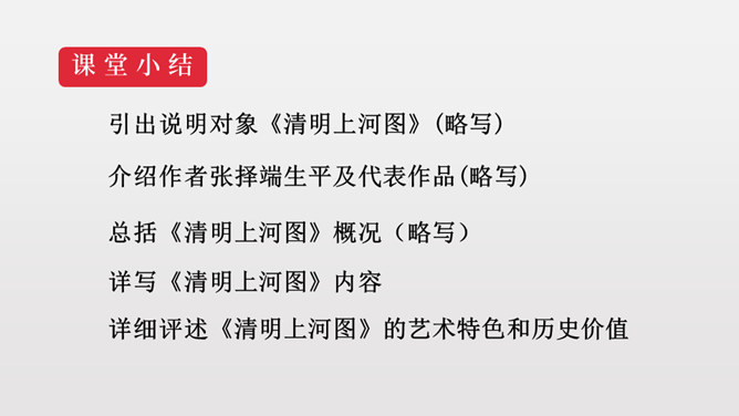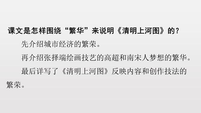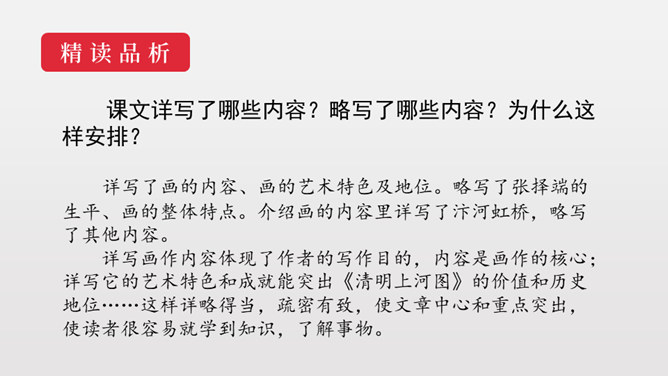 梳理本文的说明顺序,理解作者的写作思路。了解本文主要的说明方法,理解其作用。课文详写了哪些内容?略写了哪些内容?为什么这样安排?详写了画的内容、画的艺术特色及地位。略写了张择端的生平、画的整体特点。介绍画的内容里详写了汴河虹桥,略写了其他内容。详写画作内容体现了作者的写作目的,内容是画作的核心;详写它的艺术特色和成就能突出《清明上河图》的价值和历史地位……这样详略得当,疏密有致,使文章中心和重点突出,使读者很容易就学到知识,了解事物。所属专题:梦回繁华ppt。