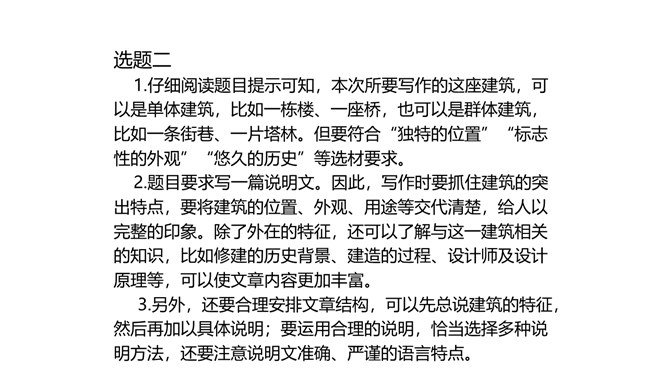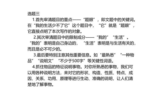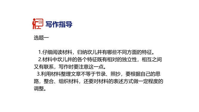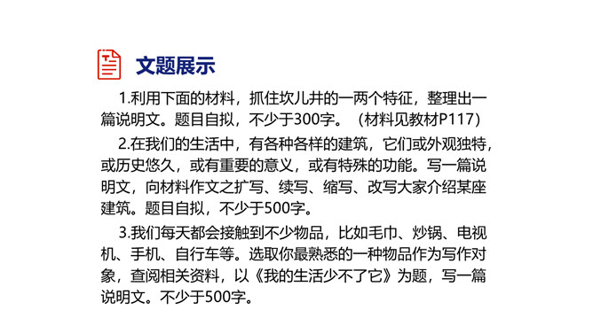 1.懂得说明事物抓住事物特征的重要性。2.知道什么叫“特征”,懂得说明事物的特征不仅要对事物表象进行说明,还必须反映事物的内在联系。3.能抓住事物的特征写说明文。1.利用下面的材料,抓住坎儿井的一两个特征,整理出一篇说明文。题目自拟,不少于300字。2.在我们的生活中,有各种各样的建筑,它们或外观独特,或历史悠久,或有重要的意义,或有特殊的功能。写一篇说明文,向材料作文之扩写、续写、缩写、改写大家介绍某座建筑。题目自拟,不少于500字。所属专题:说明事物要抓住特征ppt。