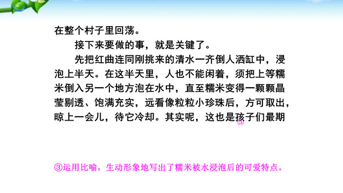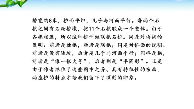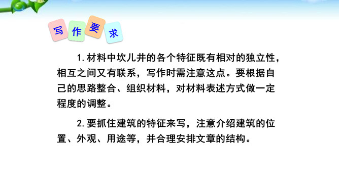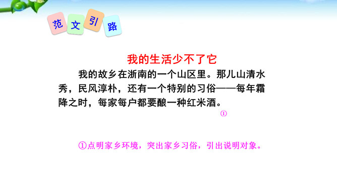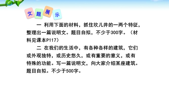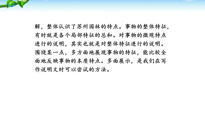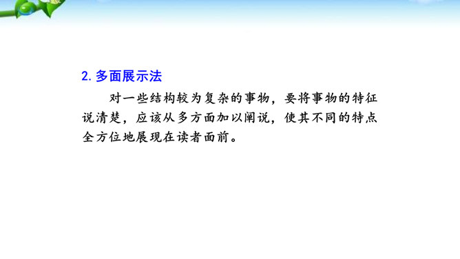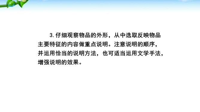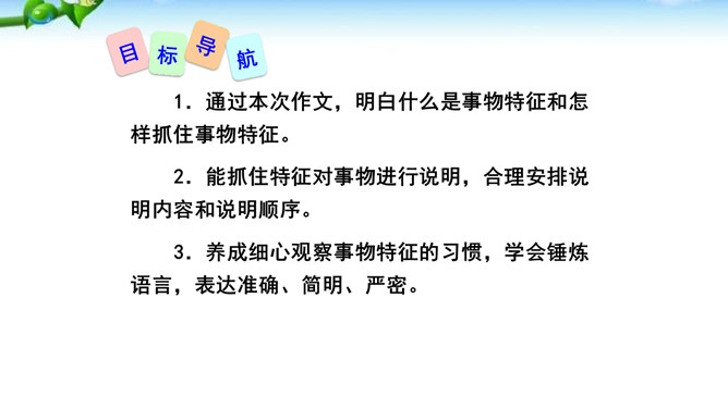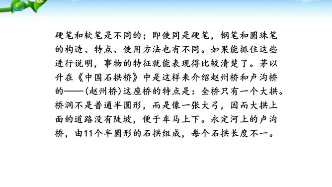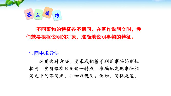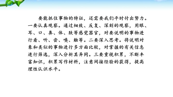 不同事物的特征各不相同,在写作说明文时,我们就要根据说明的对象,准确地说明事物的特征。同中求异法。运用这种方法,要求我们善于利用事物的形似相同,实质略有区别这一特点,准确地发现事物相同之中的不同点,并加以说明。例如,同样是笔,硬笔和软笔是不同的;即使同是硬笔,钢笔和圆珠笔的构造、特点、使用方法也有不同。如果能抓住这些进行说明,事物的特征就能表现得比较清楚了。多面展示法。对一些结构较为复杂的事物,要将事物的特征说清楚,应该从多方面加以阐说,使其不同的特点全方位地展现在读者面前。所属专题:说明事物要抓住特征ppt。