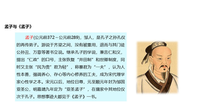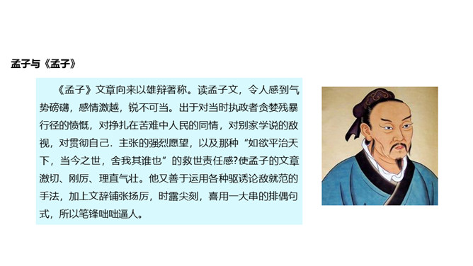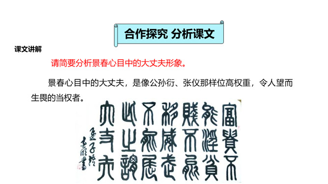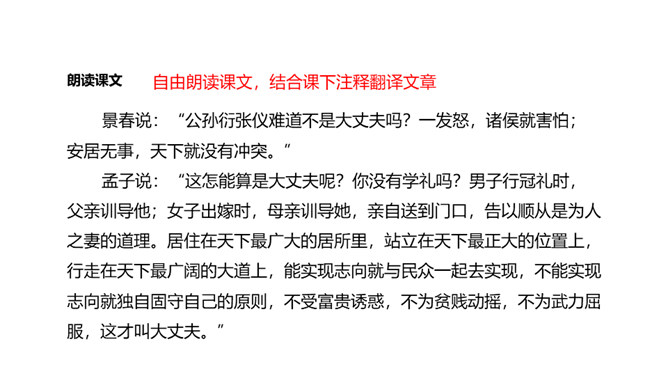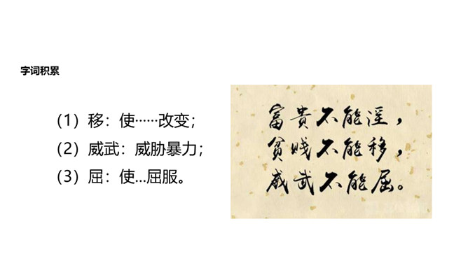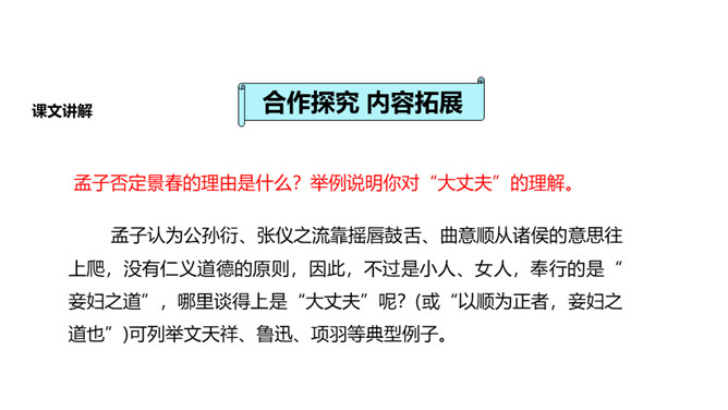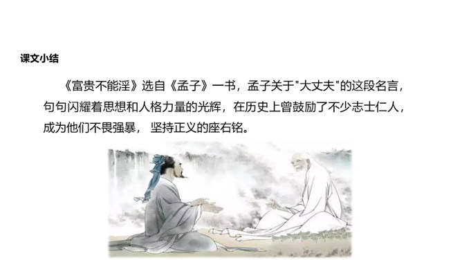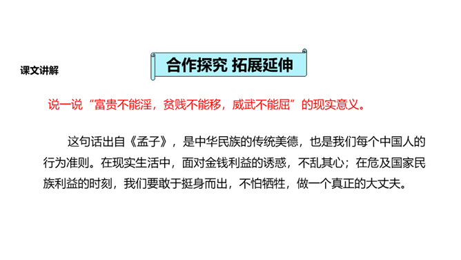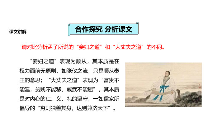 人们经常说“大丈夫说到做到”“大丈夫行不更名,坐不改姓”,我们一起来看看“亚圣”孟子对“大丈夫”的阐释。请对比分析孟子所说的“妾妇之道”和“大丈夫之道”的不同。“妾妇之道”表现为顺从,其本质是在权力面前无原则,如张仪之流,只是顺从秦王的意思;“大丈夫之道”表现为“富贵不能淫,贫贱不能移,威武不能屈”,其本质是对内心的仁、义、礼的坚守,一如儒家所倡导的“穷则独善其身,达则兼济天下”。孟子否定景春的理由是什么?举例说明你对“大丈夫”的理解。所属专题:富贵不能淫ppt。