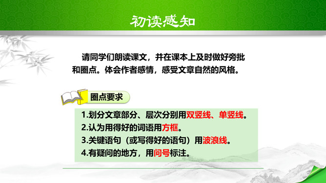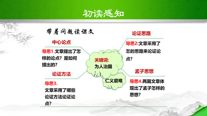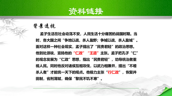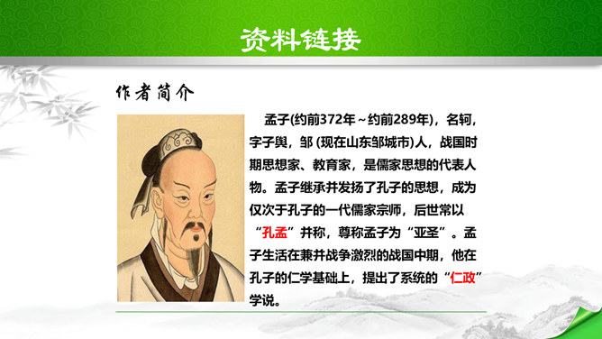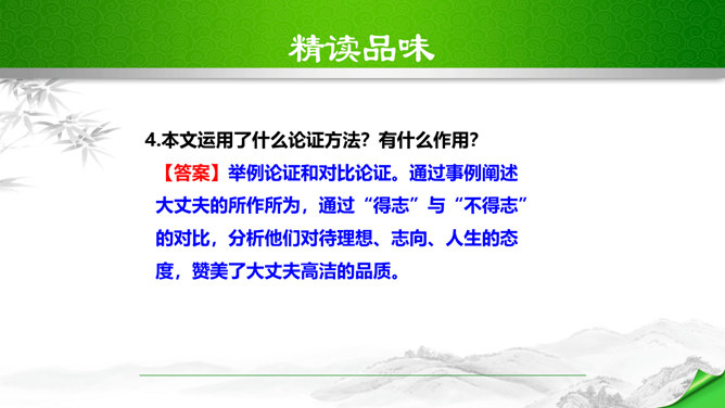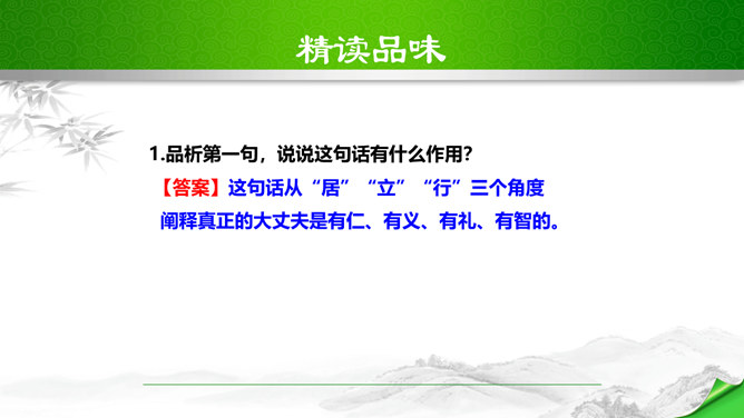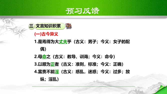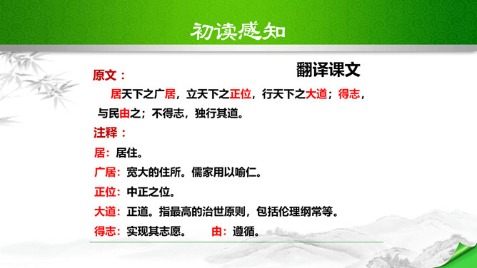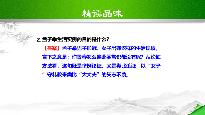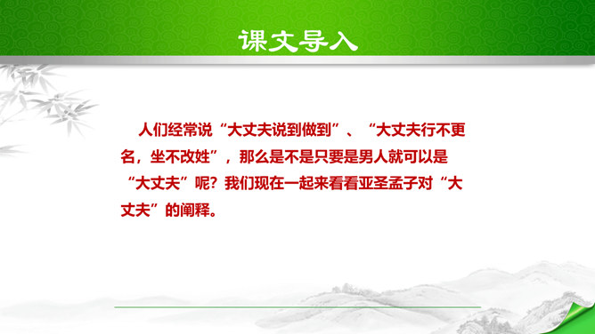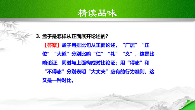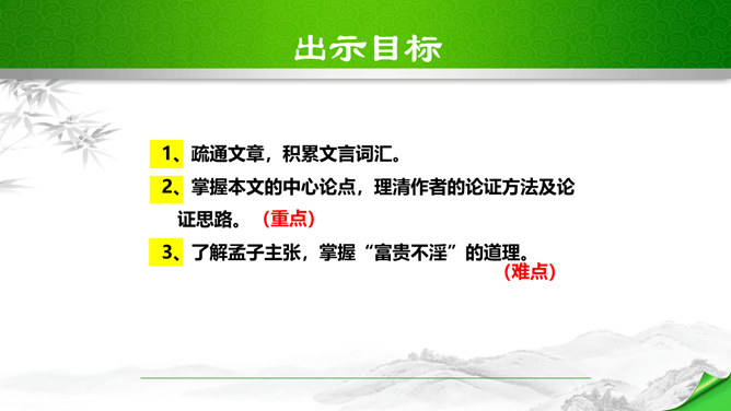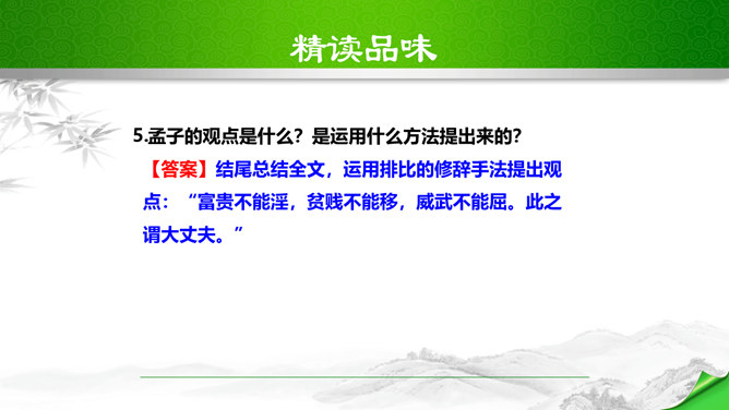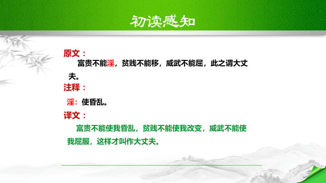 1.语言含蓄,讽刺深刻尖锐。孟子通过言“礼”来说明女子出嫁时母亲的嘱咐,由此得出“以顺为正者,妾妇之道也”,讽刺公孙衍、张仪之流不以正义为标准,而是以顺从为原则,是在行“妾妇之道”。2.运用排比,增强文章的气势和感染力。“富贵不能淫,贫贱不能移,威武不能屈”形成排比,气势磅礴,铿锵有力,具有极强的感染力,成为千古名言。1、疏通文章,积累文言词汇。2、掌握本文的中心论点,理清作者的论证方法及论证思路。3、了解孟子主张,掌握“富贵不淫”的道理。所属专题:富贵不能淫ppt。