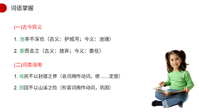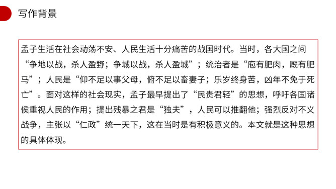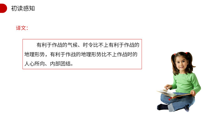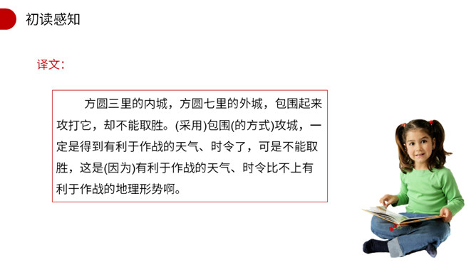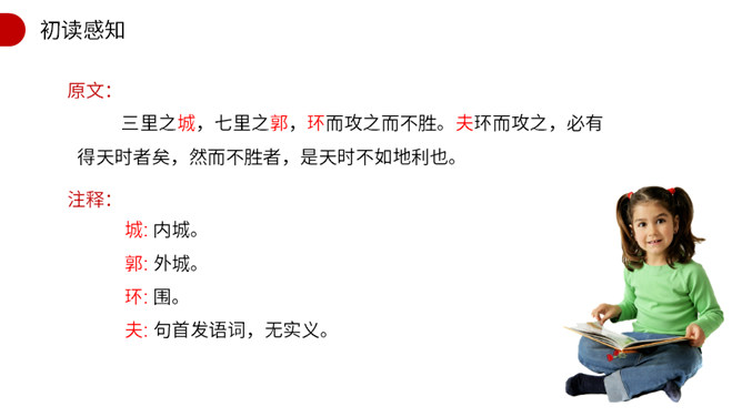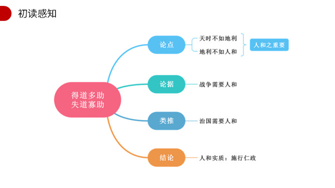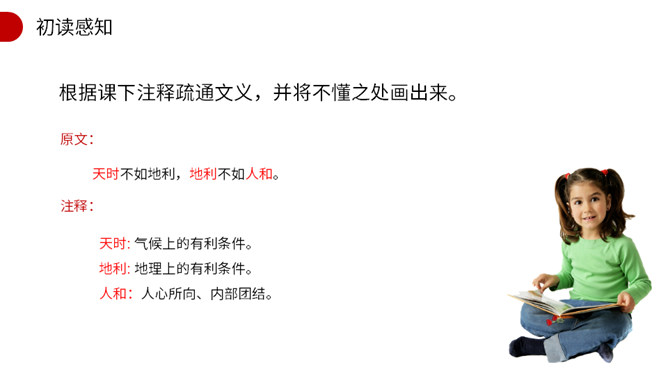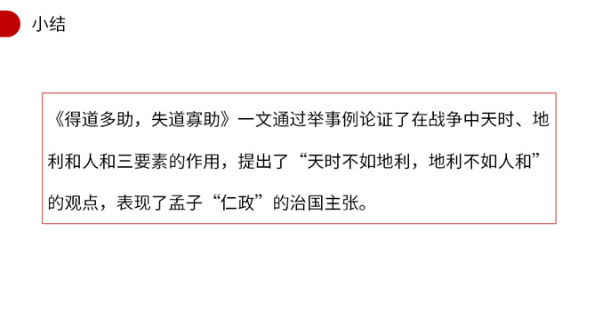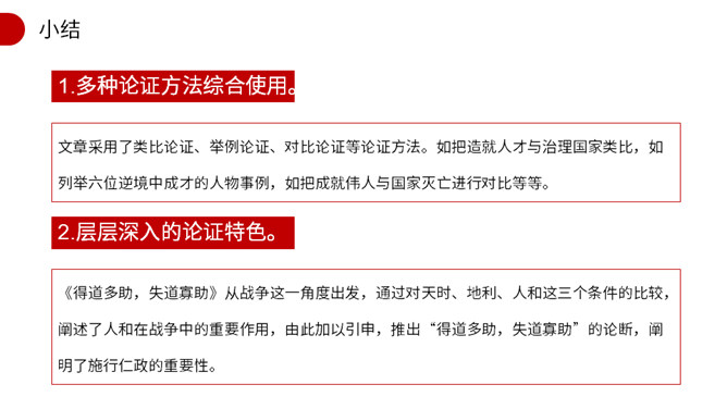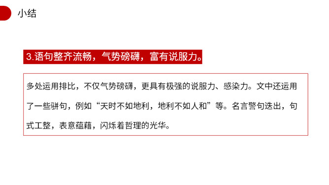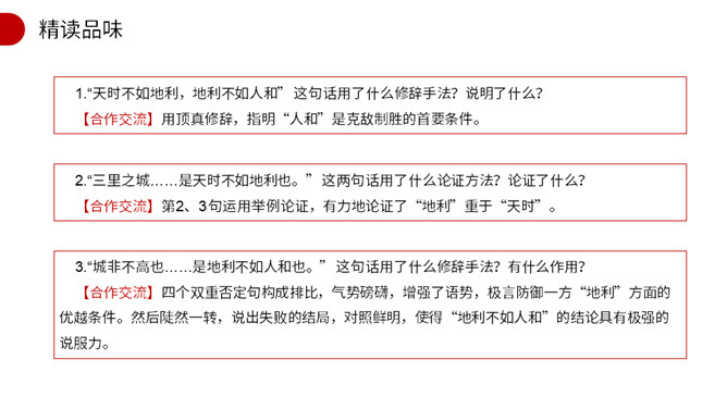 “天时不如地利,地利不如人和” 这句话用了什么修辞手法?说明了什么? 用顶真修辞,指明“人和”是克敌制胜的首要条件。“三里之城……是天时不如地利也。” 这两句话用了什么论证方法?论证了什么? 第2、3 句运用举例论证,有力地论证了“地利”重于“天时”。“城非不高也……是地利不如人和也。” 这句话用了什么修辞手法?有什么作用? 四个双重否定句构成排比,气势磅礴,增强了语势,极言防御一方“地利”方面的优越条件。然后陡然一转,说出失败的结局,对照鲜明,使得“地利不如人和”的结论具有极强的说服力。