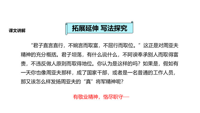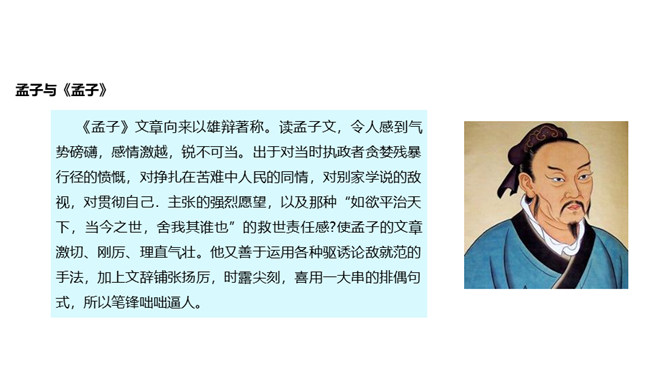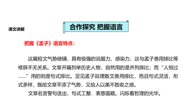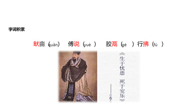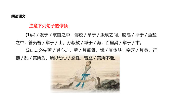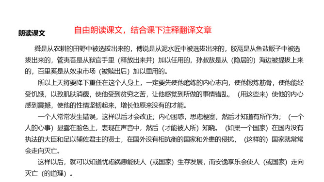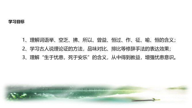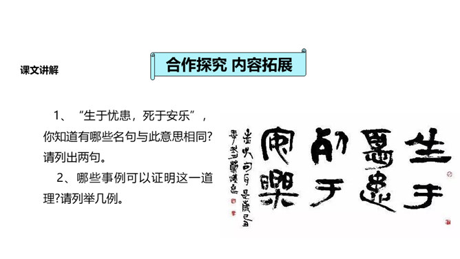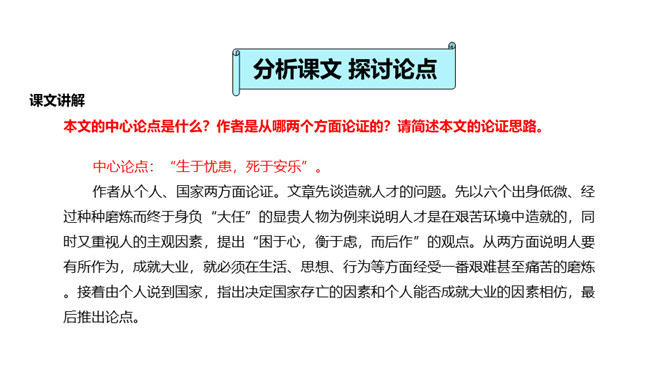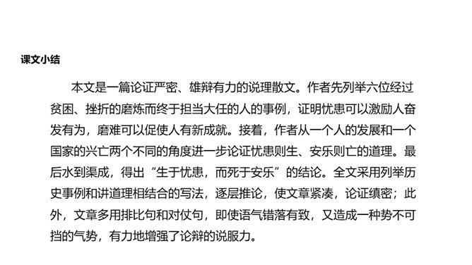 本文是一篇论证严密、雄辩有力的说理散文。作者先列举六位经过贫困、挫折的磨炼而终于担当大任的人的事例,证明忧患可以激励人奋发有为,磨难可以促使人有新成就。接着,作者从一个人的发展和一个国家的兴亡两个不同的角度进一步论证忧患则生、安乐则亡的道理。最后水到渠成,得出“生于忧患,而死于安乐”的结论。全文采用列举历史事例和讲道理相结合的写法,逐层推论,使文章紧凑,论证缜密;此外,文章多用排比句和对仗句,即使语气错落有致,又造成一种势不可挡的气势,有力地增强了论辩的说服力。所属专题:生于忧患死于安乐ppt。