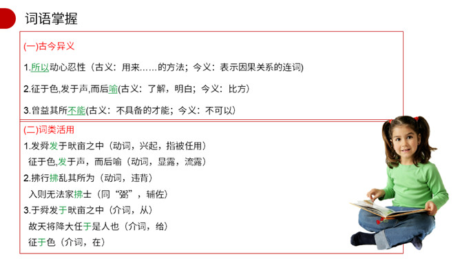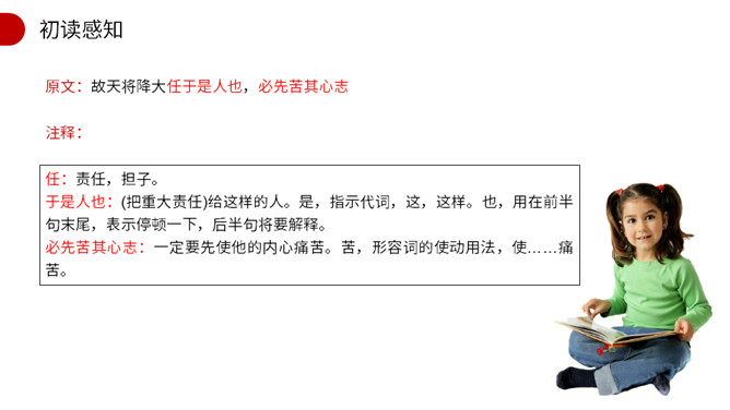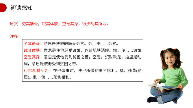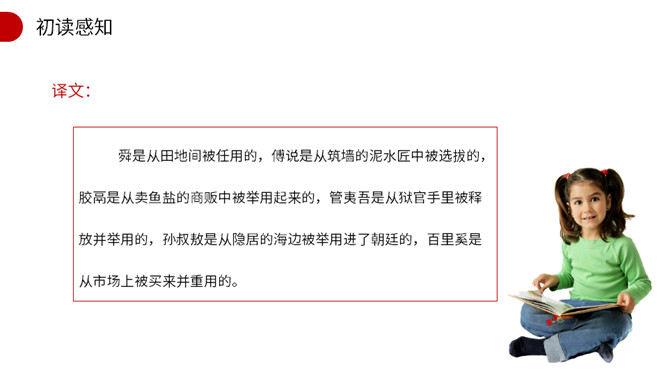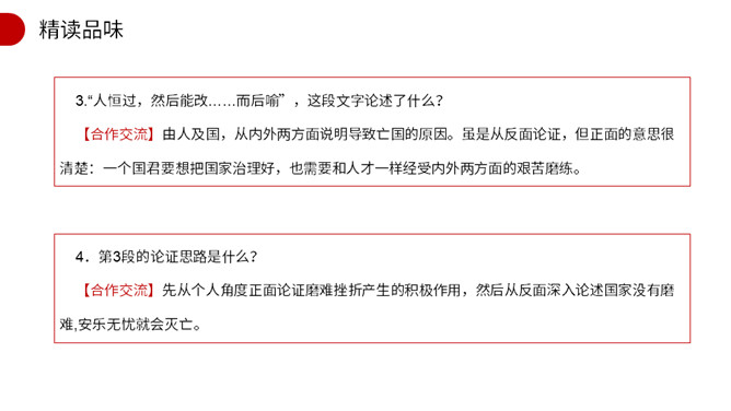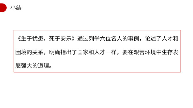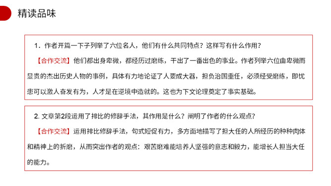 作者开篇一下子列举了六位名人,他们有什么共同特点?这样写有什么作用? 他们都出身卑微,都经历过磨练,干出了一番出色的事业。作者列举六位由卑微而显贵的杰出历史人物的事例,具体有力地论证了人要成大器,担负治国重任,必须经受磨练,即忧患可以激人奋发有为,人才是在逆境中造就的。这也为下文论理奠定了事实基础。文章第2段运用了排比的修辞手法,其作用是什么?阐明了作者的什么观点? 运用排比修辞手法,句式短促有力,多方面地描写了担大任的人所经历的种种肉体和精神上的折磨,从而突出作者的观点。所属专题:生于忧患死于安乐ppt。