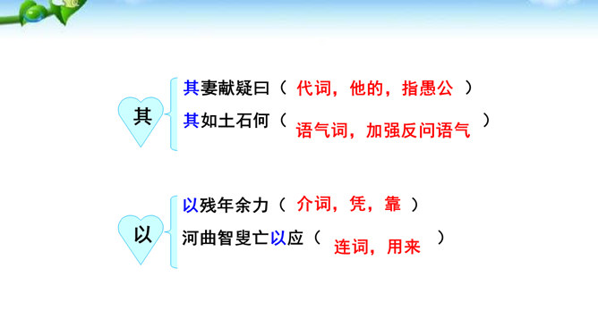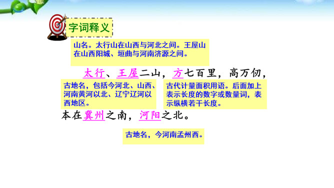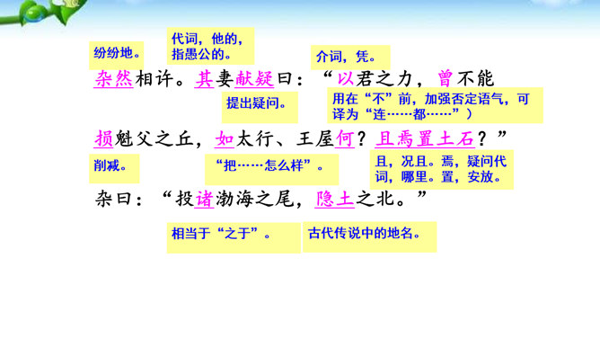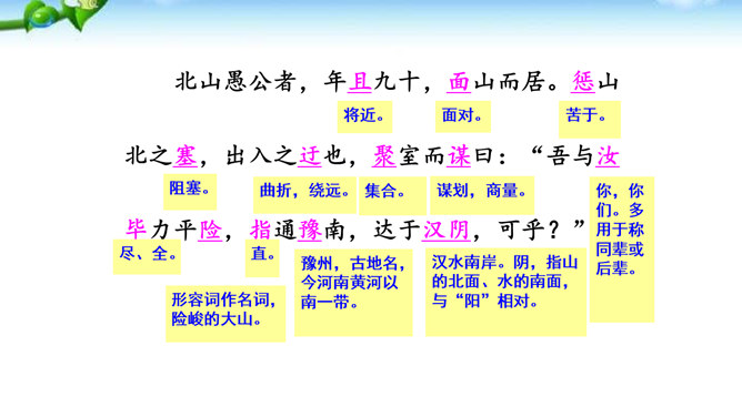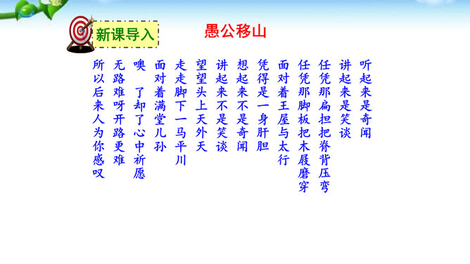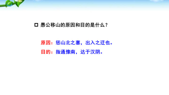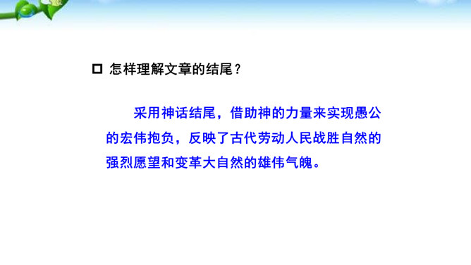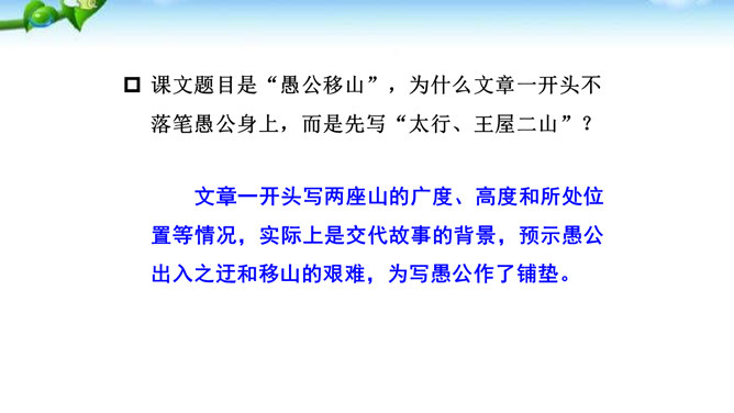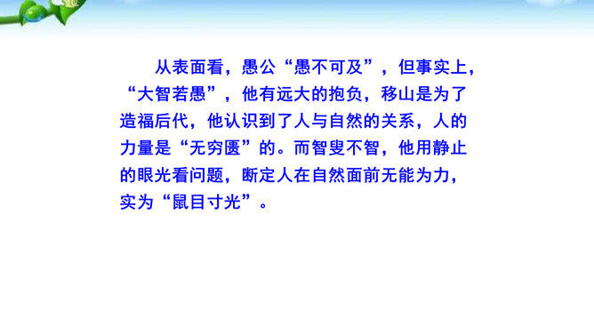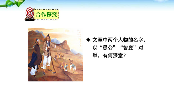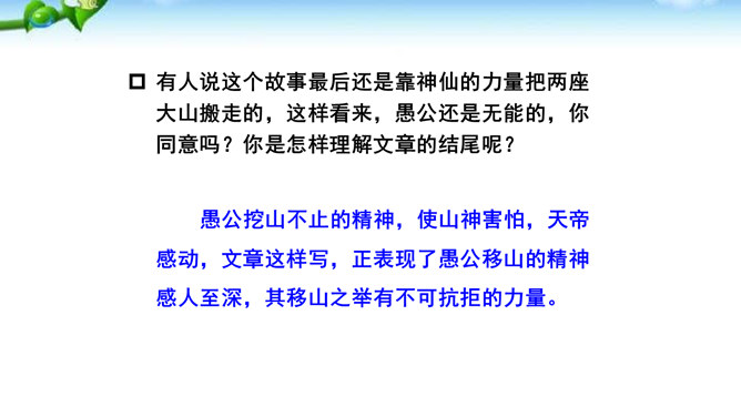 这篇课文的内容比较简单,主要写愚公移山的故事,你认为愚公移山会成功吗? 学生甲:愚公移山一定会成功。因为愚公决心大,且能坚持不懈,全家齐上阵,又有邻居相助。山不会再增高,而愚公的子子孙孙是无穷无尽的。学生乙:愚公移山是不可能成功的。愚公虽然有坚定的决心,但是他们的力量实在是太小了:工具简陋,只有锄头、箕畚之类;人数太少,只有自己一家人和少数邻居。从现代科学来讲,山也不是永远不变的事物,它也有增高的可能,而这种地质上的变化,也会给移山带来无法克服的困难。所属专题:愚公移山ppt。