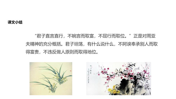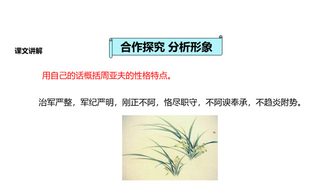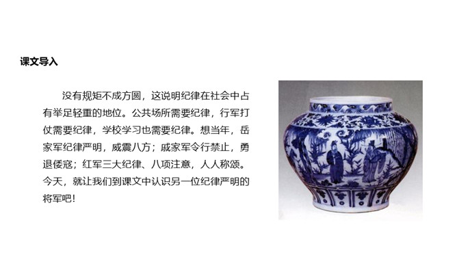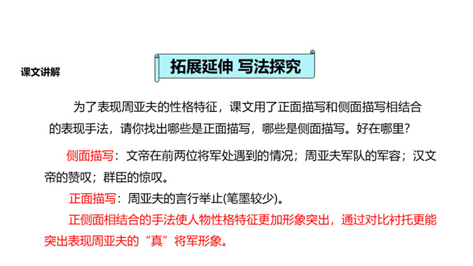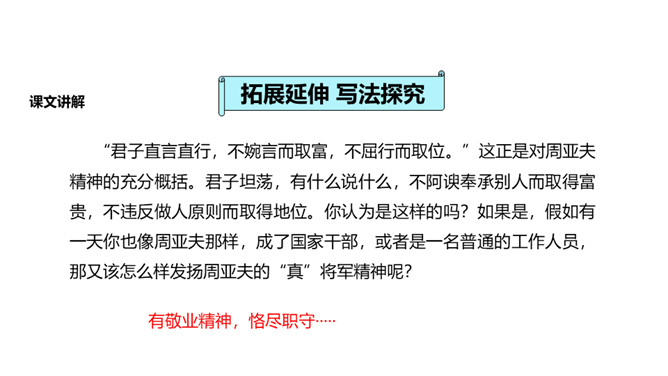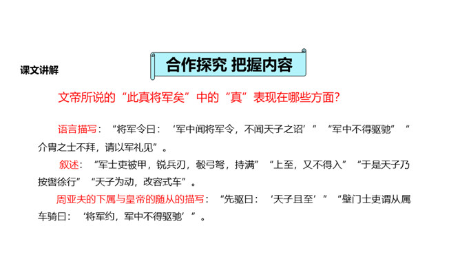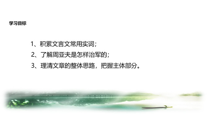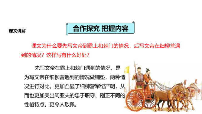 没有规矩不成方圆,这说明纪律在社会中占有举足轻重的地位。公共场所需要纪律,行军打仗需要纪律,学校学习也需要纪律。想当年,岳家军纪律严明,威震八方;戚家军令行禁止,勇退倭寇;红军三大纪律、八项注意,人人称颂。今天,就让我们到课文中认识另一位纪律严明的将军吧!理清课文的内容层次。第一部分为第一自然段。简要交代了边境的紧张形势和刘、徐、周三军的驻地。第二部分为第二自然段。写周亚夫在细柳营严格治军。第三部分为第三自然段。写汉文帝深明大义,赞叹周亚夫治军严谨。所属专题:周亚夫军细柳ppt。