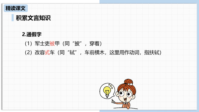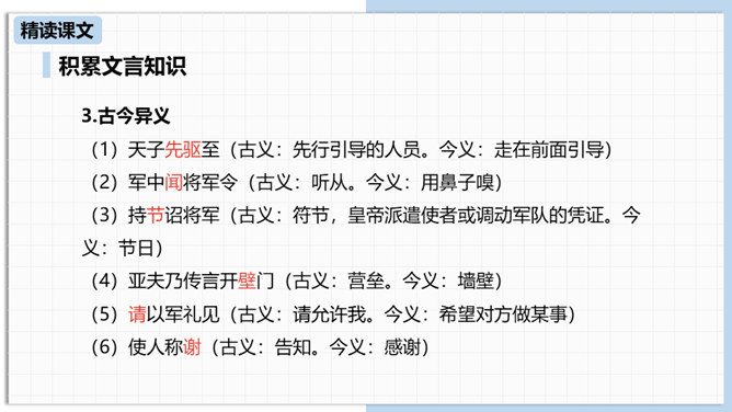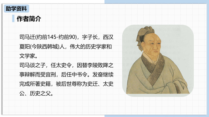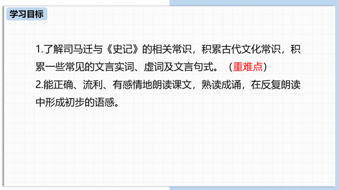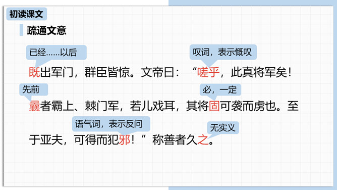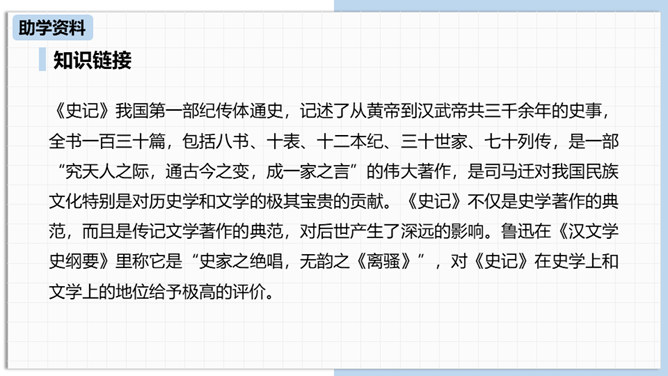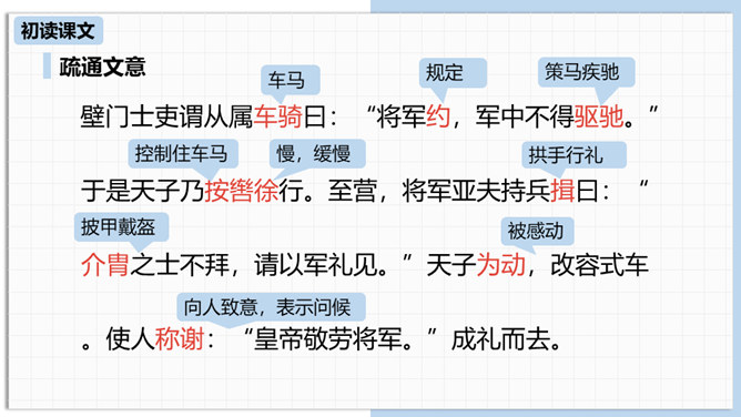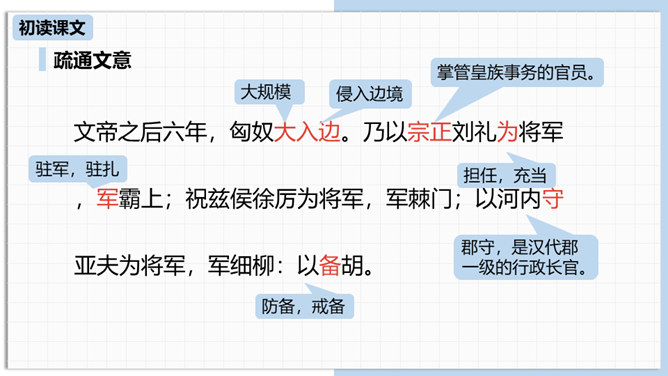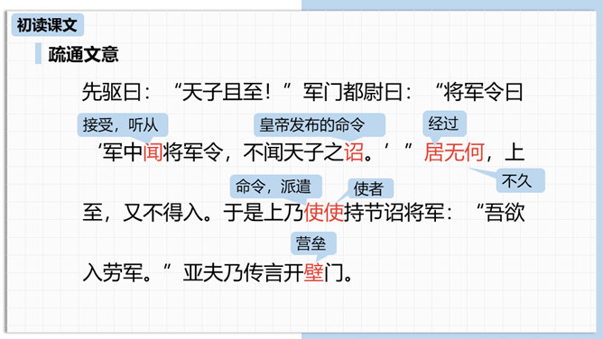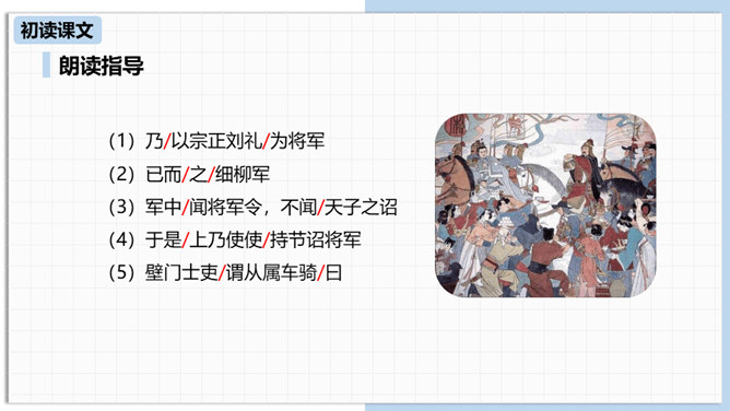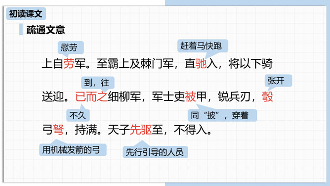 1.了解司马迁与《史记》的相关常识,积累古代文化常识,积累一些常见的文言实词、虚词及文言句式。(重难点)2.能正确、流利、有感情地朗读课文,熟读成诵,在反复朗读中形成初步的语感。这首五言律诗描写了一位将军打猎的情景。诗中对涉猎将军的英姿作了形象、逼真的描写,热情地歌颂了将军的豪迈气概,曲折的表达了作者积极向上的进取精神和远大的政治抱负。这里面的细柳营就是我们今天要学习的课文主人公——周亚夫驻军的地方,下面就让我们一起细读他在细柳营的故事,体会他与众不同的人格魅力吧。所属专题:周亚夫军细柳ppt。