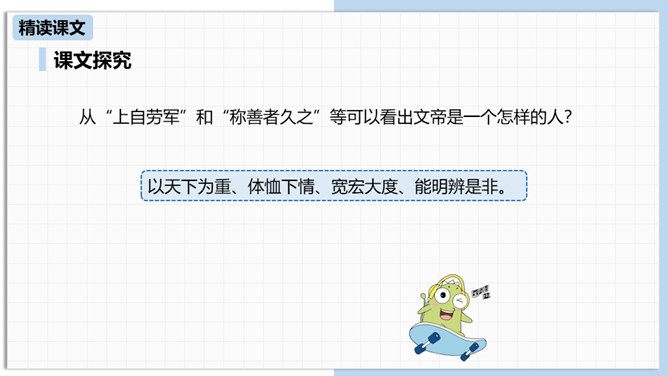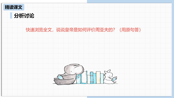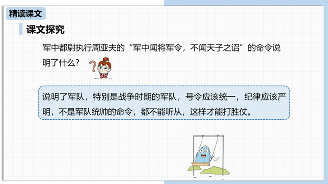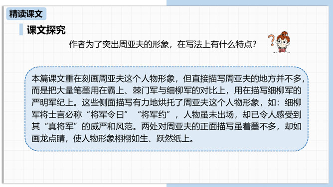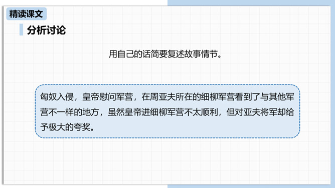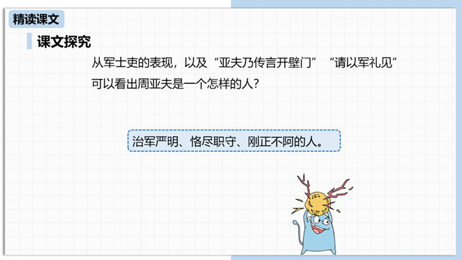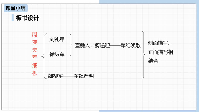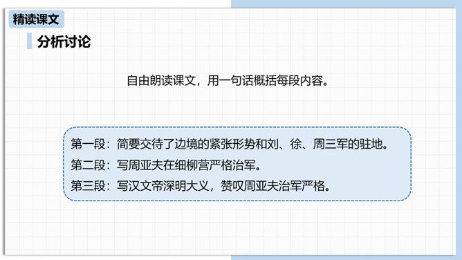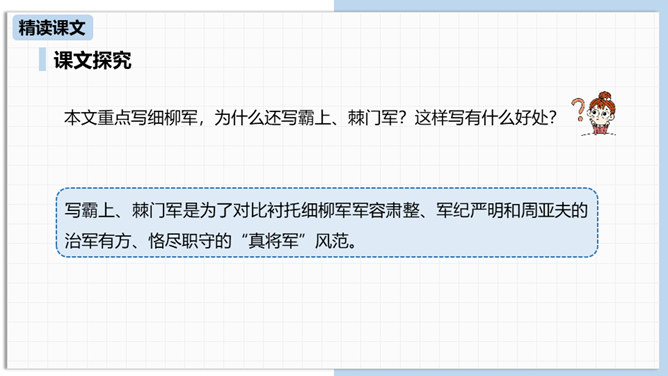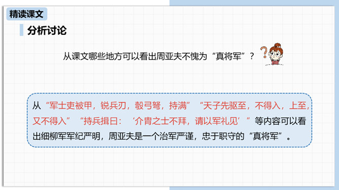 汉文帝在霸上军营和棘门军营,“直驰入,将以下骑送迎”,作者没有写汉文帝对此的态度,但从下文推断,汉文帝起初并未将之放在心上,甚至认为是理所当然的。但在细柳军营,情形完全不同,军中官兵均严格遵守将军之令,而将军则严格遵守军礼,即使面对天子也不例外。对比之下,汉文帝才意识到霸上军营和棘门军营是何等儿戏,细柳军营是何等不可侵犯,而只有细柳军这样训练有素、军纪严明的军队才是维护自己的统治(保家卫国)最需要的,特别是在“匈奴大入边”这样一个特殊的时期。所属专题:周亚夫军细柳ppt。