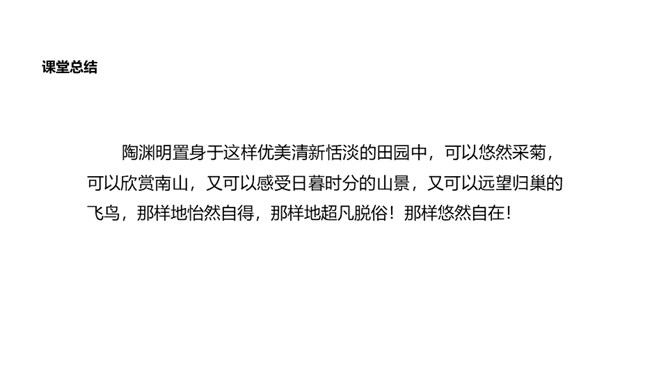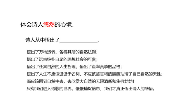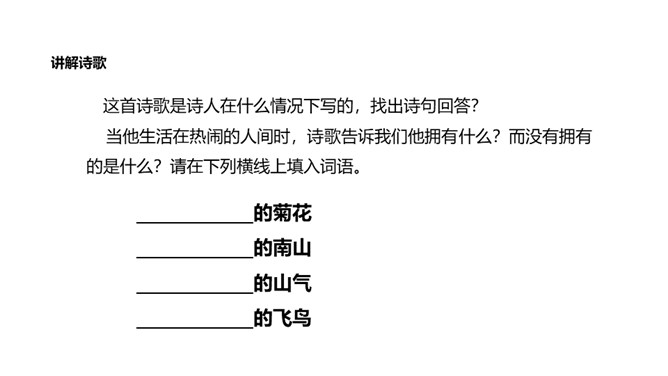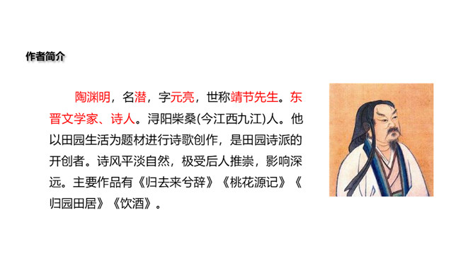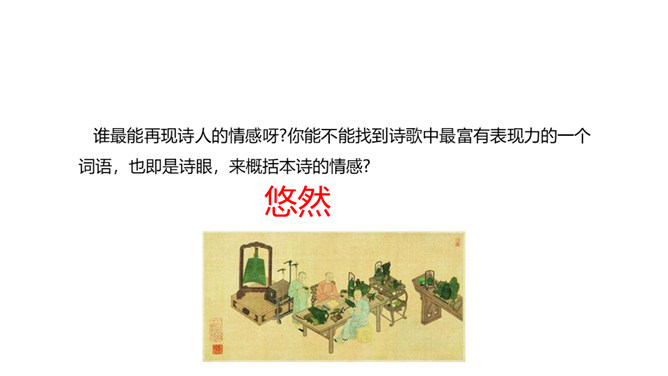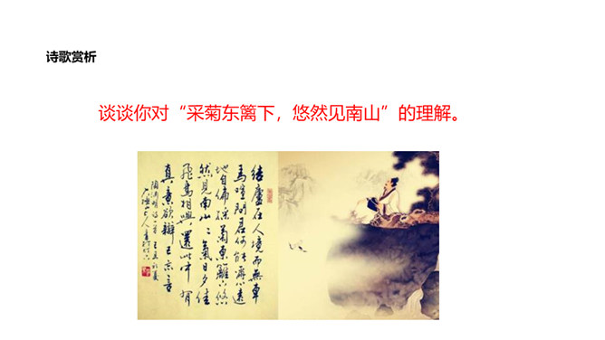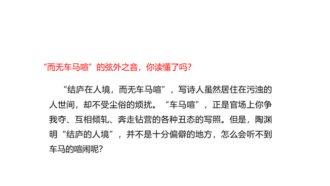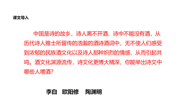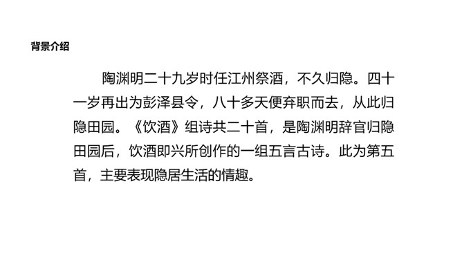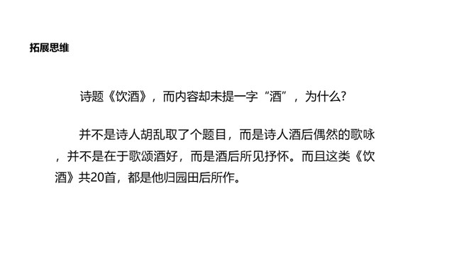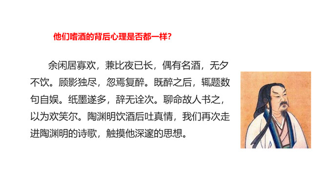 中国是诗的故乡,诗人离不开酒,诗中不能没有酒,从历代诗人雅士所留传的浩瀚的酒诗酒词中,无不使人们感受到浓郁的民族酒文化以及诗人那种炽烈的情感,从而引起共鸣。酒文化渊源流传,诗文化更博大精深,你能举出诗文中哪些人嗜酒?他们嗜酒的背后心理是否都一样?读准字音、读通诗句的基础上读出感情。“结庐在人境,而无车马喧”,写诗人虽然居住在污浊的人世间,却不受尘俗的烦扰。“车马喧”,正是官场上你争我夺、互相倾轧、奔走钻营的各种丑态的写照。但是,陶渊明“结庐的人境”,并不是十分偏僻的地方,怎么会听不到车马的喧闹呢?所属专题:饮酒ppt。