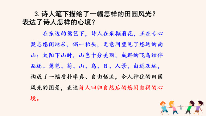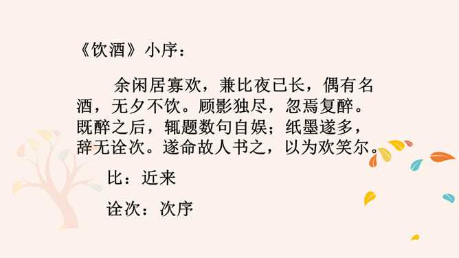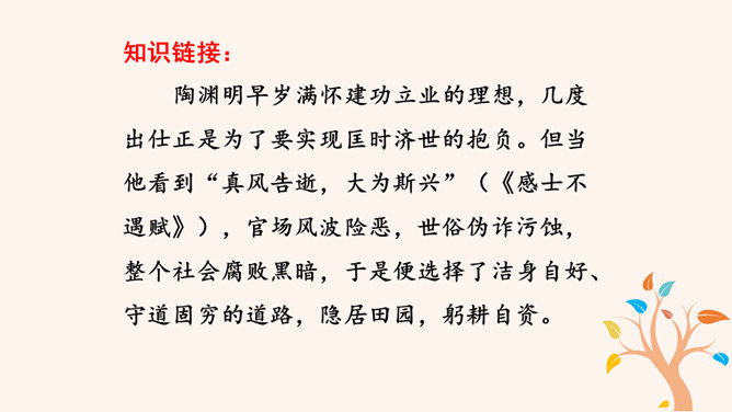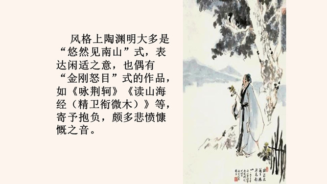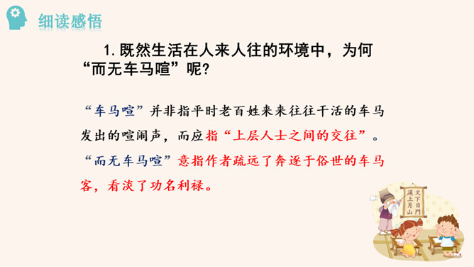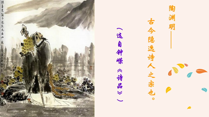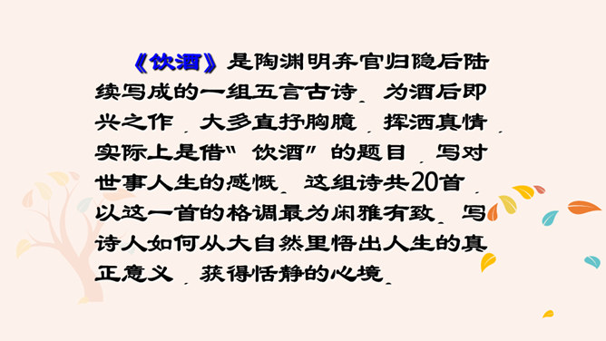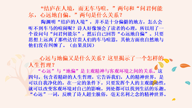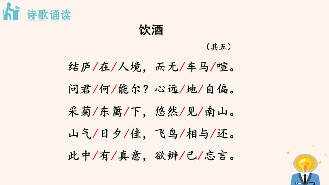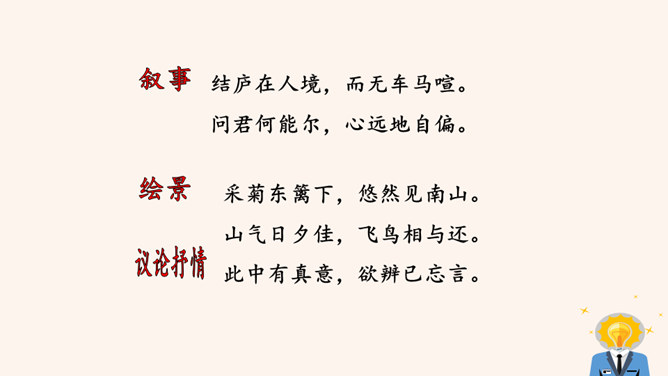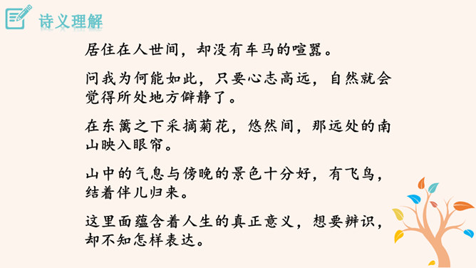 “此中有真意,欲辨已忘言。”诗人从这大自然的飞鸟、南山、夕阳、秋菊中悟出了什么真意呢?“此”指远离官场尘嚣,悠然自得地隐居。这两句说的是这里边有人生的真义,想辨别出来,却忘了怎样用语言表达。只可意会,不可言传。“至情言语即无声”。“真意”指的是自然之趣,人生真谛,那就是人生不应该为功名利禄所累,不应该在污浊的现实前迷失自我,而应回归自然,坚守住心灵的净土。 陶渊明的隐居你怎样看待?陶渊明渴望自由,弃官归隐,追求恬静的田园生活,完善独立的人格,特点是“淡泊” 。所属专题:饮酒ppt。