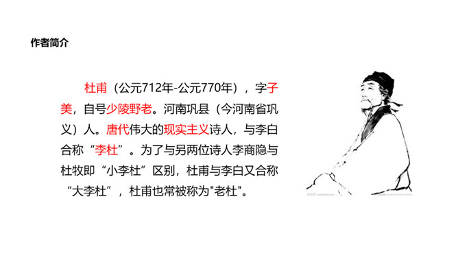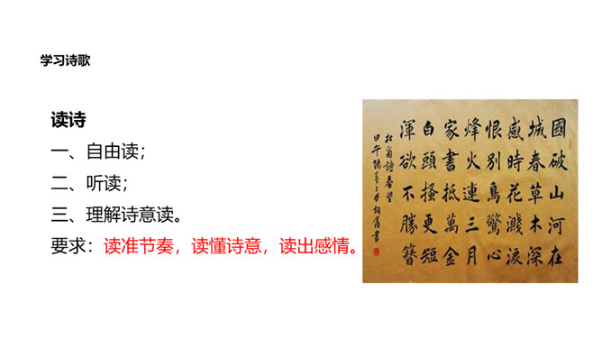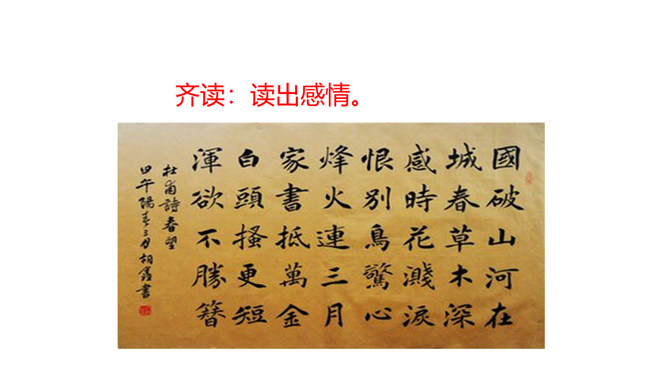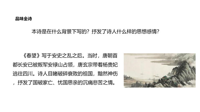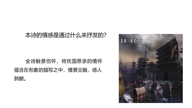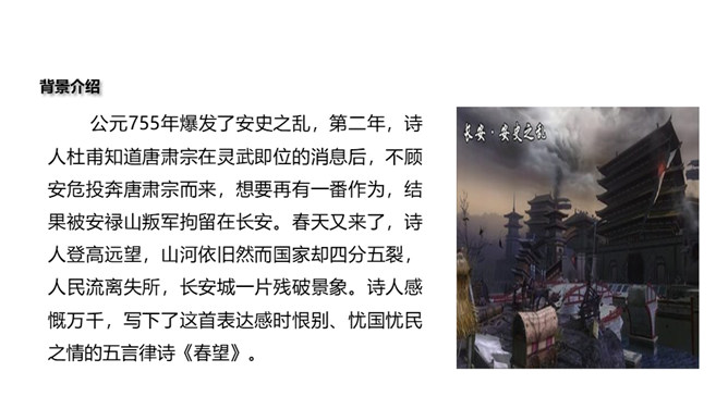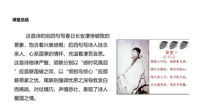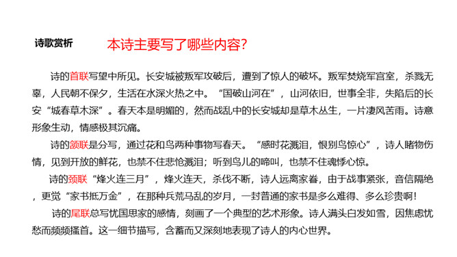 诗的首联写望中所见。长安城被叛军攻破后,遭到了惊人的破坏。叛军焚烧军宫室,杀戮无辜,人民朝不保夕,生活在水深火热之中。“国破山河在”,山河依旧,世事全非,失陷后的长安“城春草木深”。春天本是明媚的,然而战乱中的长安城却是草木丛生,一片凄风苦雨。诗意形象生动,情感极其沉痛。诗的颔联是分写,通过花和鸟两种事物写春天。“感时花溅泪,恨别鸟惊心”,诗人睹物伤情,见到开放的鲜花,也禁不住悲怆溅泪;听到鸟儿的啼叫,也禁不住魂悸心惊。诗的颈联“烽火连三月”,烽火连天,杀伐不断。所属专题:春望ppt。