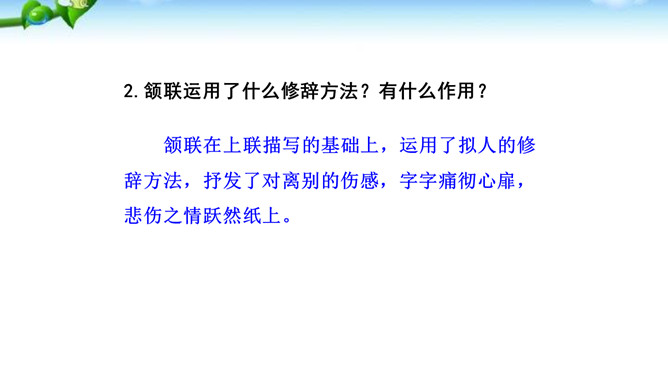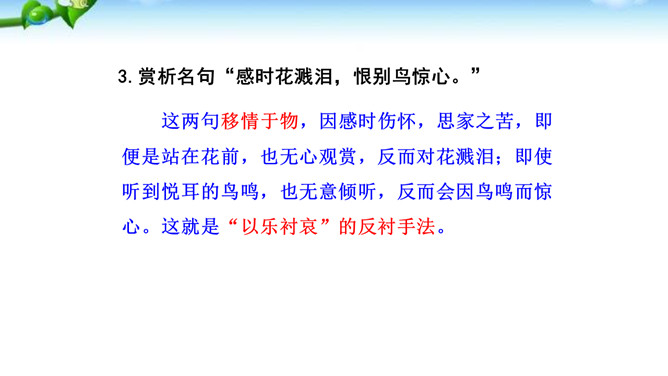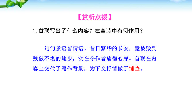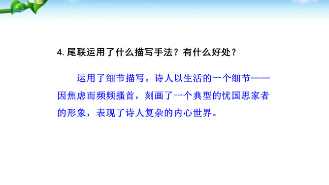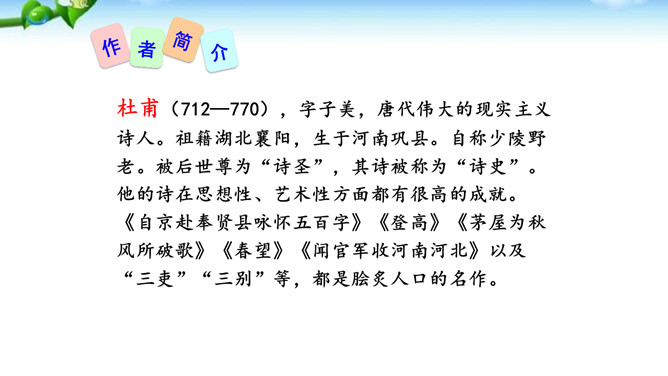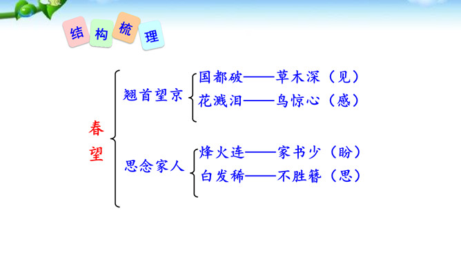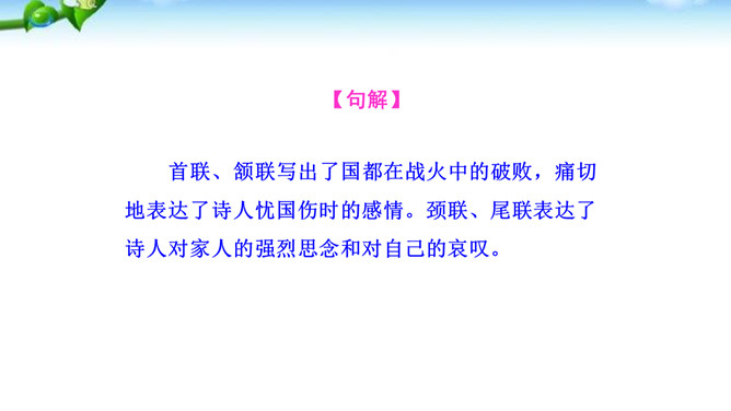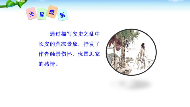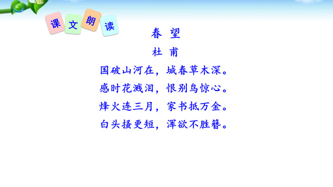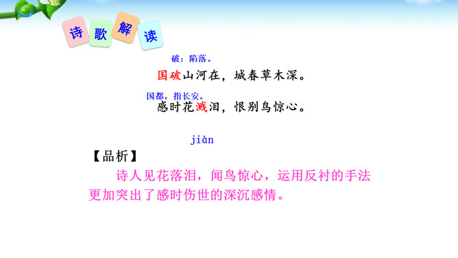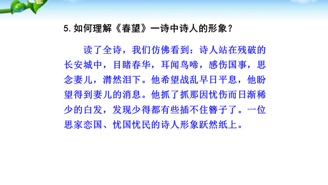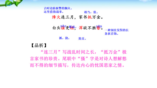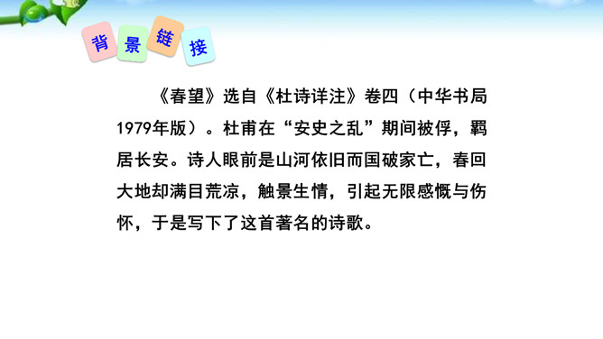 选自《杜诗详注》卷四(中华书局1979年版)。杜甫在“安史之乱”期间被俘,羁居长安。诗人眼前是山河依旧而国破家亡,春回大地却满目荒凉,触景生情,引起无限感慨与伤怀,于是写下了这首著名的诗歌。读了全诗,我们仿佛看到:诗人站在残破的长安城中,目睹春华,耳闻鸟啼,感伤国事,思念妻儿,潸然泪下。他希望战乱早日平息,他盼望得到妻儿的消息。他抓了抓那因忧伤而日渐稀少的白发,发现少得都有些插不住簪子了。一位思家恋国、忧国忧民的诗人形象跃然纸上。所属专题:春望ppt。