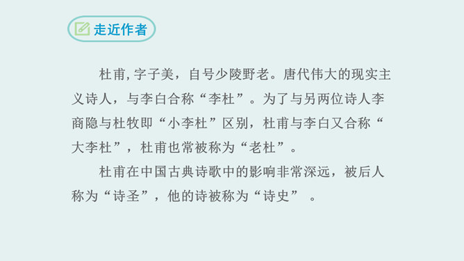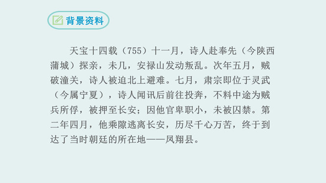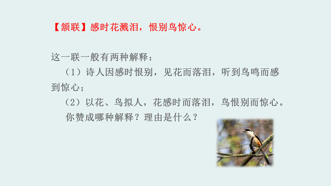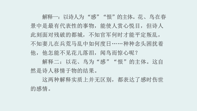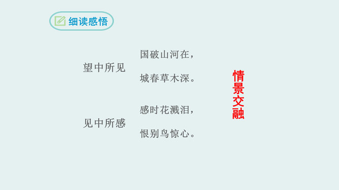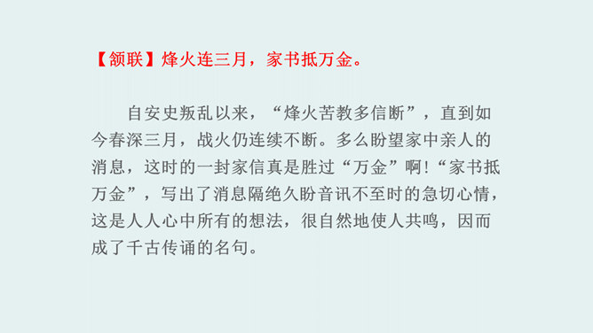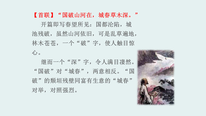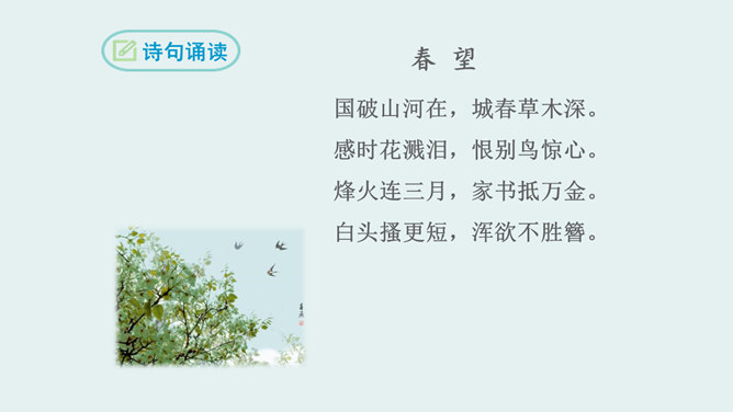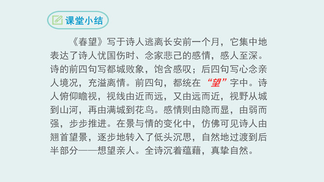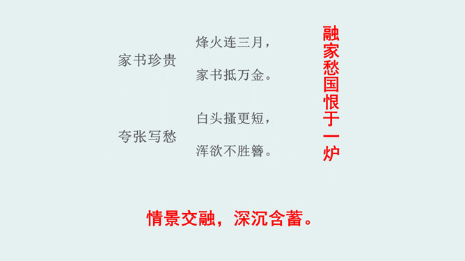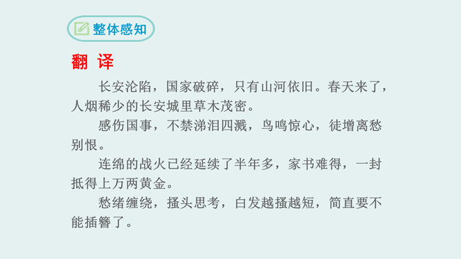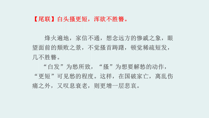 写于诗人逃离长安前一个月,它集中地表达了诗人忧国伤时、念家悲己的感情,感人至深。诗的前四句写都城败象,饱含感叹;后四句写心念亲人境况,充溢离情。前四句,都统在“望”字中。诗人俯仰瞻视,视线由近而远,又由远而近,视野从城到山河,再由满城到花鸟。感情则由隐而显,由弱而强,步步推进。在景与情的变化中,仿佛可见诗人由翘首望景,逐步地转入了低头沉思,自然地过渡到后半部分——想望亲人。全诗沉着蕴藉,真挚自然。“白发”为愁所致,“搔”为想要解愁的动作,“更短”可见愁的程度。所属专题:春望ppt。