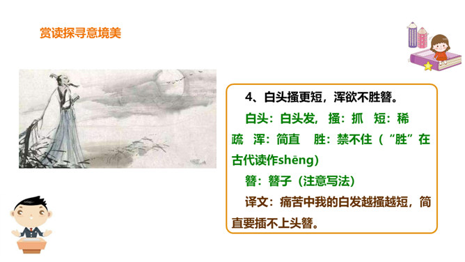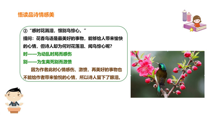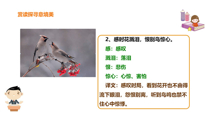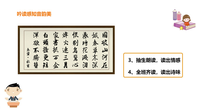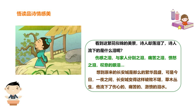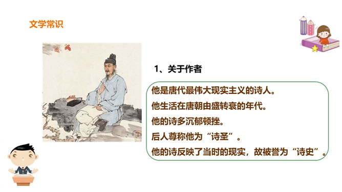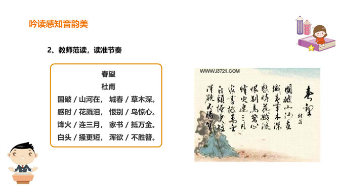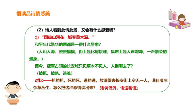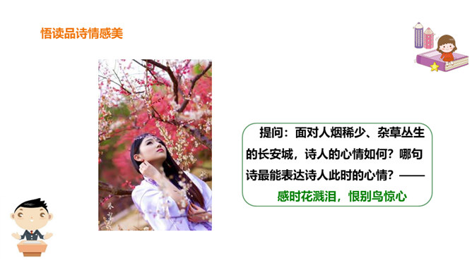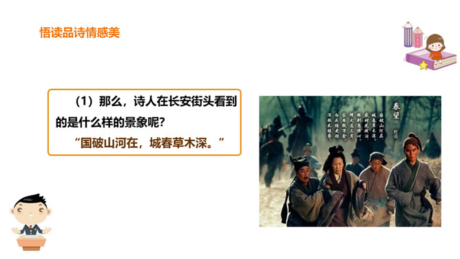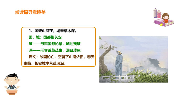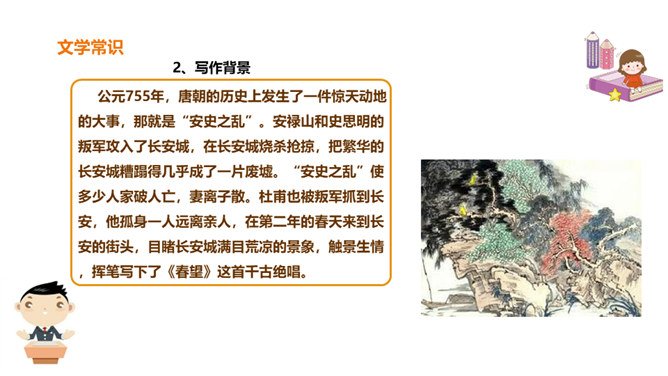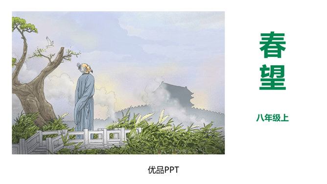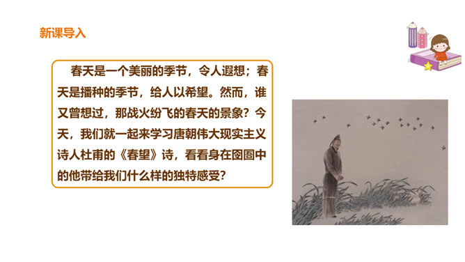 春天是一个美丽的季节,令人遐想;春天是播种的季节,给人以希望。然而,谁又曾想过,那战火纷飞的春天的景象?今天,我们就一起来学习唐朝伟大现实主义诗人杜甫的《春望》诗,看看身在囹圄中的他带给我们什么样的独特感受?他是唐代最伟大现实主义的诗人。他生活在唐朝由盛转衰的年代。他的诗多沉郁顿挫。后人尊称他为“诗圣”。他的诗反映了当时的现实,故被誉为“诗史”。公元755年,唐朝的历史上发生了一件惊天动地的大事,那就是“安史之乱”。安禄山和史思明的叛军攻入了长安城,在长安城烧杀抢掠。所属专题:春望ppt。
