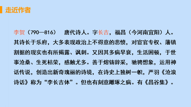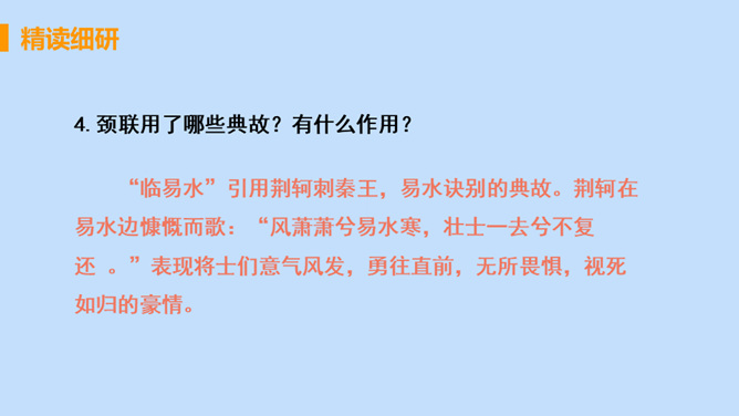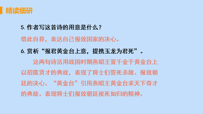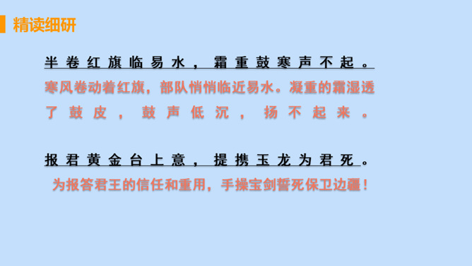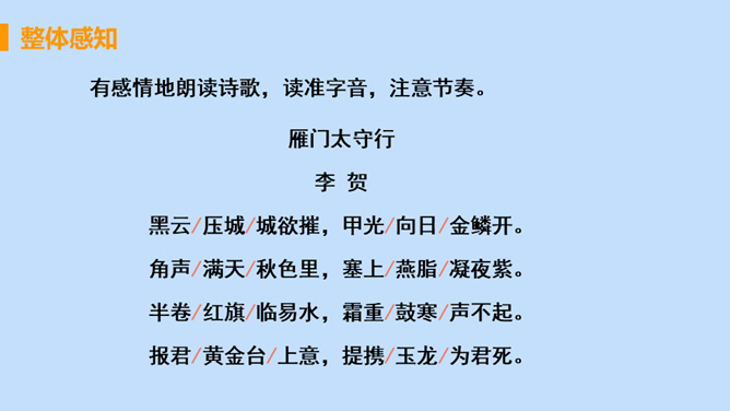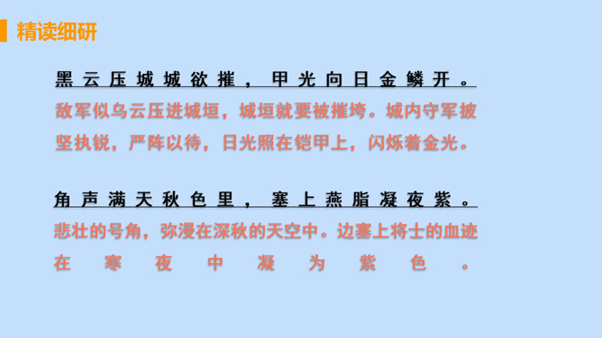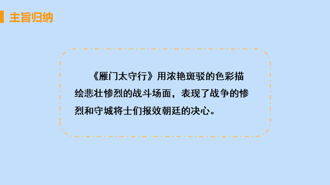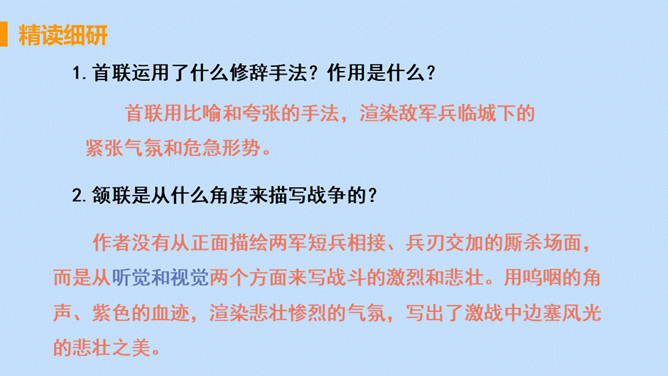 首联运用了什么修辞手法?作用是什么?首联用比喻和夸张的手法,渲染敌军兵临城下的紧张气氛和危急形势。颔联是从什么角度来描写战争的?作者没有从正面描绘两军短兵相接、兵刃交加的厮杀场面,而是从听觉和视觉两个方面来写战斗的激烈和悲壮。用呜咽的角声、紫色的血迹,渲染悲壮惨烈的气氛,写出了激战中边塞风光的悲壮之美。请设想“半卷红旗”是怎样的景象,作者捕捉这个景象入诗想要表现什么?“半卷红旗”是侧面描写战况,一方面风势很大,卷起红旗便于急行军,另一方面高度戒备,不事张扬,把战事的紧张状态凸显出来。所属专题:雁门太守行ppt。