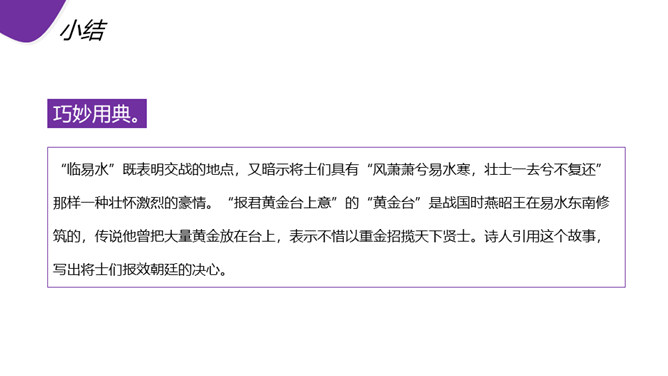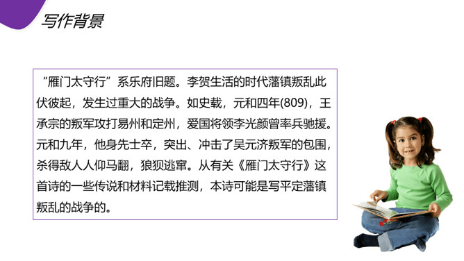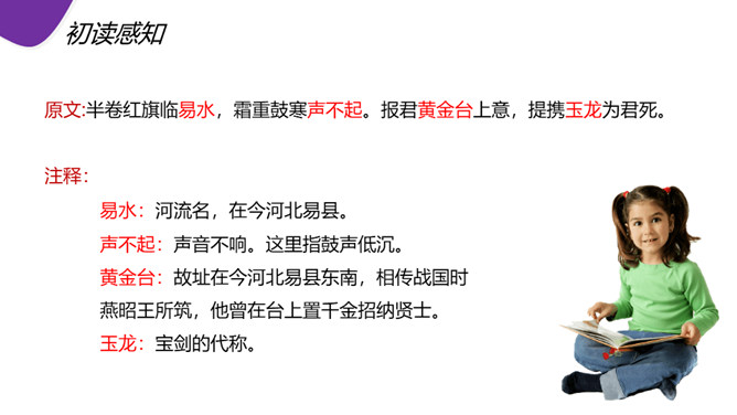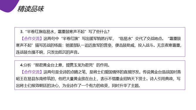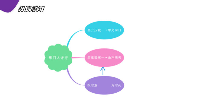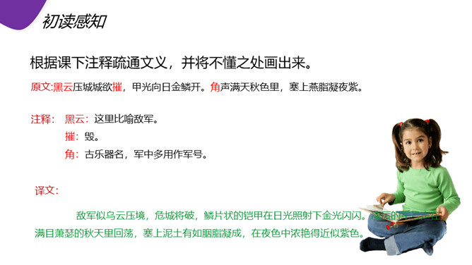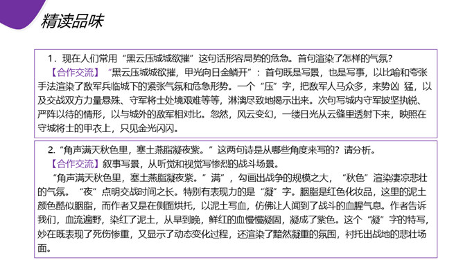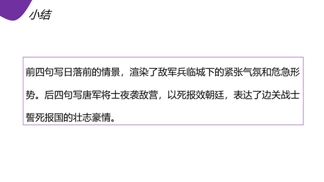 现在人们常用“黑云压城城欲摧”这句话形容局势的危急。首句渲染了怎样的气氛? “黑云压城城欲摧,甲光向日金鳞开”:首句既是写景,也是写事,以比喻和夸张手法渲染了敌军兵临城下的紧张气氛和危急形势。一个“压”字,把敌军人马众多,来势凶 猛,以及交战双方力量悬殊、守军将士处境艰难等等,淋漓尽致地揭示出来。次句写城内守军披坚执锐、严阵以待的情形,以与城外的敌军相对比。忽然,风云变幻,一缕日光从云缝里透射下来,映照在守城将士的甲衣上,只见金光闪闪。所属专题:雁门太守行ppt。