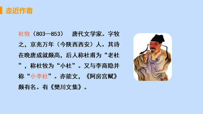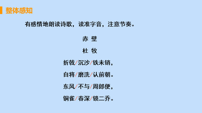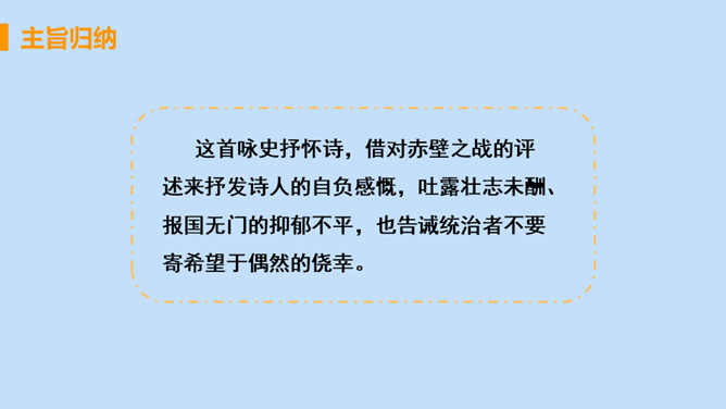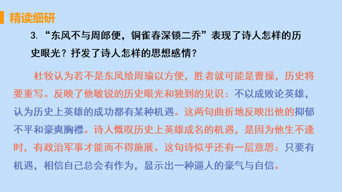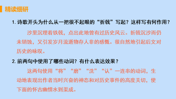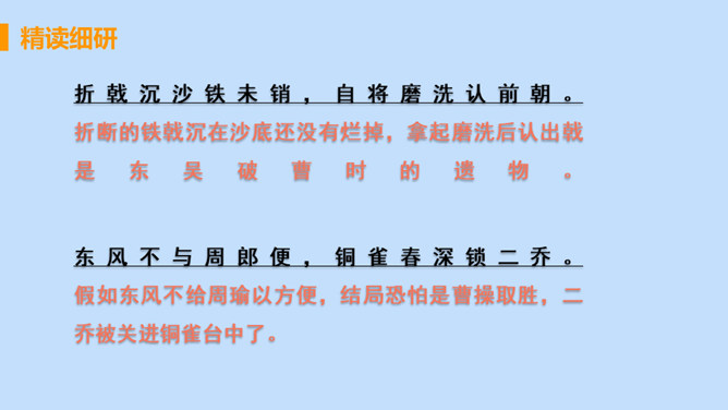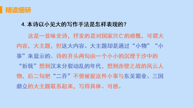 诗歌开头为什么从一把很不起眼的“折戟”写起?这样写有何作用?沙里沉埋着铁戟,点出此地曾有过历史风云。折戟沉沙而仍未销蚀,又引发岁月流逝物存人非的感慨。很自然地引起后文对历史的咏叹。前两句中使用了哪些动词?有什么表达效果?这两句使用“将”“磨”“洗”“认”一连串的动词,生动地表现出作者当时兴奋的神态和对历史事件的高度关切,使下面的怀古幽情水到渠成。“东风不与周郎便,铜雀春深锁二乔”表现了诗人怎样的历史眼光?抒发了诗人怎样的思想感情?所属专题:赤壁ppt。