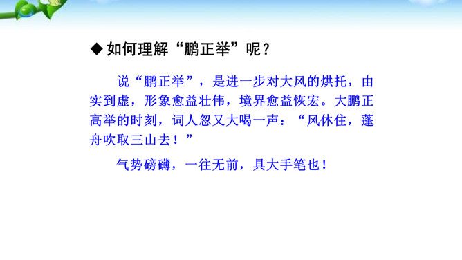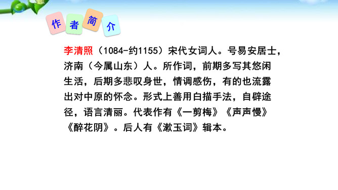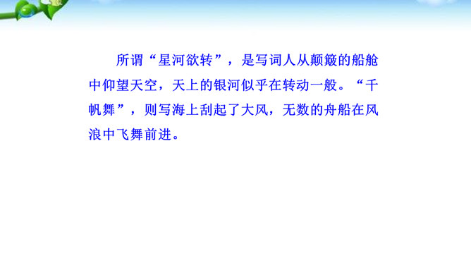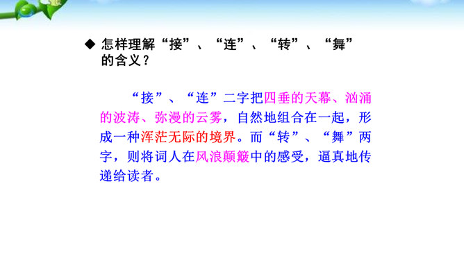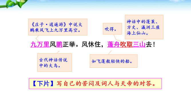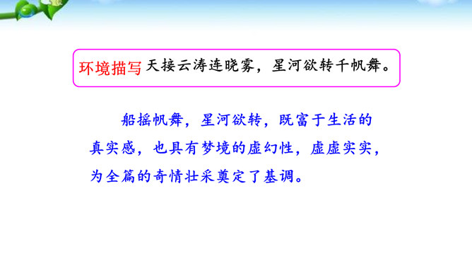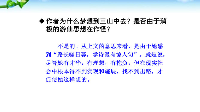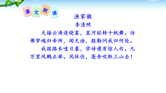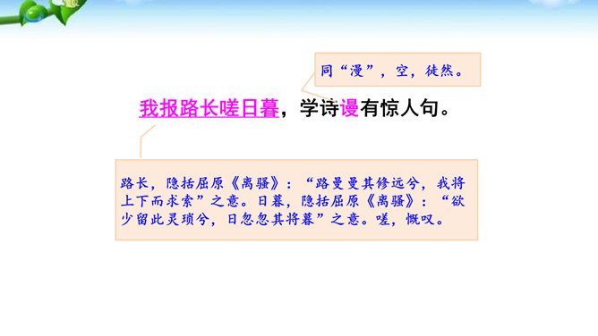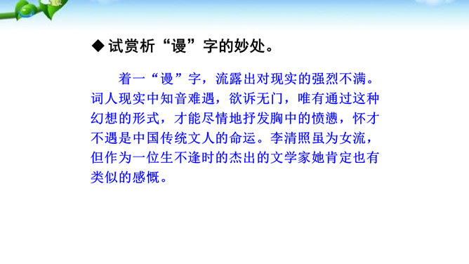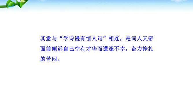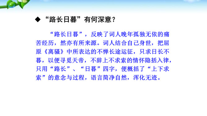 “路长日暮”,反映了词人晚年孤独无依的痛苦经历,然亦有所来源。词人结合自己身世,把屈原《离骚》中所表达的不惮长途运征,只求日长不暮,以便寻觅天帝,不辞上不求索的情怀隐括入律,只用“路长”、“日暮”四字,便概括了“上下求索”的意念与过程,语言简净自然,浑化无迹。其意与“学诗谩有惊人句”相连,是词人天帝面前倾诉自己空有才华而遭逢不幸,奋力挣扎的苦闷。着一“谩”字,流露出对现实的强烈不满。词人现实中知音难遇,欲诉无门,唯有通过这种幻想的形式,才能尽情地抒发胸中的愤懑,怀才不遇是中国传统文人的命运。所属专题:渔家傲ppt。