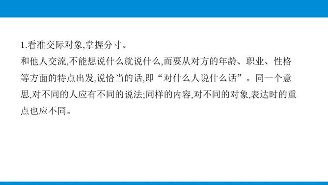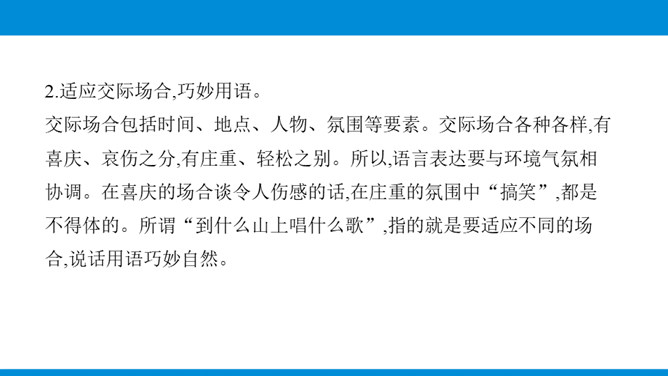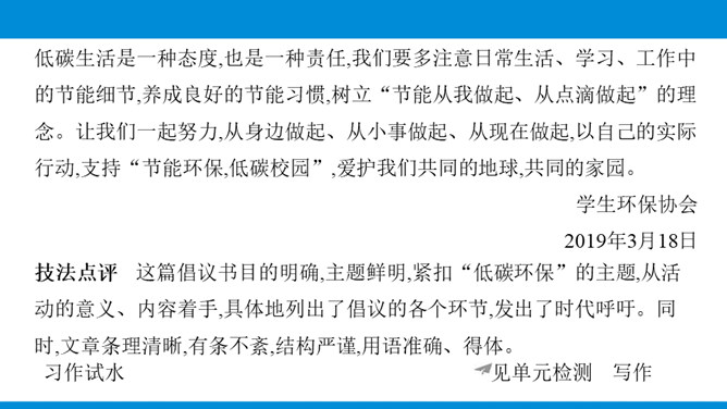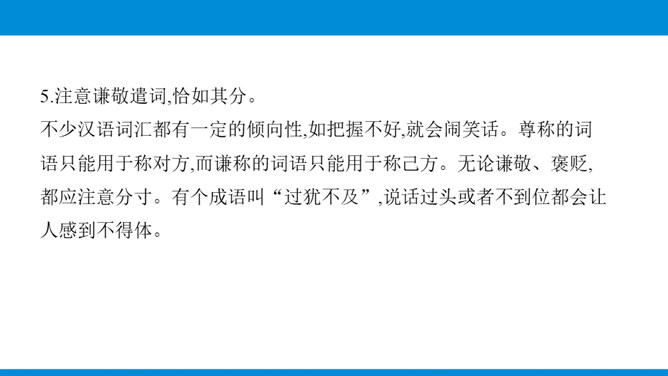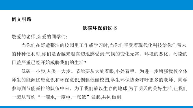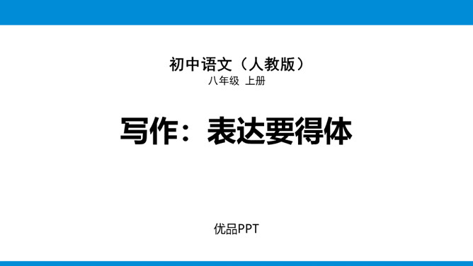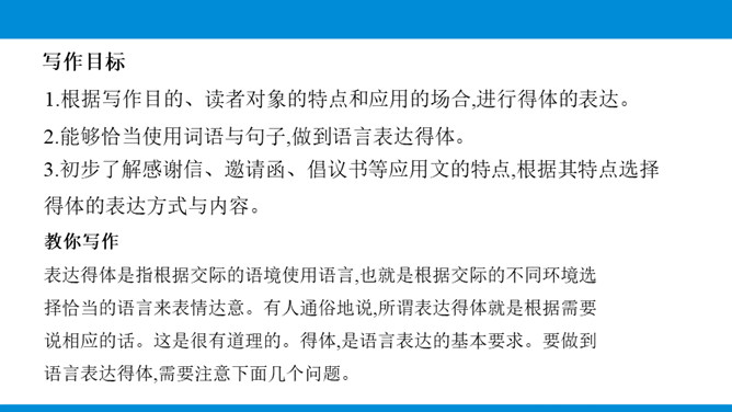 写作目标:1.根据写作目的、读者对象的特点和应用的场合,进行得体的表达。2.能够恰当使用词语与句子,做到语言表达得体。3.初步了解感谢信、邀请函、倡议书等应用文的特点,根据其特点选择得体的表达方式与内容。教你写作:表达得体是指根据交际的语境使用语言,也就是根据交际的不同环境选择恰当的语言来表情达意。有人通俗地说,所谓表达得体就是根据需要说相应的话。这是很有道理的。得体,是语言表达的基本要求。要做到语言表达得体,需要注意下面几个问题。所属专题:表达要得体ppt。
