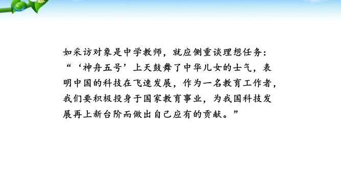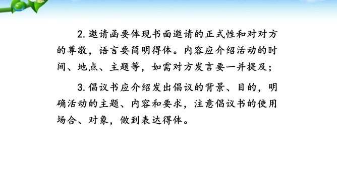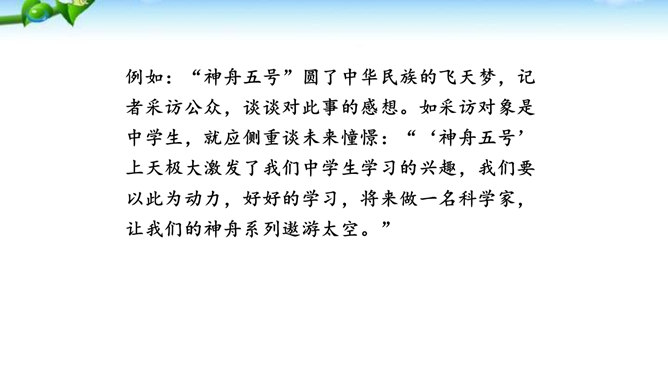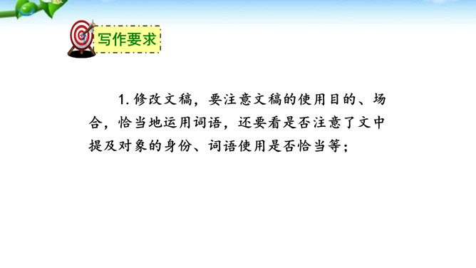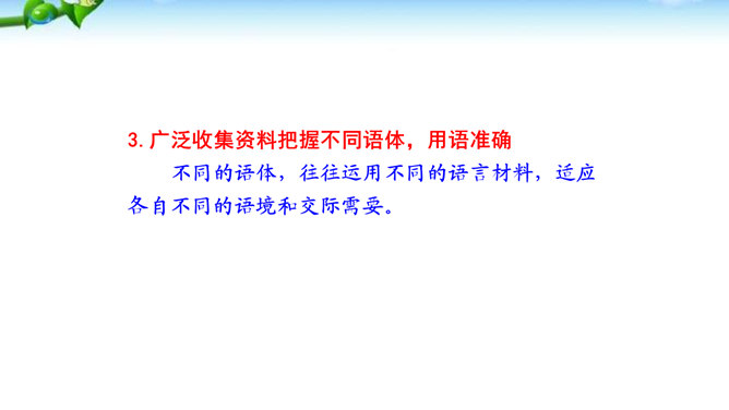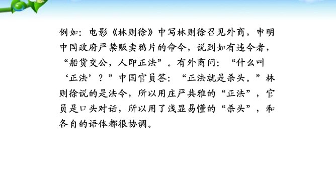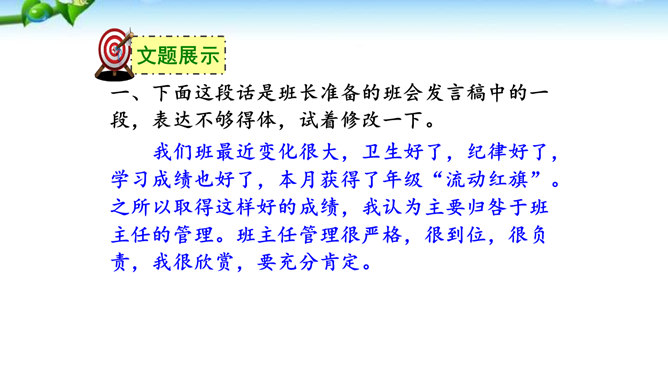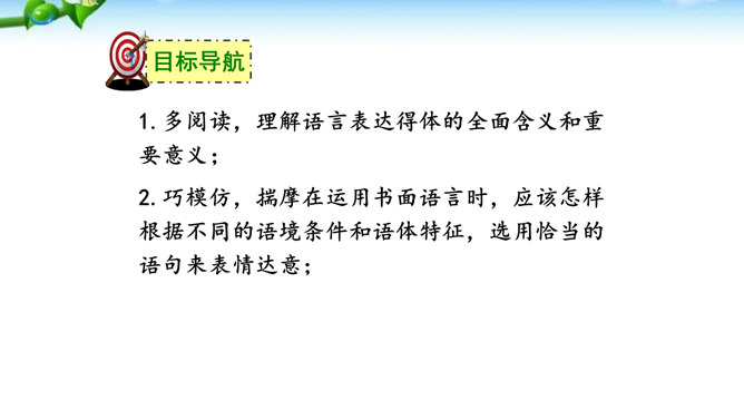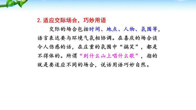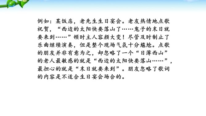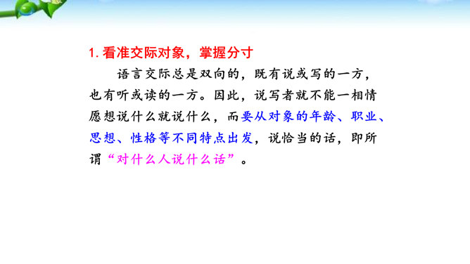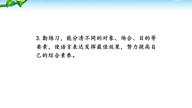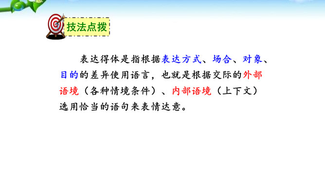 表达得体是指根据表达方式、场合、对象、目的的差异使用语言,也就是根据交际的外部语境(各种情境条件)、内部语境(上下文)选用恰当的语句来表情达意。1.看准交际对象,掌握分寸。语言交际总是双向的,既有说或写的一方,也有听或读的一方。因此,说写者就不能一相情愿想说什么就说什么,而要从对象的年龄、职业、思想、性格等不同特点出发,说恰当的话,即所谓“对什么人说什么话”。2.适应交际场合,巧妙用语。交际的场合包括时间、地点、人物、氛围等,语言表达要与环境气氛相协调。所属专题:表达要得体ppt。