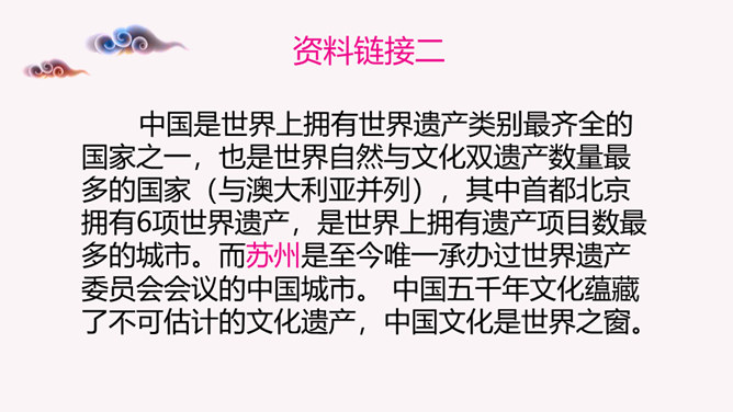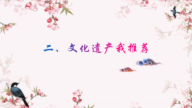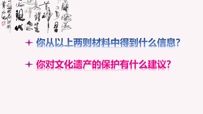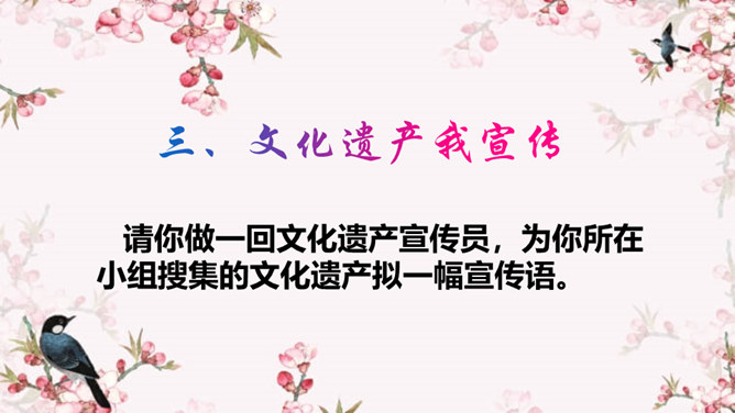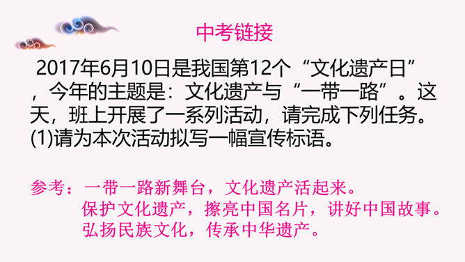 历史遗留下来的名胜古迹、民间技艺、艺术形式、民俗活动、节庆礼仪等都彰显出独特的人文价值,凝聚着共同的历史记忆,是宝贵的文化遗产。文化遗产包括物质文化遗产和非物质文化遗产。国务院规定自2006年起,将每年6月的第三个星期六定为我国的“文化遗产日”。 以小组分工合作的形式查阅资料,讨论并形成一定的文字资料,形式不限。请你做一回文化遗产宣传员,为你所在小组搜集的文化遗产拟一幅宣传语。你以“我与文化遗产”为话题,自拟题目,写一篇作文,谈谈你对文化遗产保护的认识和思考。所属专题:身边的文化遗产ppt。