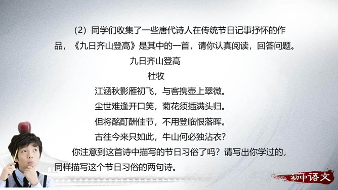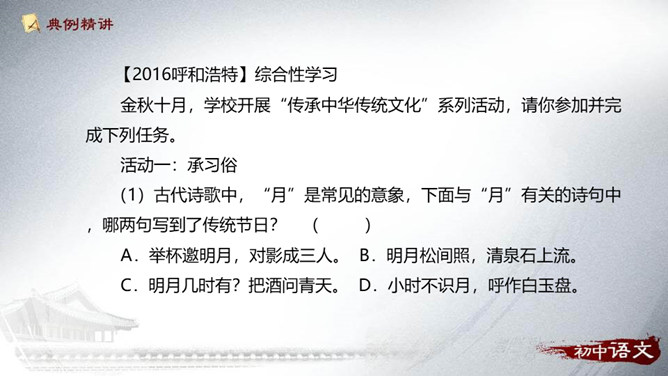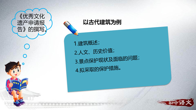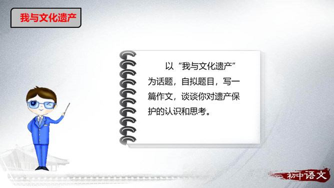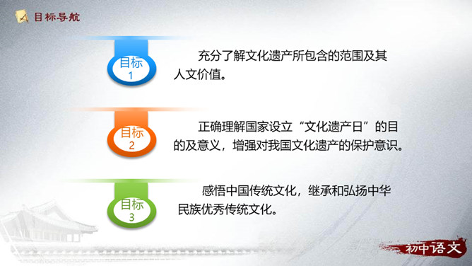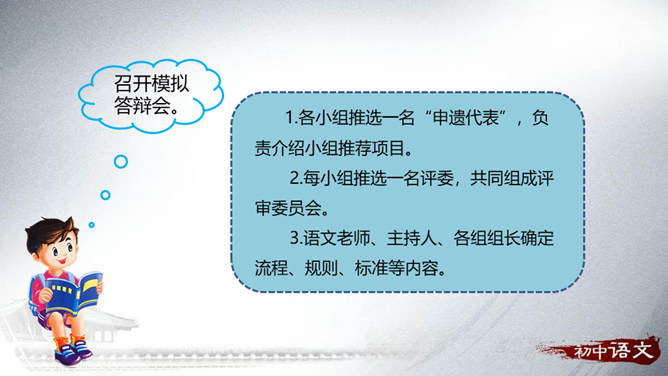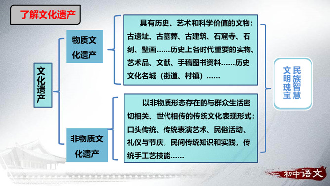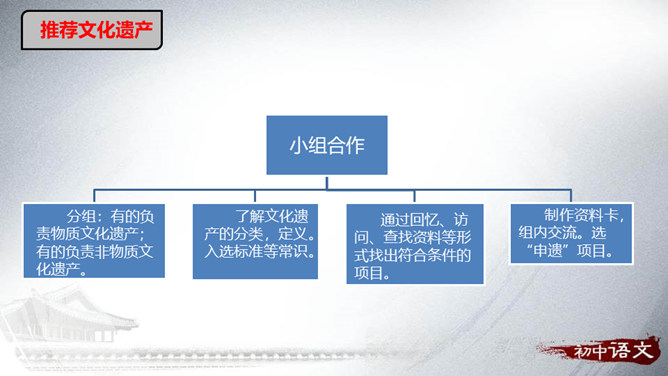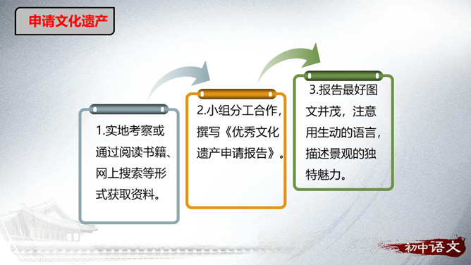 充分了解文化遗产所包含的范围及其人文价值。正确理解国家设立“文化遗产日”的目的及意义,增强对我国文化遗产的保护意识。感悟中国传统文化,继承和弘扬中华民族优秀传统文化。分组:有的负责物质文化遗产;有的负责非物质文化遗产。了解文化遗产的分类,定义。入选标准等常识。通过回忆、访问、查找资料等形式找出符合条件的项目。制作资料卡,组内交流。选“申遗”项目。实地考察或通过阅读书籍、网上搜索等形式获取资料。小组分工合作,撰写《优秀文化遗产申请报告》。报告最好图文并茂,注意用生动的语言,描述景观的独特魅力。所属专题:身边的文化遗产ppt。