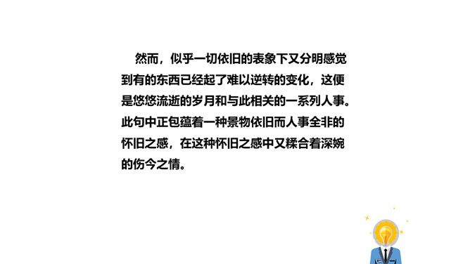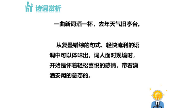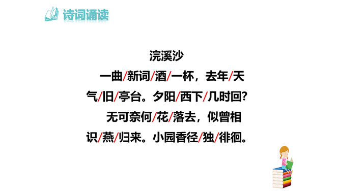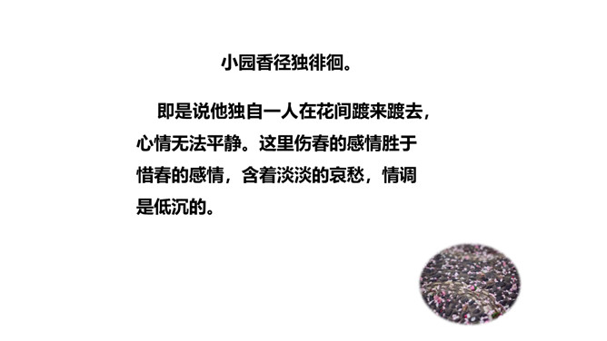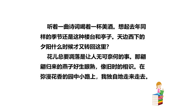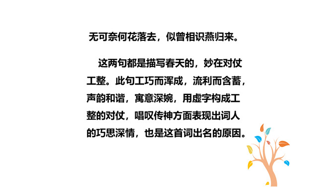 天边西下的夕阳什么时候才又转回这里?花儿总要凋落是让人无可奈何的事。那翩翩归来的燕子好生眼熟,像旧时的相识。在弥漫花香的园中小路上,我独自地走来走去。从复叠错综的句式、轻快流利的语调中可以体味出,词人面对现境时,开始是怀着轻松喜悦的感情,带着潇洒安闲的意态的。然而,似乎一切依旧的表象下又分明感觉到有的东西已经起了难以逆转的变化,这便是悠悠流逝的岁月和与此相关的一系列人事。此句中正包蕴着一种景物依旧而人事全非的怀旧之感,在这种怀旧之感中又糅合着深婉的伤今之情。所属专题:浣溪沙ppt。