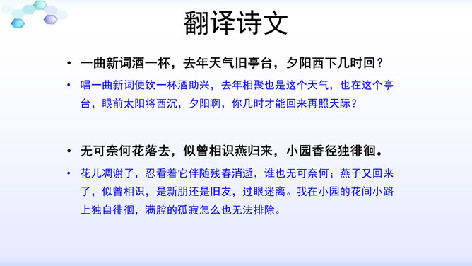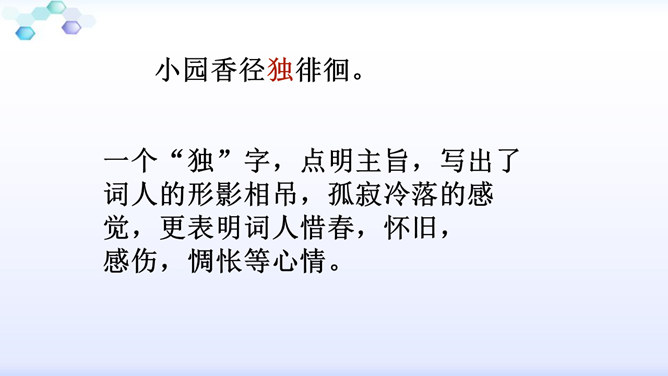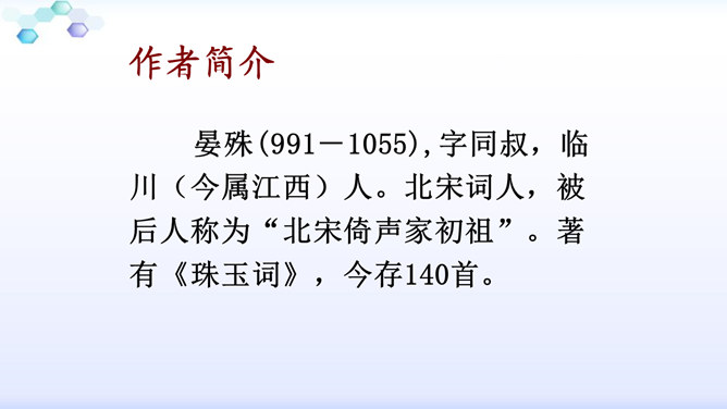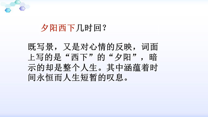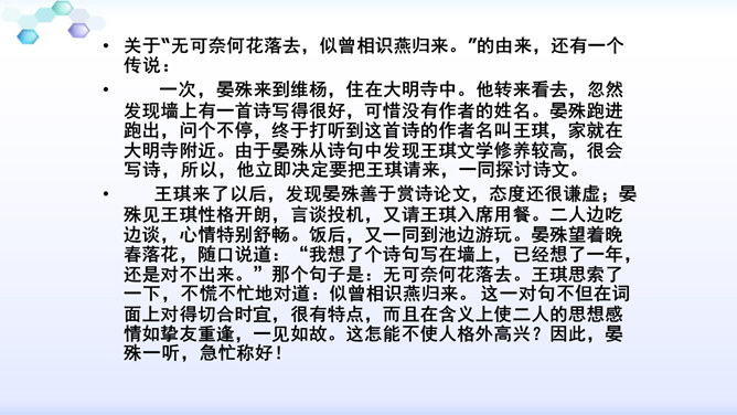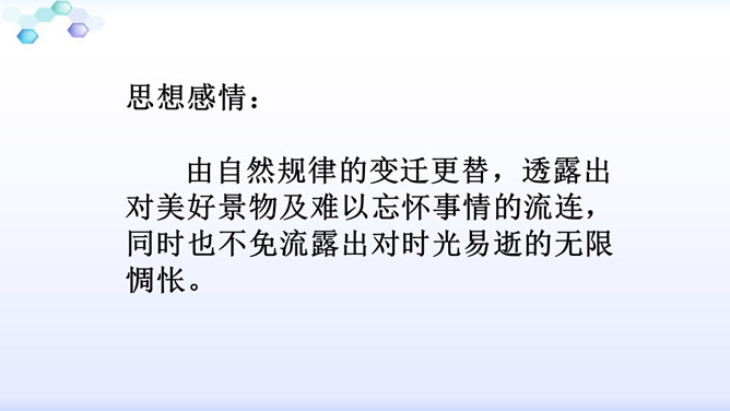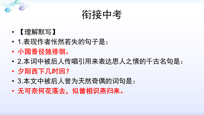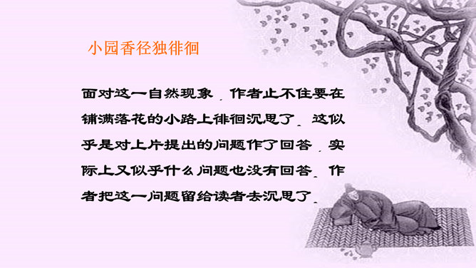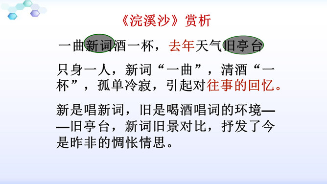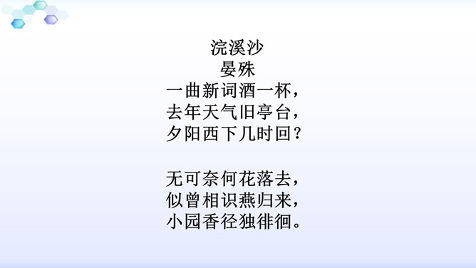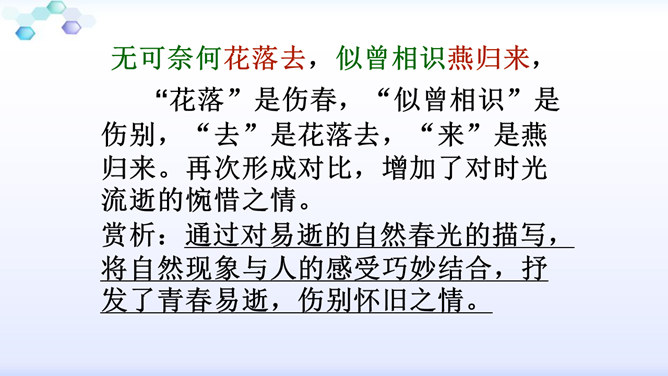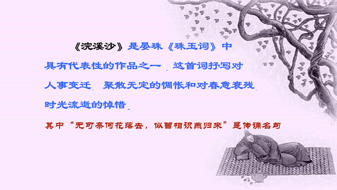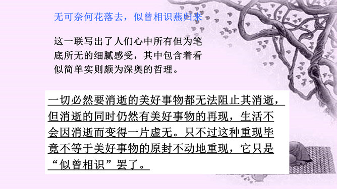 “花落”是伤春,“似曾相识”是伤别,“去”是花落去,“来”是燕归来。再次形成对比,增加了对时光流逝的惋惜之情。赏析:通过对易逝的自然春光的描写,将自然现象与人的感受巧妙结合,抒发了青春易逝,伤别怀旧之情。这一联写出了人们心中所有但为笔底所无的细腻感受,其中包含着看似简单实则颇为深奥的哲理。一切必然要消逝的美好事物都无法阻止其消逝,但消逝的同时仍然有美好事物的再现,生活不会因消逝而变得一片虚无。只不过这种重现毕竟不等于美好事物的原封不动地重现,它只是“似曾相识”罢了。所属专题:浣溪沙ppt。