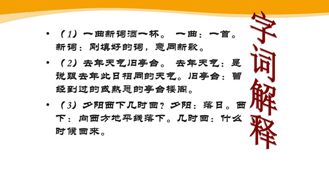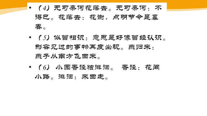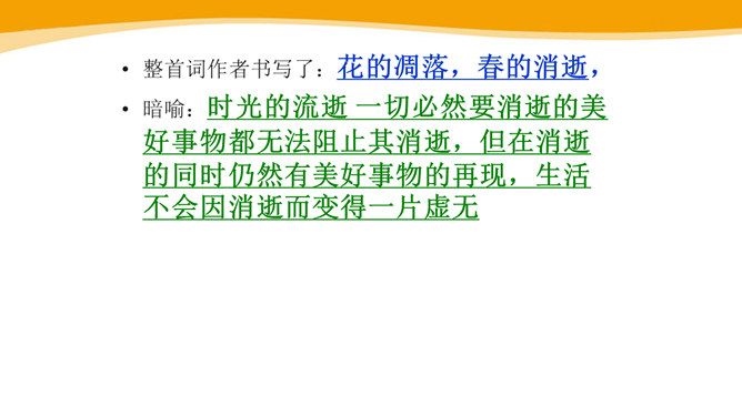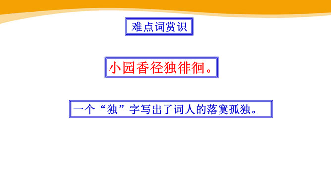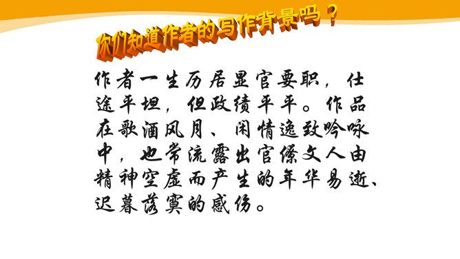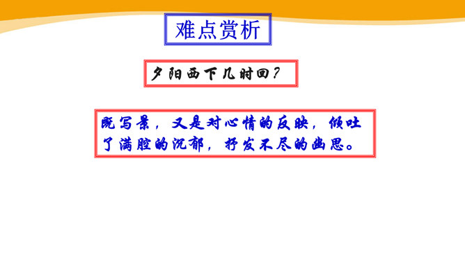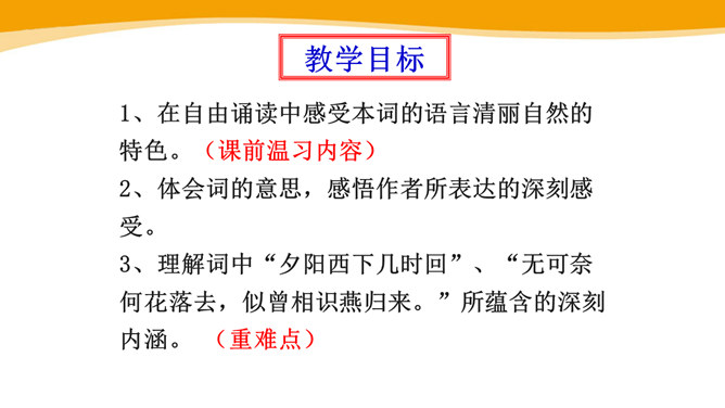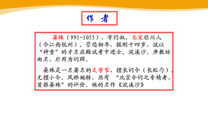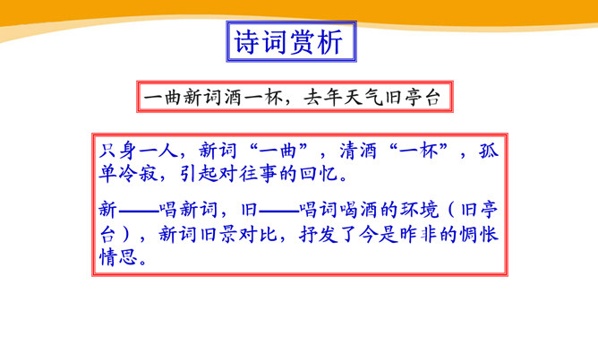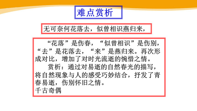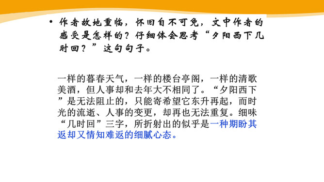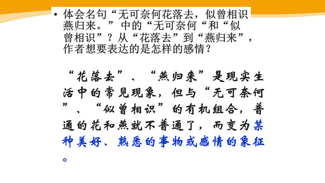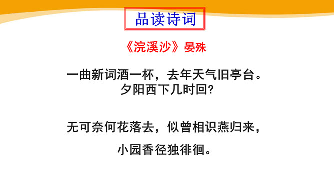 作者故地重临,怀旧自不可免,文中作者的感受是怎样的?仔细体会思考“夕阳西下几时回?”这句句子。一样的暮春天气,一样的楼台亭阁,一样的清歌美酒,但人事却和去年大不相同了。“夕阳西下”是无法阻止的,只能寄希望它东升再起,而时光的流逝、人事的变更,却再也无法重复。细味“几时回”三字,所折射出的似乎是一种期盼其返却又情知难返的细腻心态。 体会名句“无可奈何花落去,似曾相识燕归来。” 中的“无可奈何“和“似曾相识”?从“花落去”到“燕归来”,作者想要表达的是怎样的感情?所属专题:浣溪沙ppt。