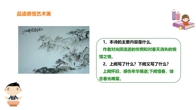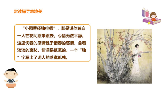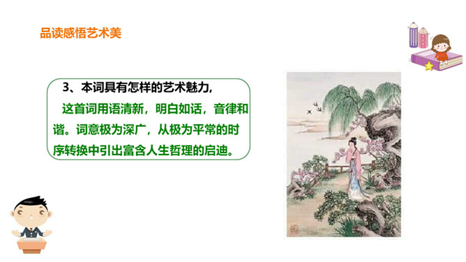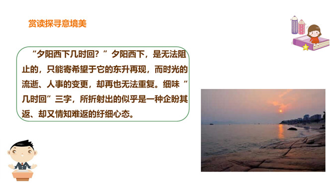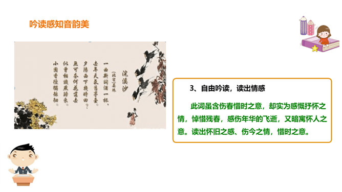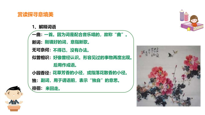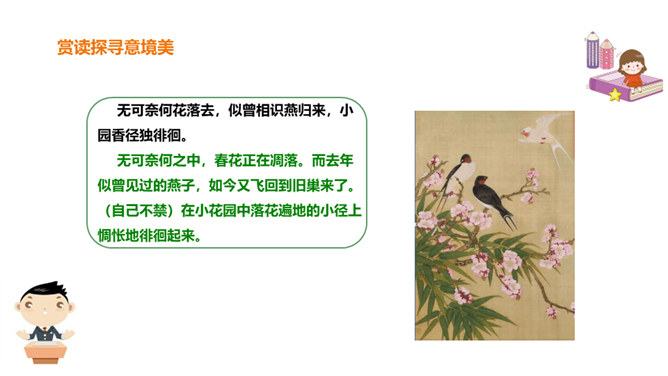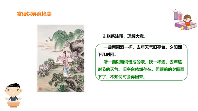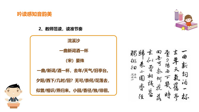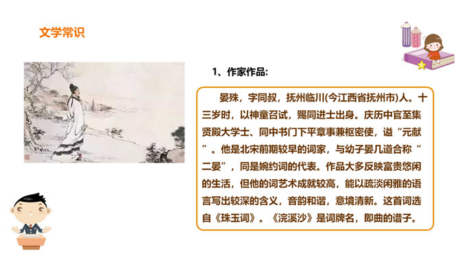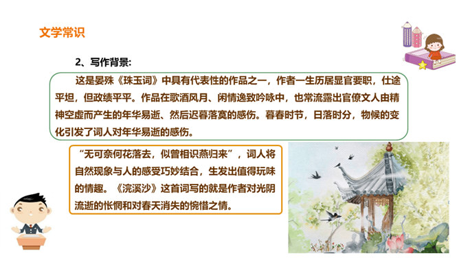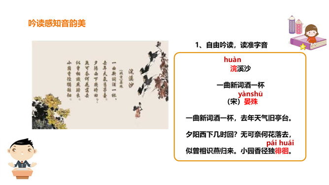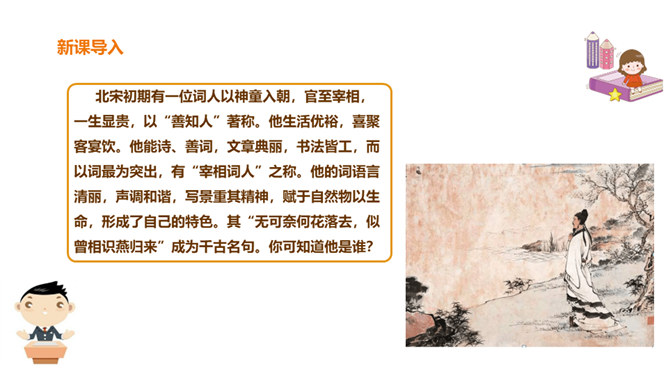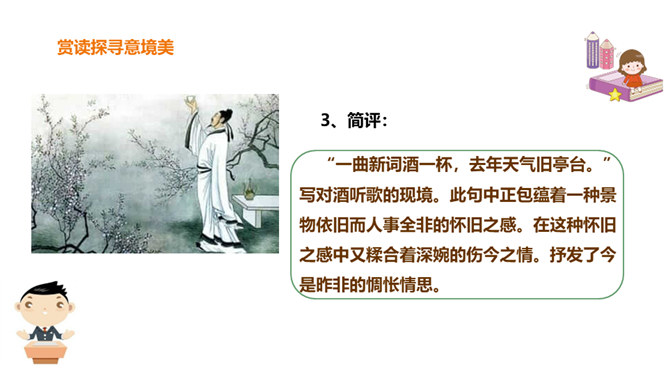 北宋初期有一位词人以神童入朝,官至宰相,一生显贵,以“善知人”著称。他生活优裕,喜聚客宴饮。他能诗、善词,文章典丽,书法皆工,而以词最为突出,有“宰相词人”之称。他的词语言清丽,声调和谐,写景重其精神,赋于自然物以生命,形成了自己的特色。其“无可奈何花落去,似曾相识燕归来”成为千古名句。你可知道他是谁?此词虽含伤春惜时之意,却实为感慨抒怀之情,悼惜残春,感伤年华的飞逝,又暗寓怀人之意。读出怀旧之感、伤今之情,惜时之意。所属专题:浣溪沙ppt。