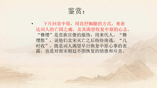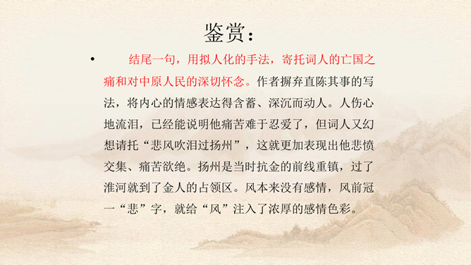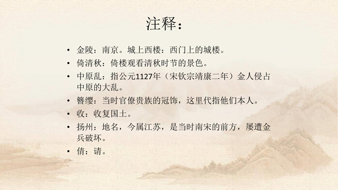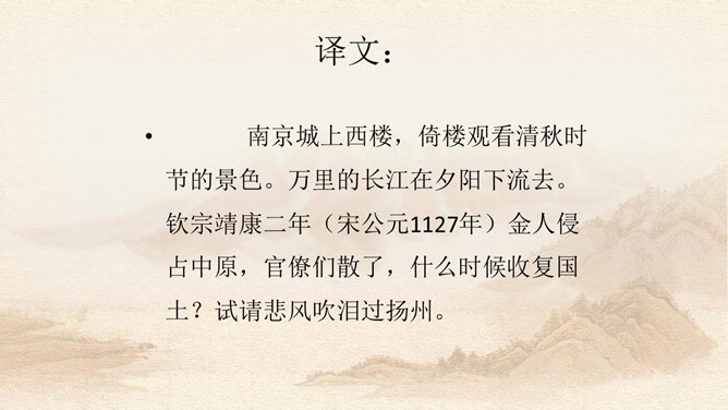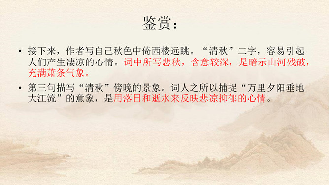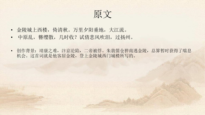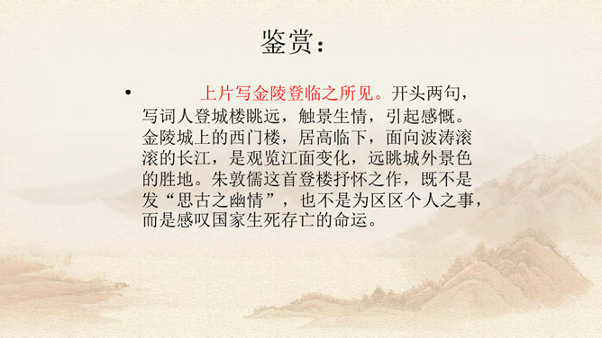 上片写金陵登临之所见。开头两句,写词人登城楼眺远,触景生情,引起感慨。金陵城上的西门楼,居高临下,面向波涛滚滚的长江,是观览江面变化,远眺城外景色的胜地。朱敦儒这首登楼抒怀之作,既不是发“思古之幽情”,也不是为区区个人之事,而是感叹国家生死存亡的命运。接下来,作者写自己秋色中倚西楼远眺。“清秋”二字,容易引起人们产生凄凉的心情。词中所写悲秋,含意较深,是暗示山河残破,充满萧条气象。第三句描写“清秋”傍晚的景象。词人之所以捕捉“万里夕阳垂地大江流”的意象,是用落日和逝水来反映悲凉抑郁的心情。所属专题:相见欢ppt。