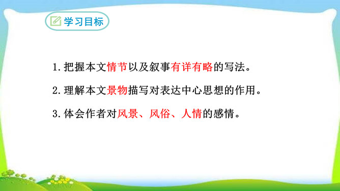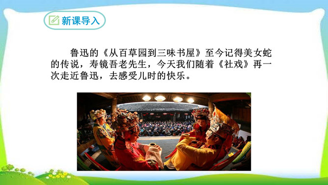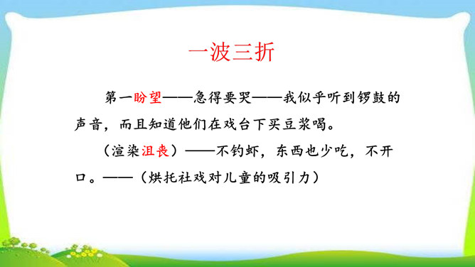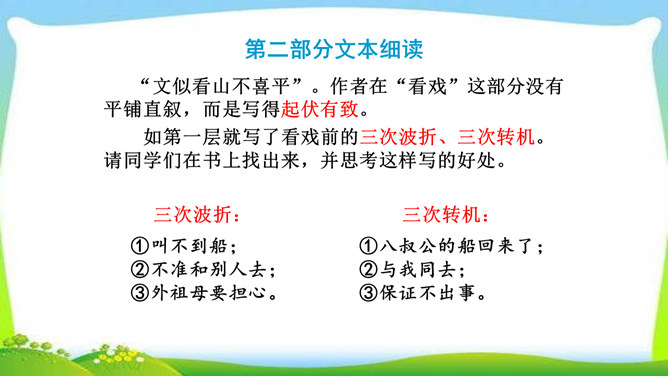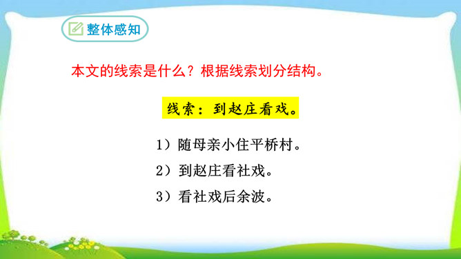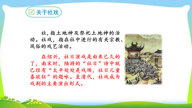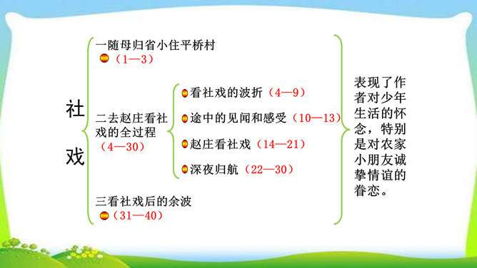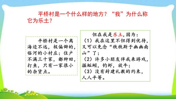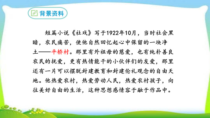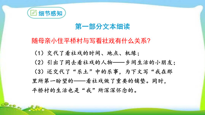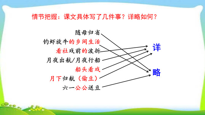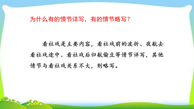 为什么有的情节详写,有的情节略写?看社戏是主要内容,看社戏前的波折、夜航去看社戏途中、看社戏后归航偷豆等情节详写,其他情节与看社戏关系不大,则略写。随母亲小住平桥村与写看社戏有什么关系? (1)交代了看社戏的时间、地点、机缘;(2)引出了同去看社戏的人物——乡间生活的小朋友;(3)还交代了“乐土”中的乐事,为下文写“我在那里所第一盼望的——看社戏做了重要的铺垫。同时,平桥村的生活也是“我”所深深怀念的。平桥村是一个什么样的地方?“我”为什么称它为乐土?所属专题:社戏ppt。