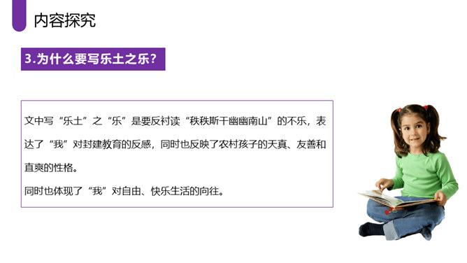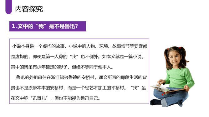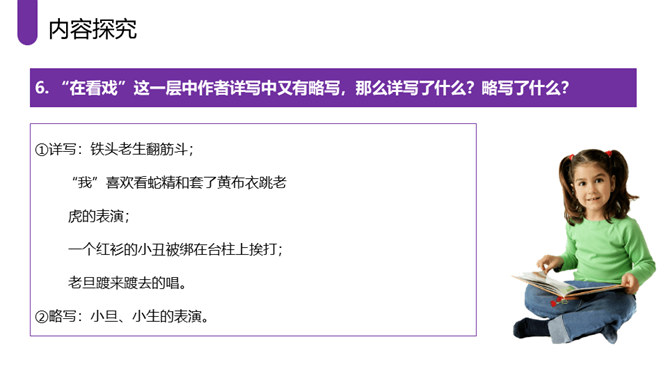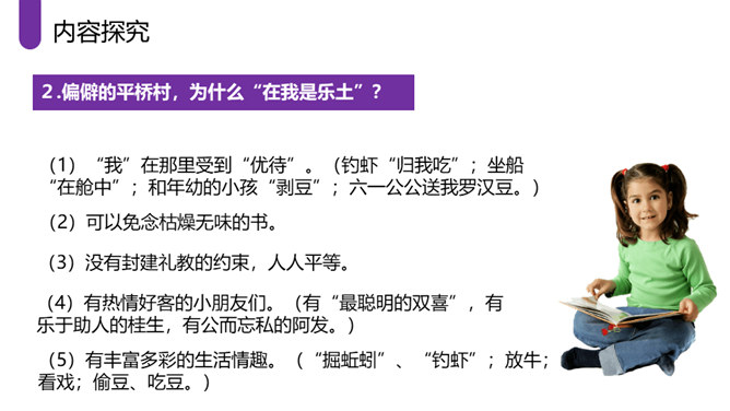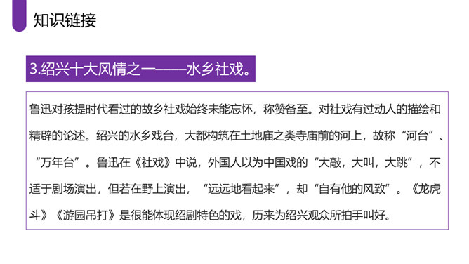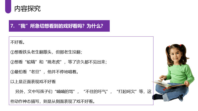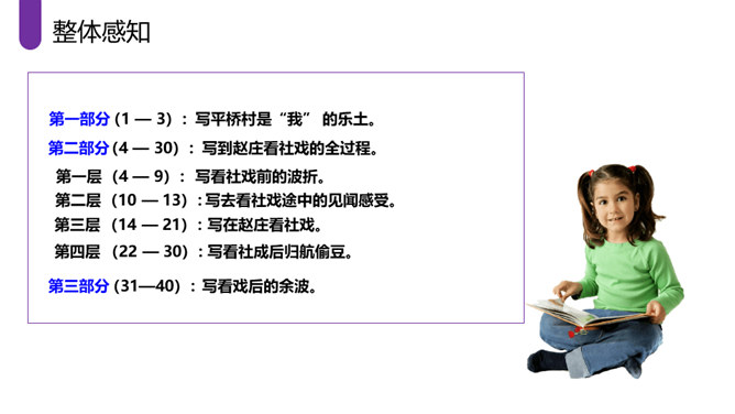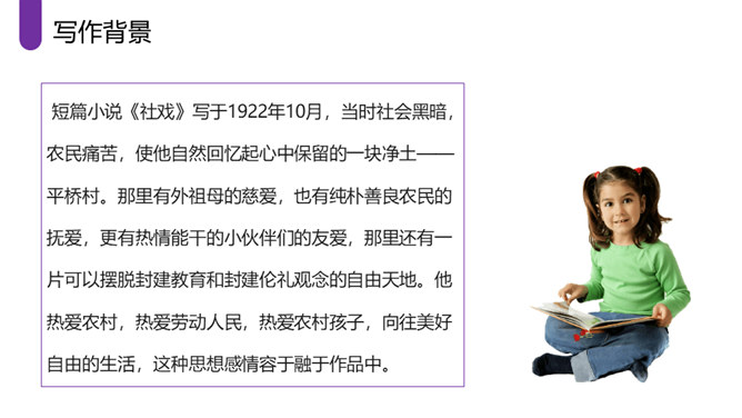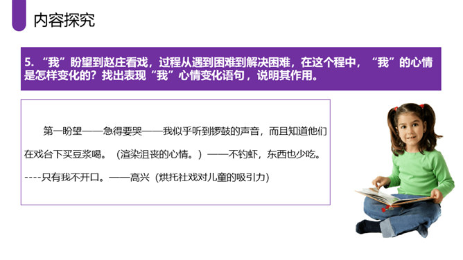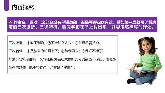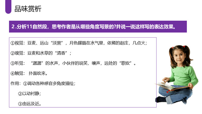 作者采取白描的手法,通过人物的语言、行动等来刻画人物,使人物性格十分突出。作者成功地塑造了一群纯朴可爱的农村孩子形象,他们聪明活泼,胆大心细,热情友爱,其中最突出的就是双喜。他聪明,能干,善解人意,富有同情心,而且反应灵敏,考虑周到,办事果断,充满自信,又有组织才能和号召力,是孩子们的领袖。对六一公公的描写,着墨很少,但仅有的几笔勾勒,运用语言、动作描写极其准确,表现了他宽厚、纯朴、好客、热情的特点。作者以写意的手法,略略几笔便把江南水乡美丽如画的景色呈现在读者的面前,使你仿佛也看到那里美丽的景色。所属专题:社戏ppt。