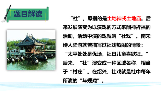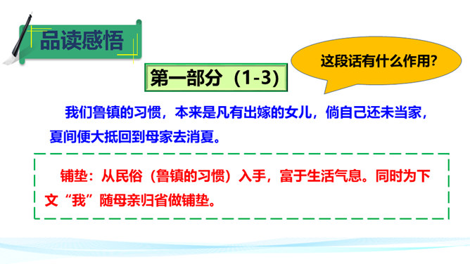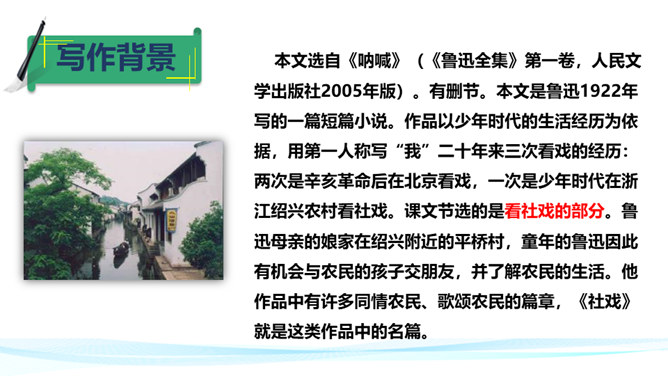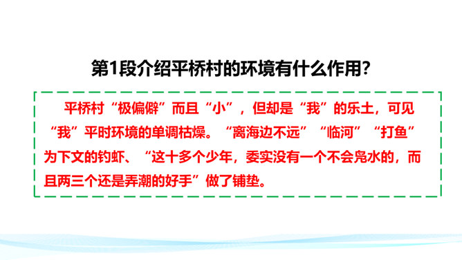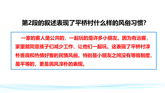 平桥村“极偏僻”而且“小”,但却是“我”的乐土,可见“我”平时环境的单调枯燥。“离海边不远”“临河”“打鱼”为下文的钓虾、“这十多个少年,委实没有一个不会凫水的,而且两三个还是弄潮的好手”做了铺垫。第2段的叙述表现了平桥村什么样的风俗习惯?一家的客人是公共的,一起玩的是许多小朋友。因为有远客,家里就同意孩子们减少工作,让他们一起玩。这表现了平桥村淳朴善良和热情好客的民情风俗。特别是小朋友之间没有等级制度,是平等的,更是民风淳朴的表现。所属专题:社戏ppt。