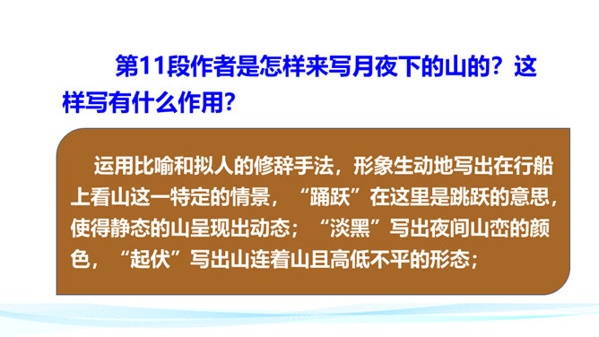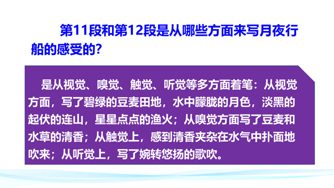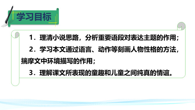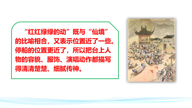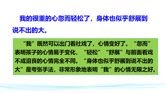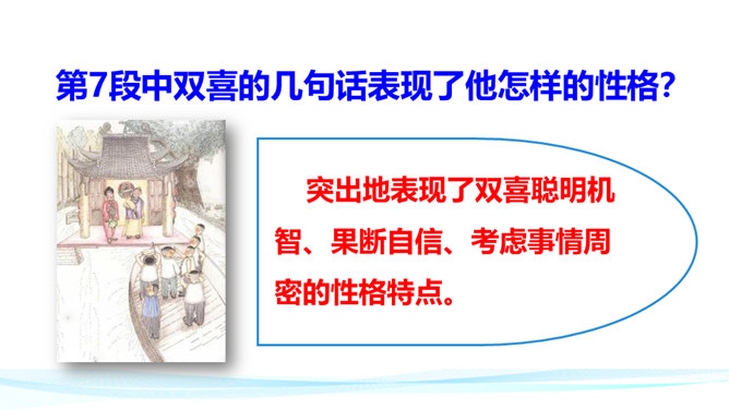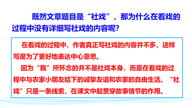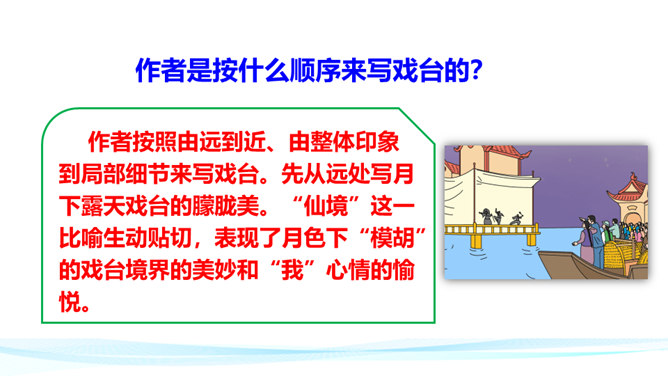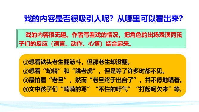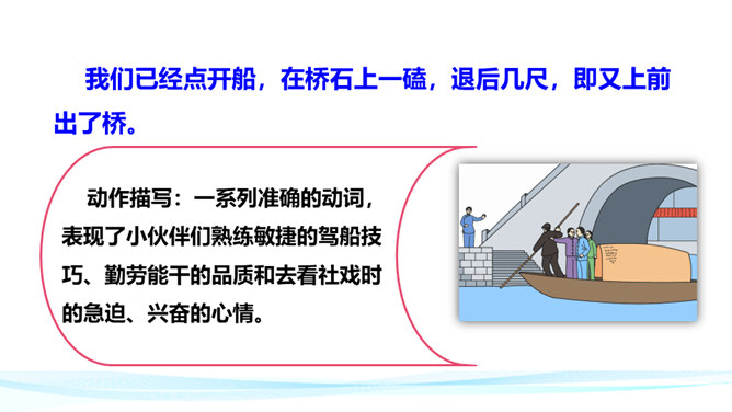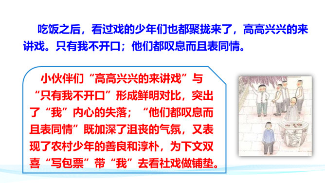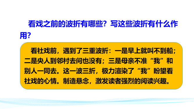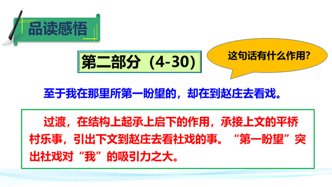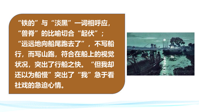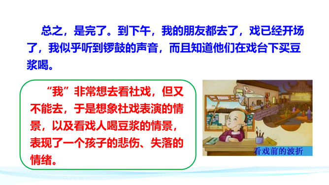 1.理清小说思路,分析重要语段对表达主题的作用;2.学习本文通过语言、动作等刻画人物性格的方法,揣摩文中环境描写的作用;3.理解课文所表现的童趣和儿童之间纯真的情谊。过渡,在结构上起承上启下的作用,承接上文的平桥村乐事,引出下文到赵庄去看社戏的事。“第一盼望”突出社戏对“我”的吸引力之大。“我”非常想去看社戏,但又不能去,于是想象社戏表演的情景,以及看戏人喝豆浆的情景,表现了一个孩子的悲伤、失落的情绪。小伙伴们“高高兴兴的来讲戏”与“只有我不开口”形成鲜明对比,突出了“我”内心的失落。所属专题:社戏ppt。