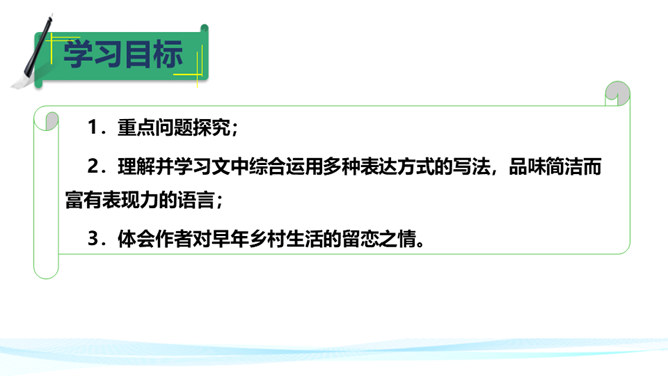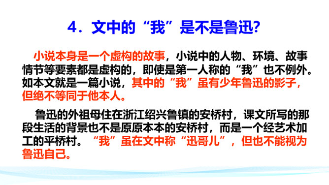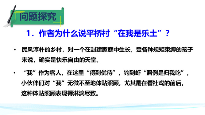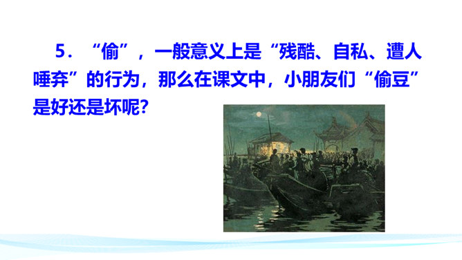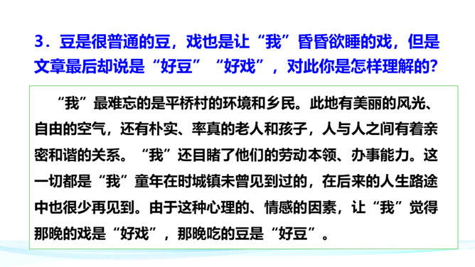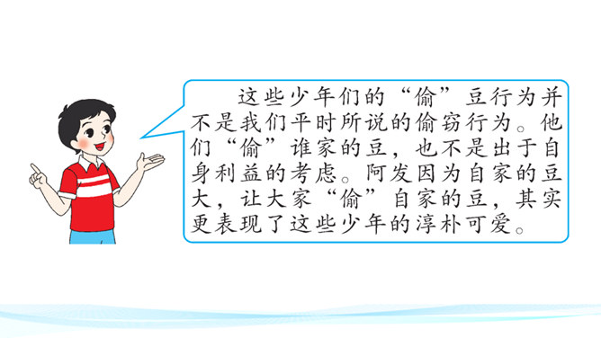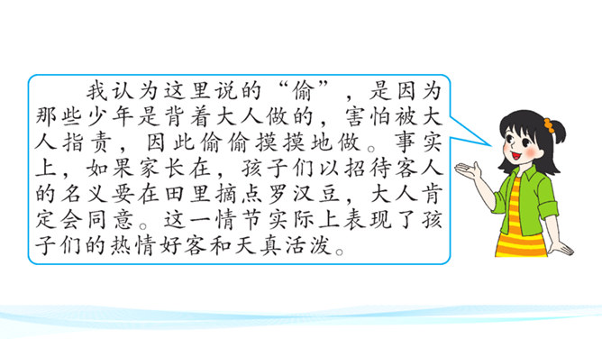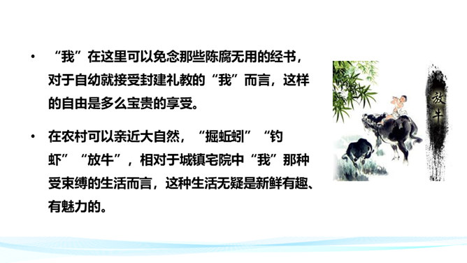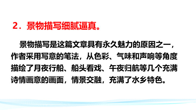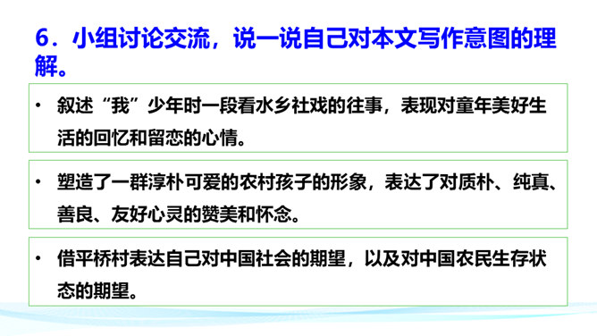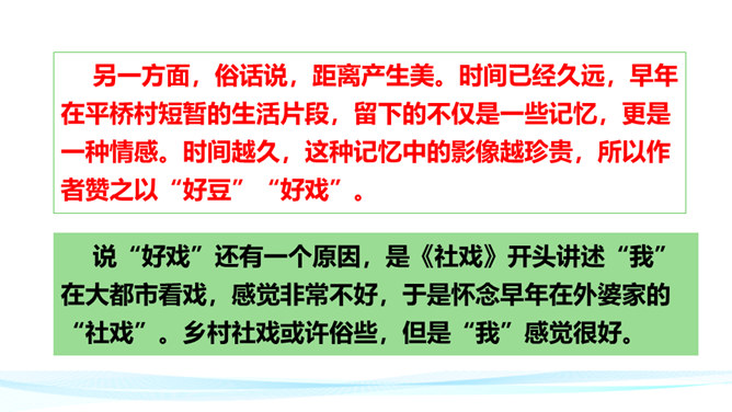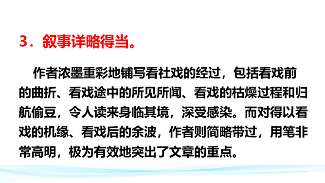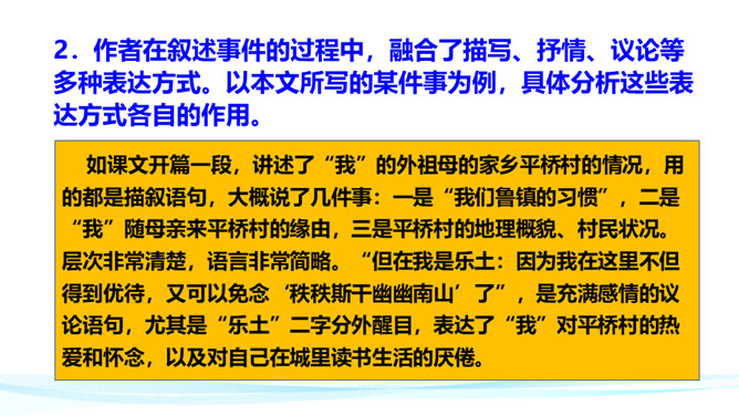 作者在叙述事件的过程中,融合了描写、抒情、议论等多种表达方式。以本文所写的某件事为例,具体分析这些表达方式各自的作用。 如课文开篇一段,讲述了“我”的外祖母的家乡平桥村的情况,用的都是描叙语句,大概说了几件事:一是“我们鲁镇的习惯”,二是“我”随母亲来平桥村的缘由,三是平桥村的地理概貌、村民状况。层次非常清楚,语言非常简略。“但在我是乐土:因为我在这里不但得到优待,又可以免念‘秩秩斯干幽幽南山’了”,是充满感情的议论语句,尤其是“乐土”二字分外醒目。所属专题:社戏ppt。