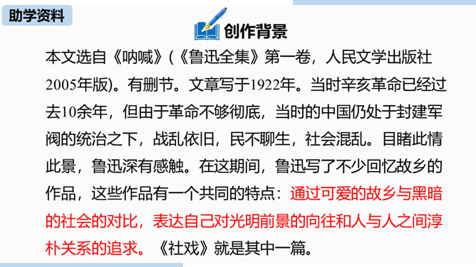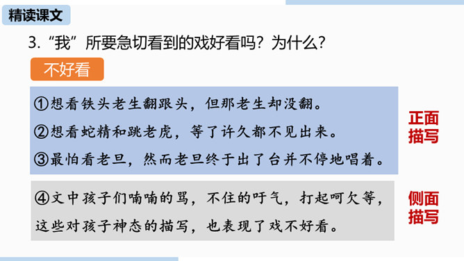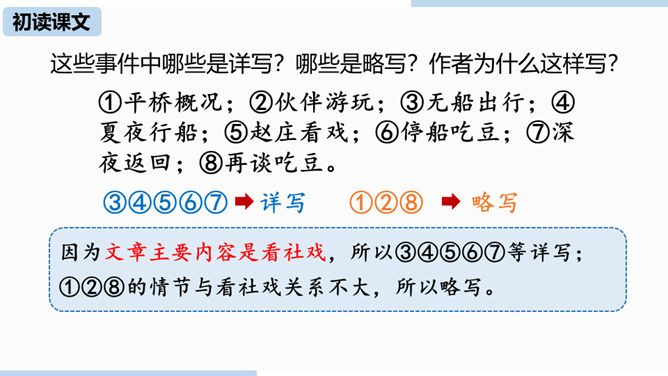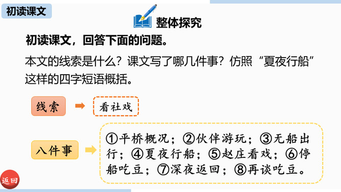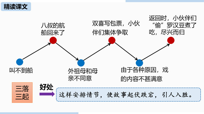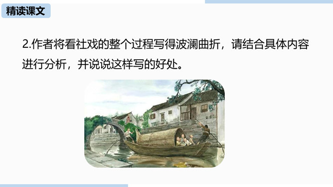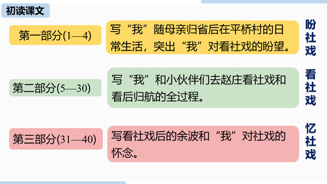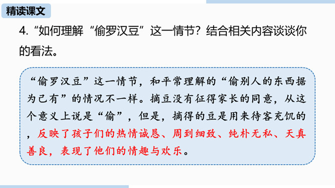 第一部分(1—4)写“我”随母亲归省后在平桥村的日常生活,突出“我”对看社戏的盼望。第二部分(5—30)写“我”和小伙伴们去赵庄看社戏和看后归航的全过程。第三部分(31—40)写看社戏后的余波和“我”对社戏的怀念。.“如何理解“偷罗汉豆”这一情节?结合相关内容谈谈你的看法。“偷罗汉豆”这一情节,和平常理解的“偷别人的东西据为己有”的情况不一样。摘豆没有征得家长的同意,从这个意义上说是“偷”,但是,摘得的豆是用来待客充饥的,反映了孩子们的热情诚恳、周到细致、纯朴无私、天真善良,表现了他们的情趣与欢乐。所属专题:社戏ppt。