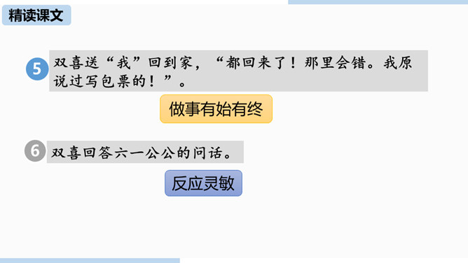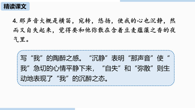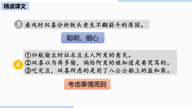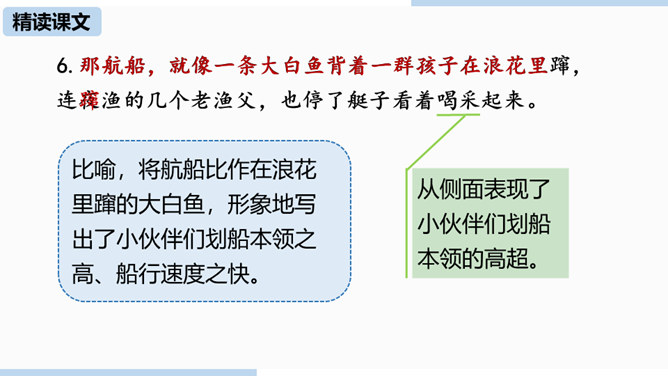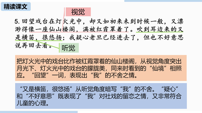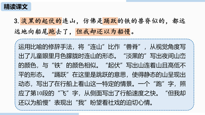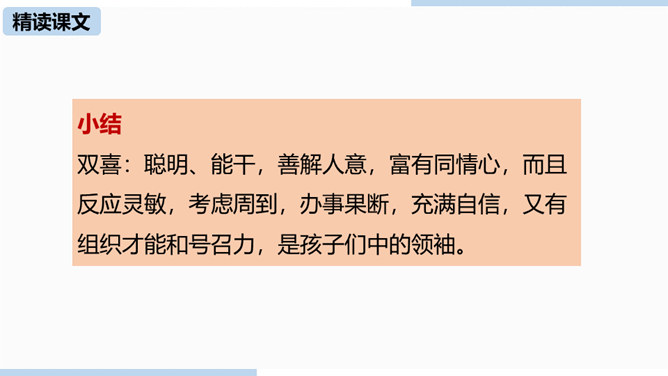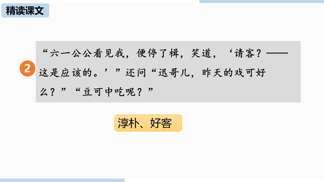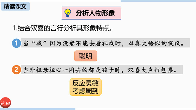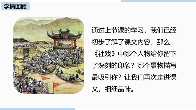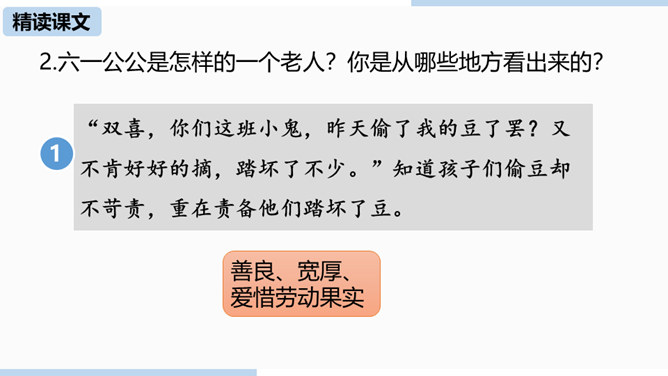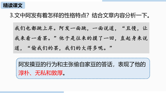 通过上节课的学习,我们已经初步了解了课文内容,那么哪个人物给你留下了深刻的印象?哪个景物描写最吸引你?让我们再次走进课文,细细品味。双喜:聪明、能干,善解人意,富有同情心,而且反应灵敏,考虑周到,办事果断,充满自信,又有组织才能和号召力,是孩子们中的领袖。六一公公是怎样的一个老人?你是从哪些地方看出来的?中阿发有着怎样的性格特点?结合文章内容分析一下。阿发摸豆的行为和主张偷自家豆的答话,表现了他的淳朴、无私和敦厚。从嗅觉、触觉、视觉的角度描写两岸景象和月色,描绘出一幅江南水乡的月夜美景图。所属专题:社戏ppt。